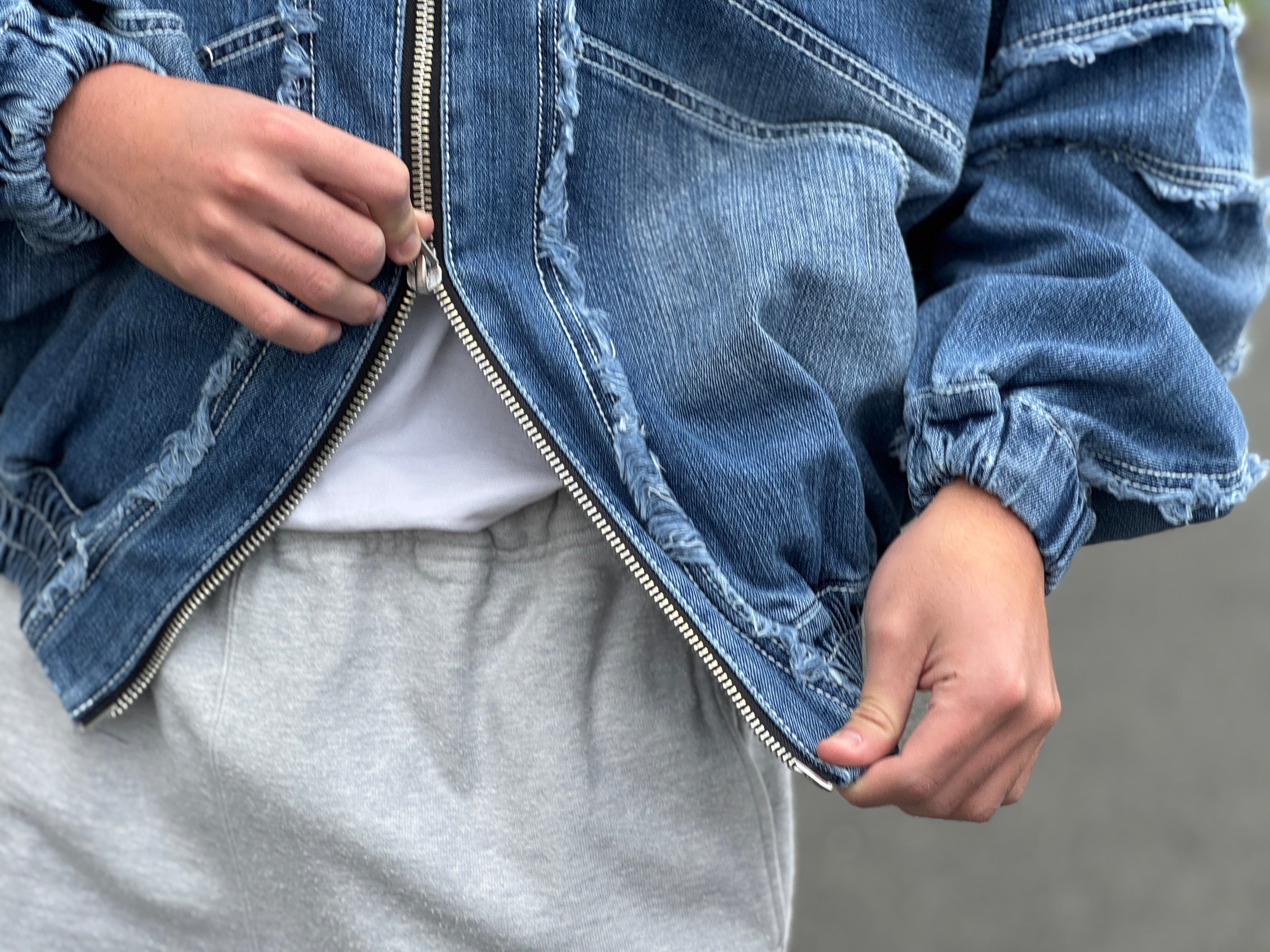 両面ともに切り替えデザイン、カットオフ後にフリンジを施し、バイオウォッシュやブラスト加工により、柔らかく、そしてフェード感も楽しめる生地に仕上がりました。短丈でワイドなボックスシルエット。w-zip仕様。