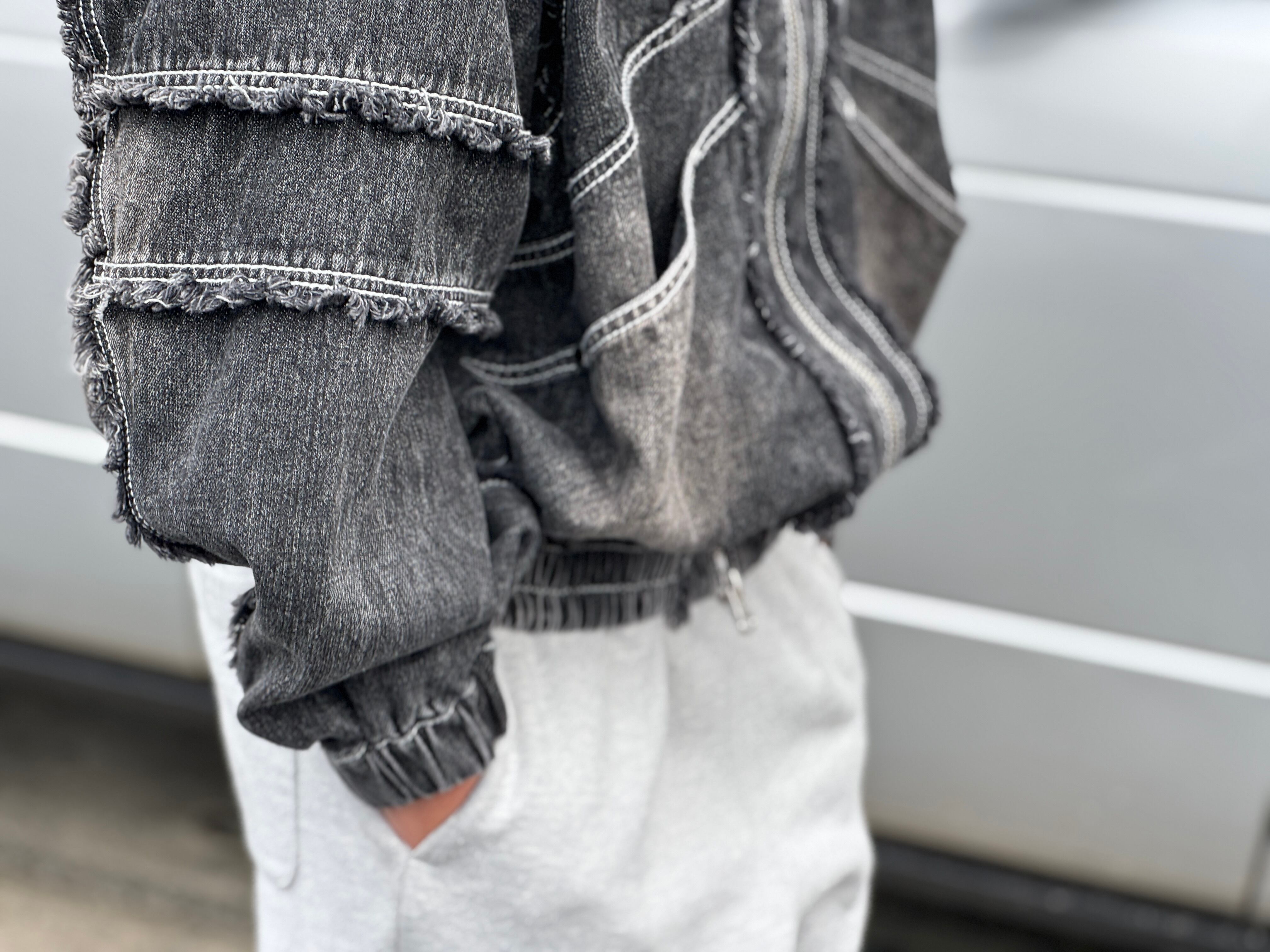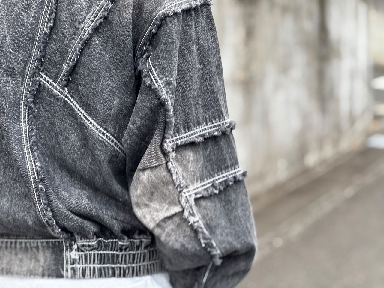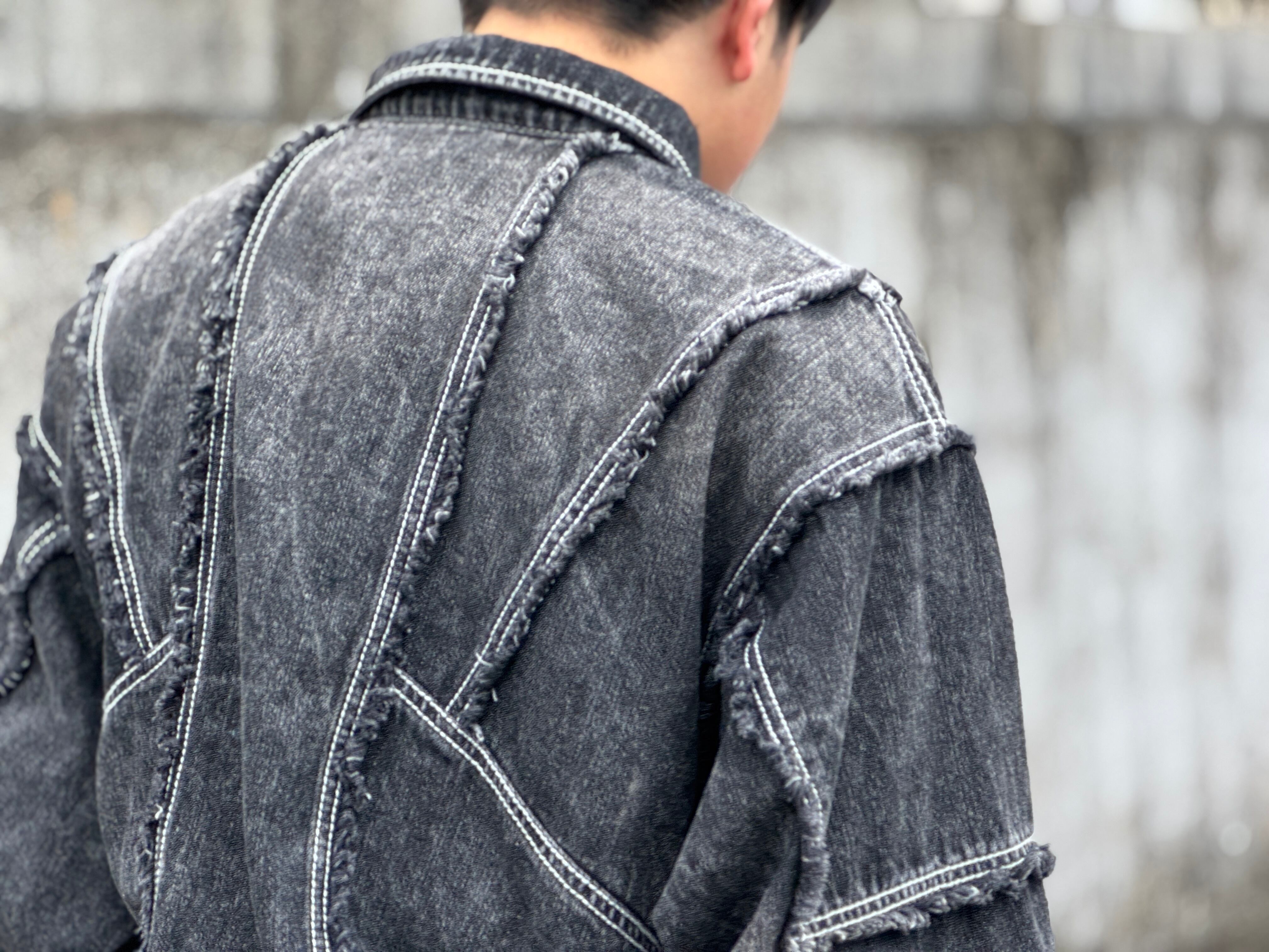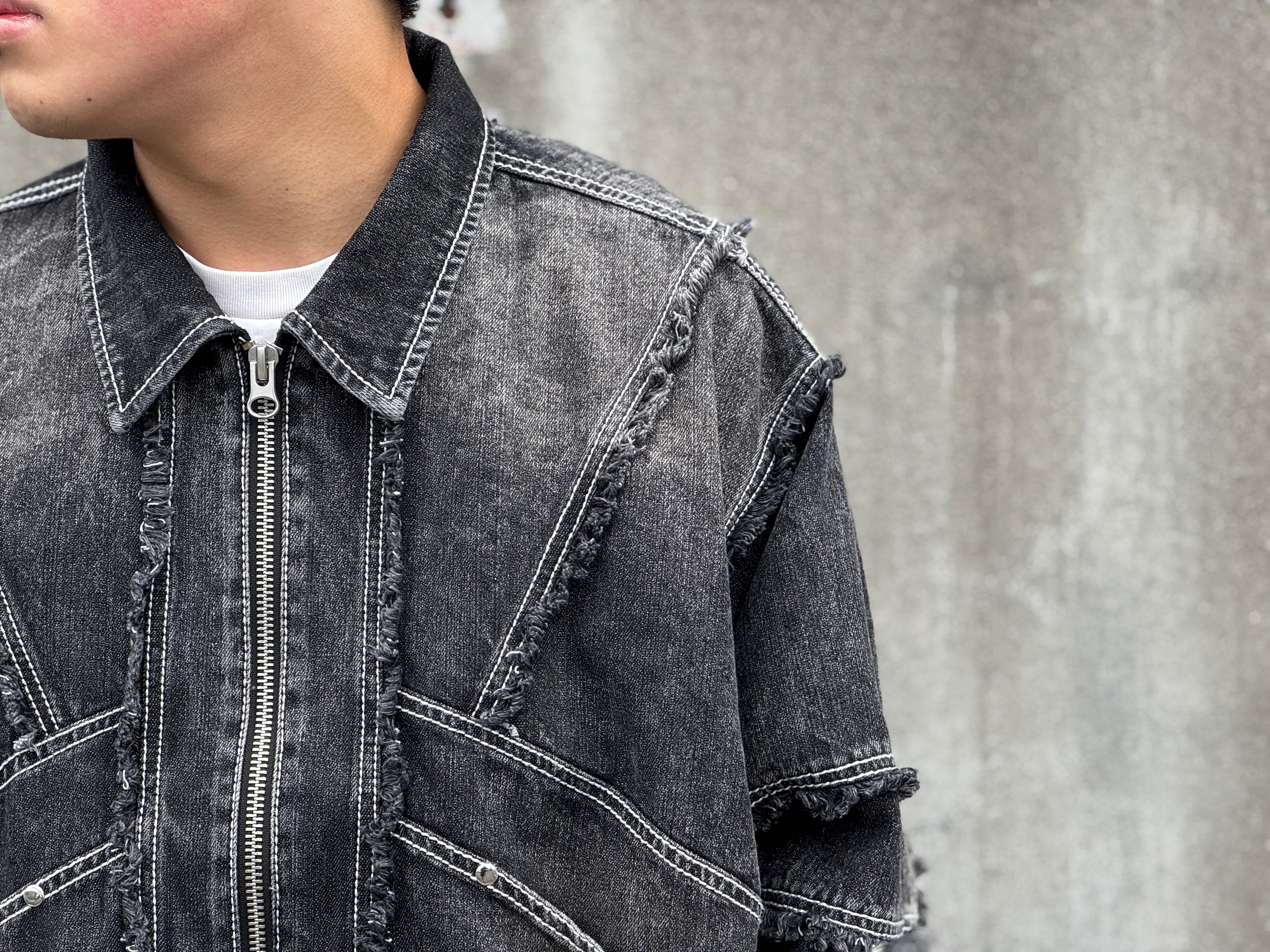 両面ともに切り替えデザイン、カットオフ後にフリンジを施し、バイオウォッシュやブラスト加工により、柔らかく、そしてフェード感も楽しめる生地に仕上がりました。短丈でワイドなボックスシルエット。w-zip仕様。