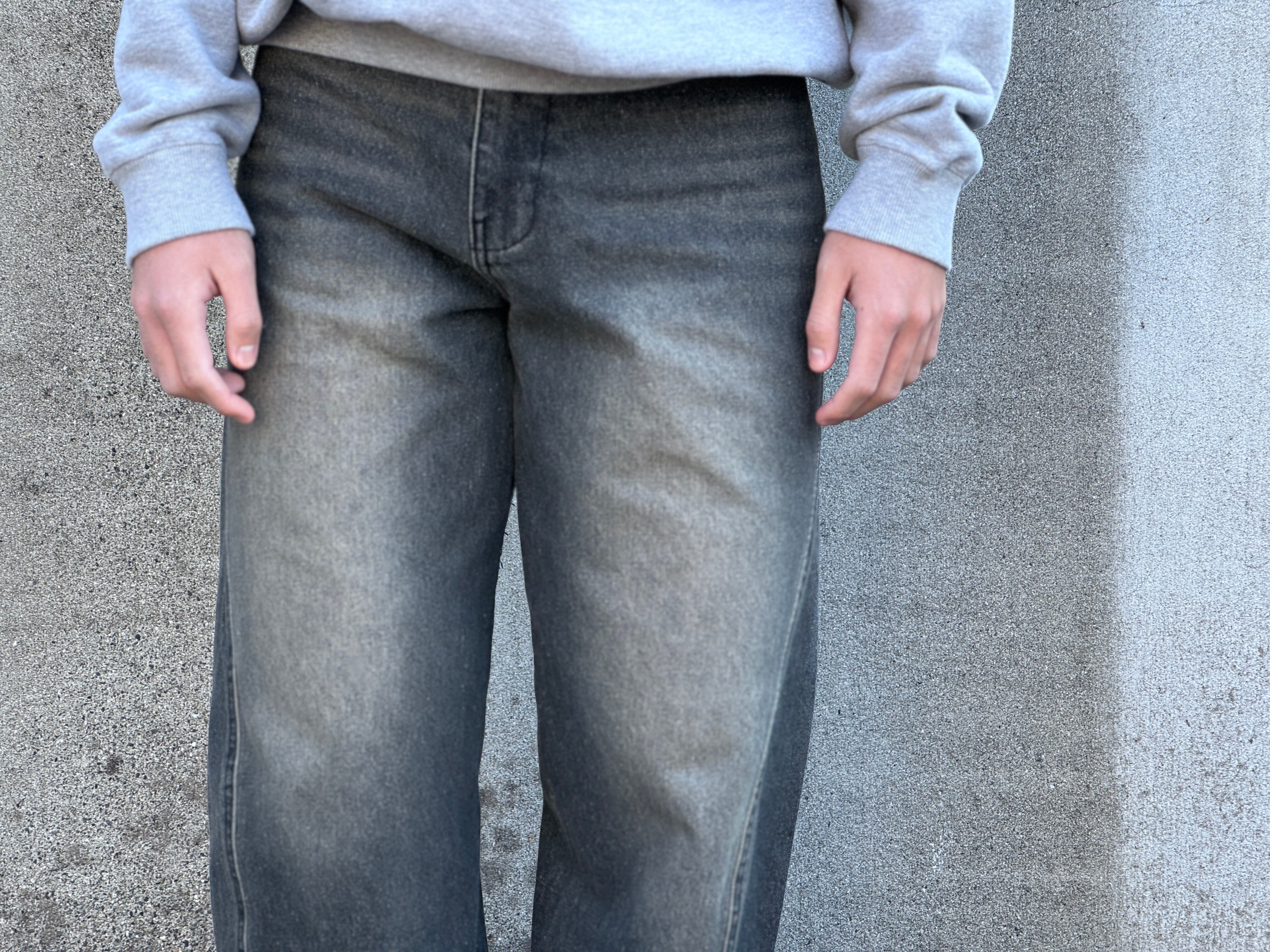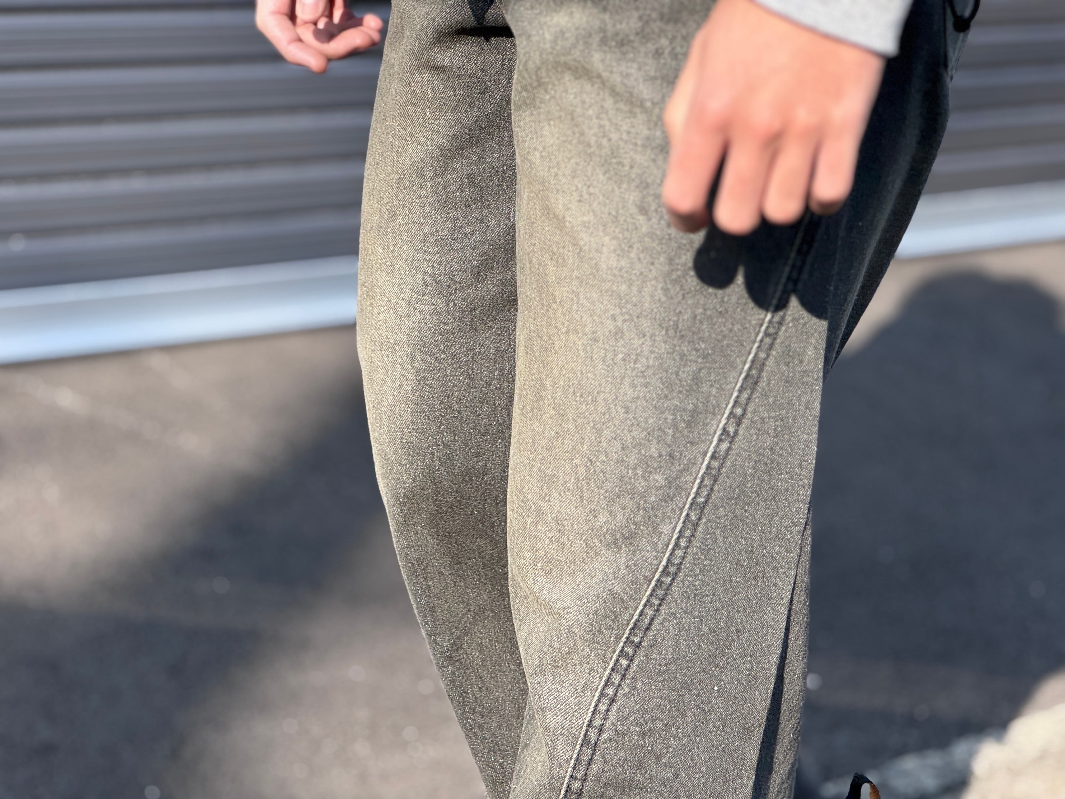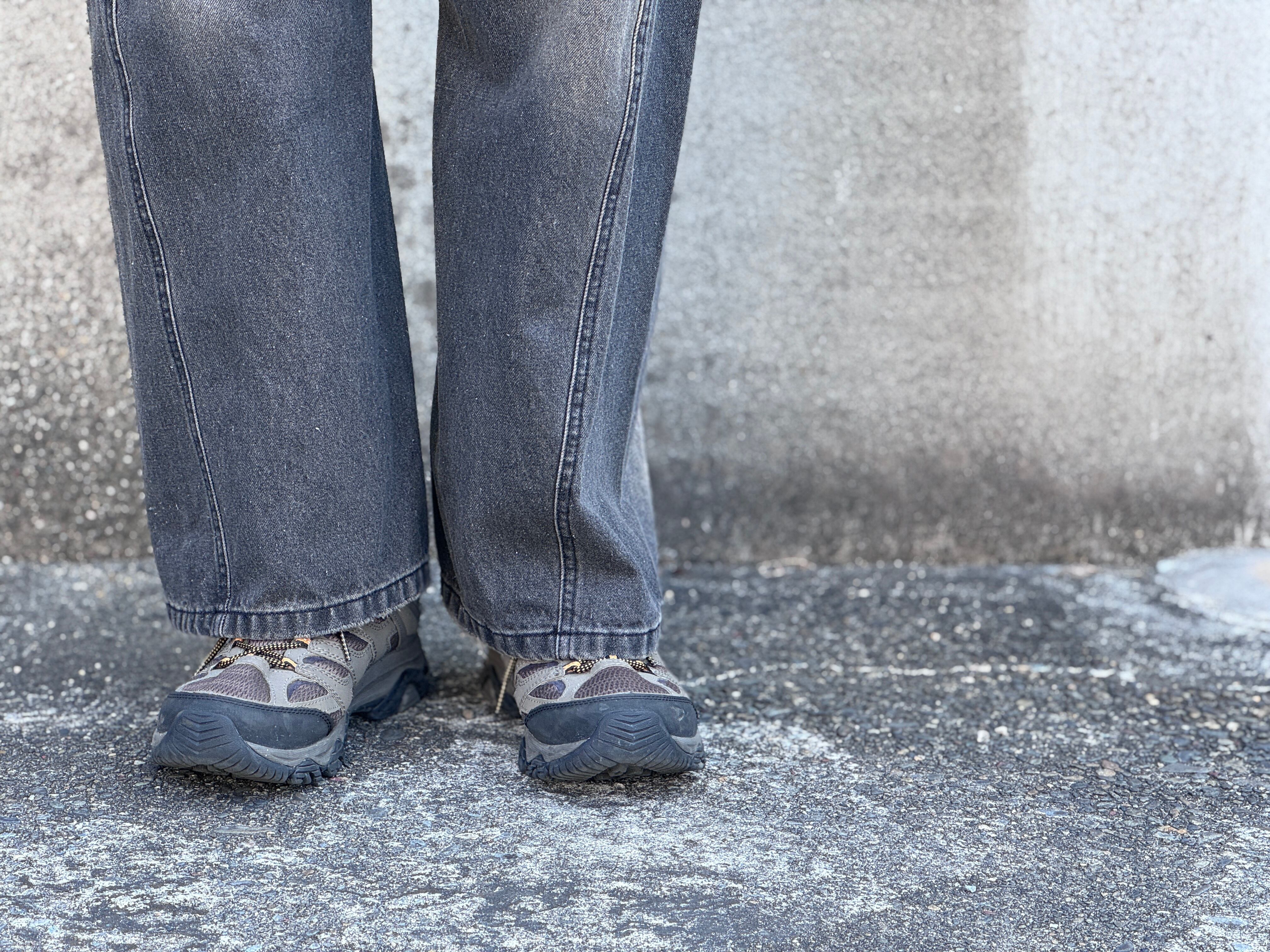 ブラックデニムにブラスト加工を施しフェード感のある表情、そしてポケット口・裾はグラインダー加工による適度なダメージ。