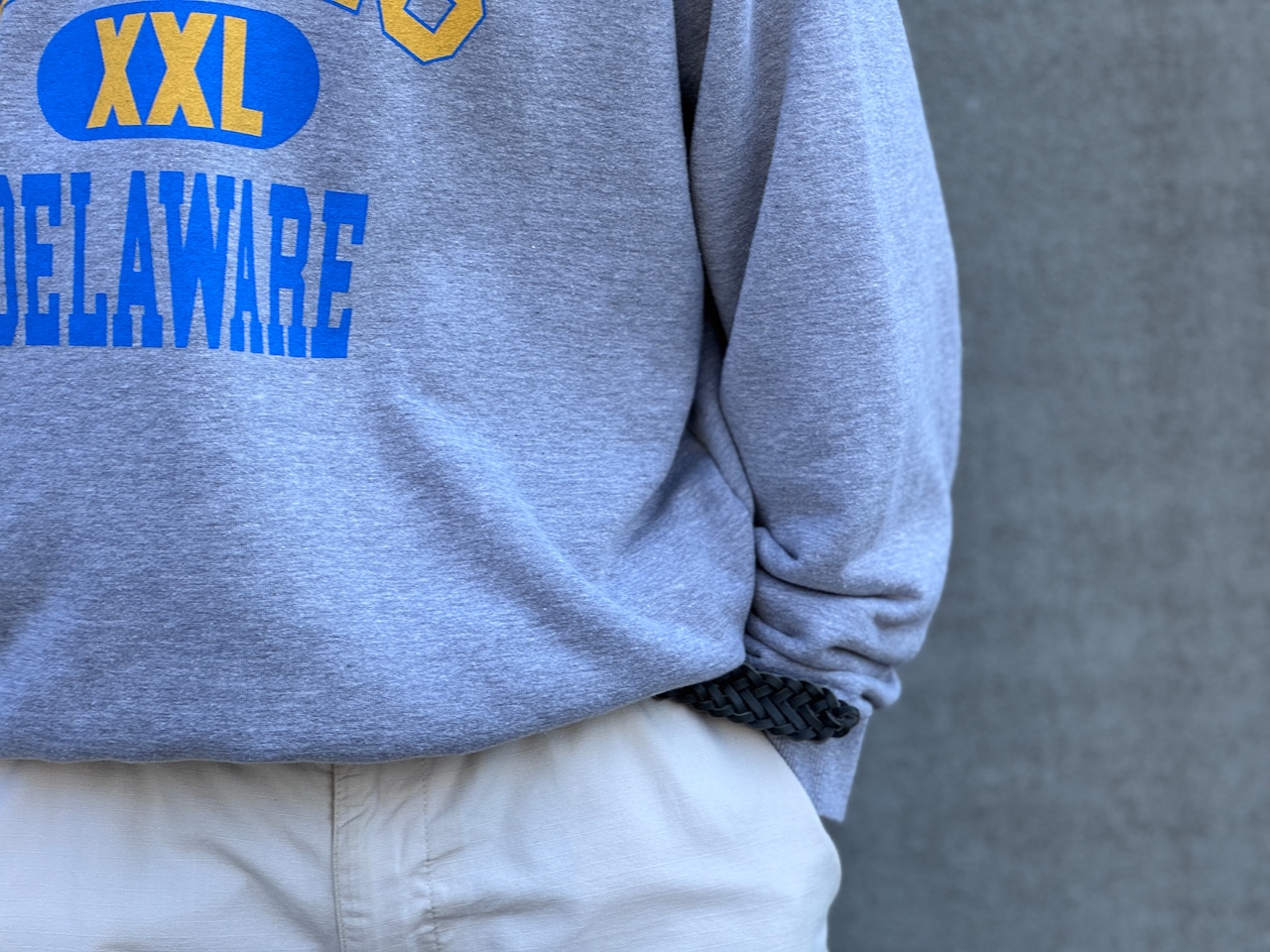 特殊の染めを施し、定番のグレーのスウェットが異なる存在に。カレッジプリントの配色も良い。