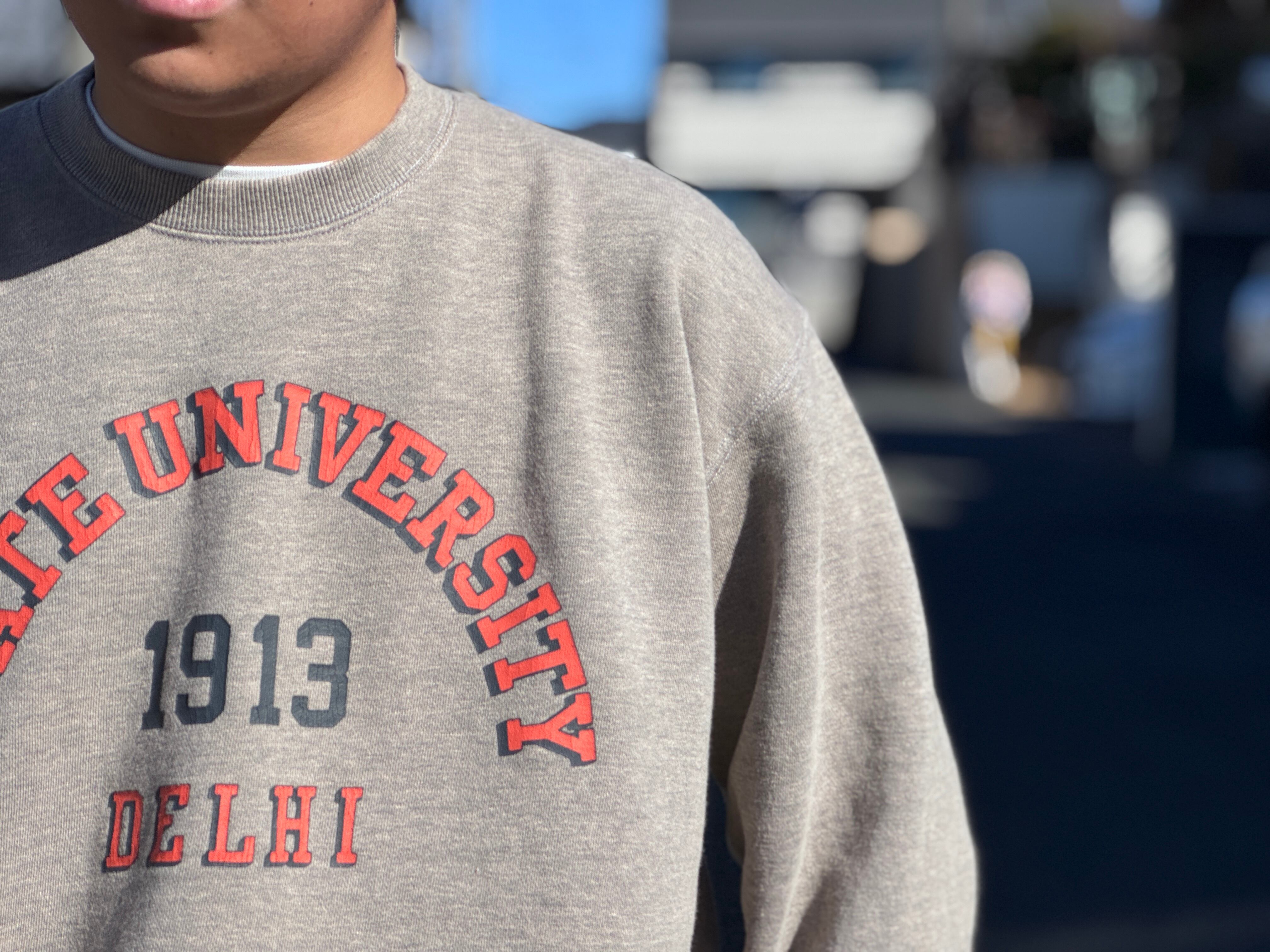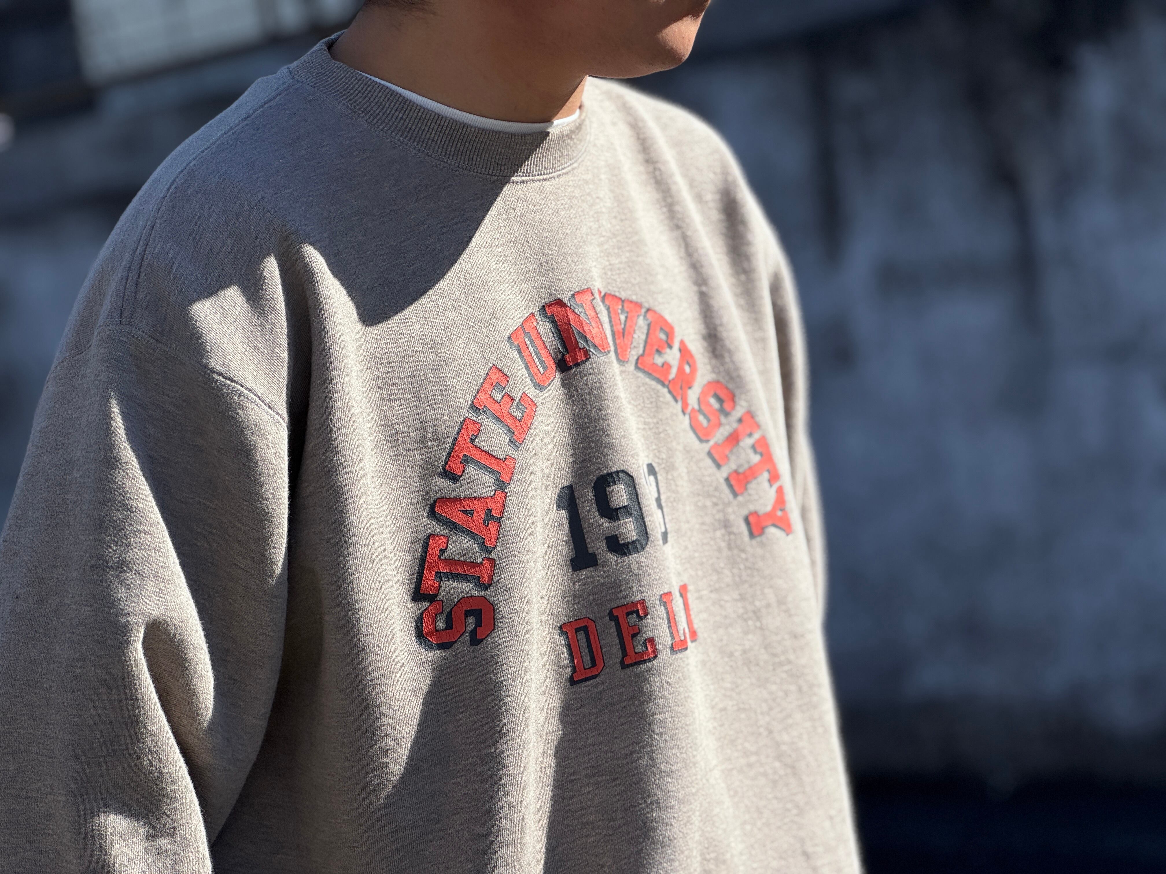 定番のグレーのスウェットが異なる表情。カレッジプリントの配色も良い。