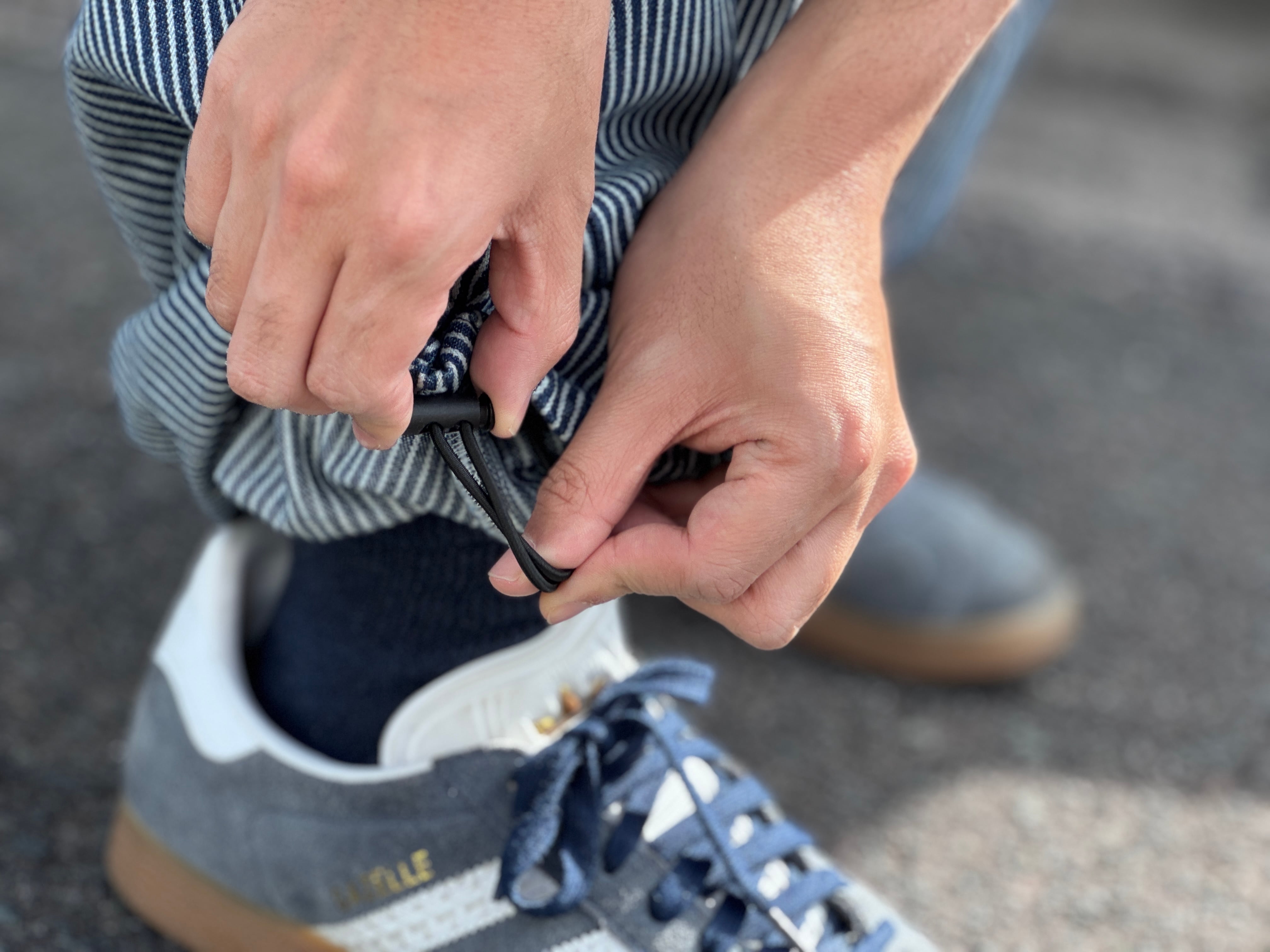 ペインターならではのデザインはそのままに、ウエストはベルトループ付きのイージーパンツ仕様、裾もコードを配してあるのでシルエットを変えることが可能。