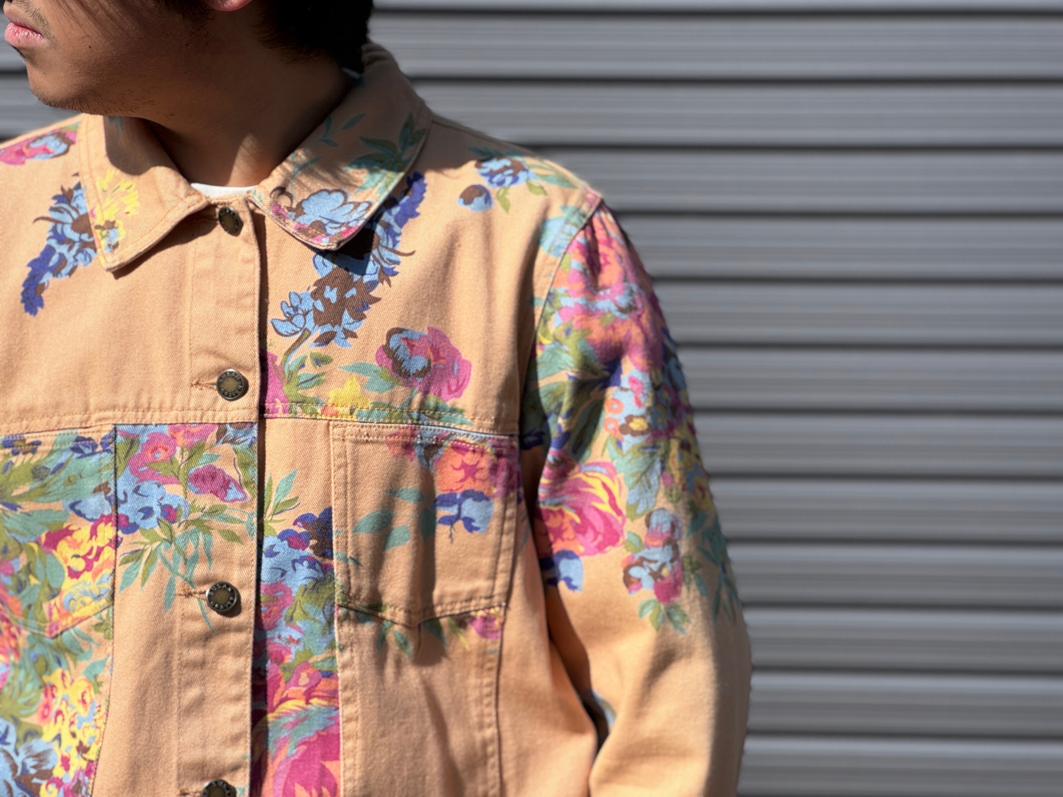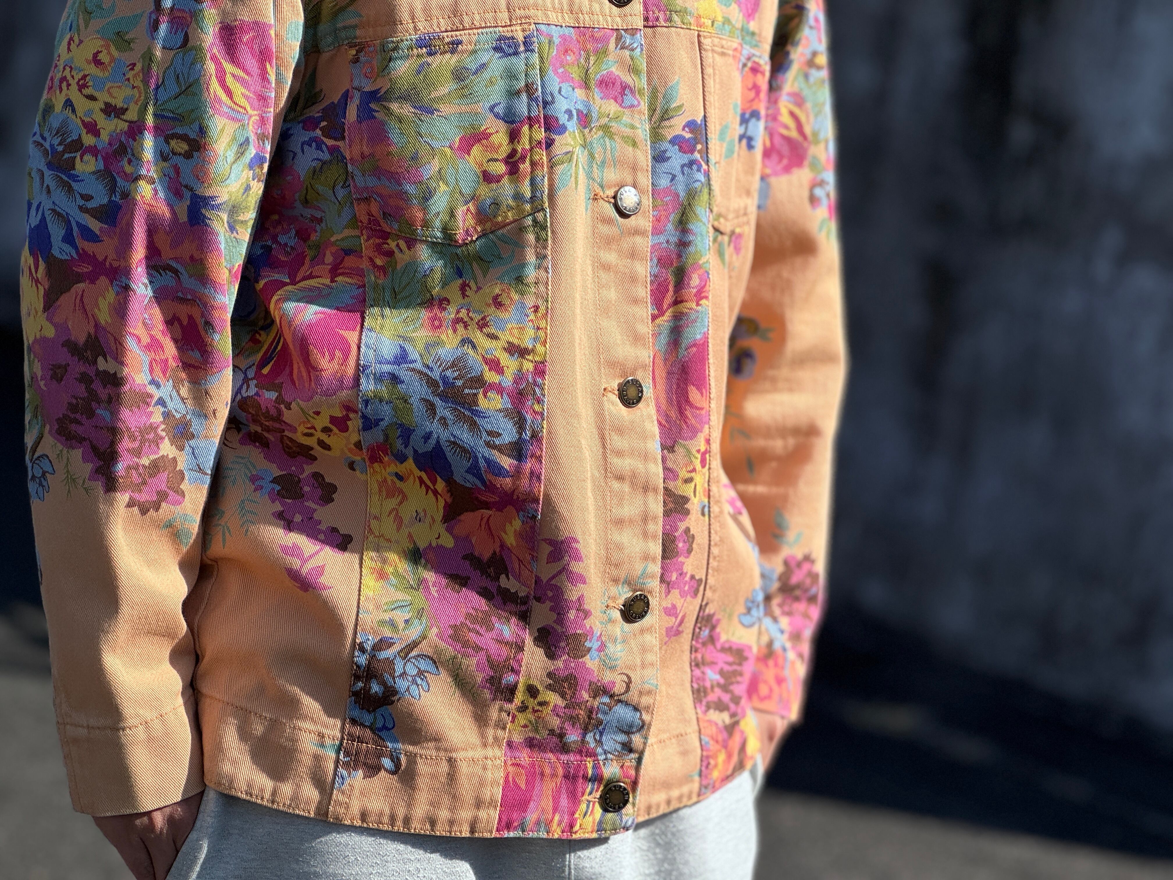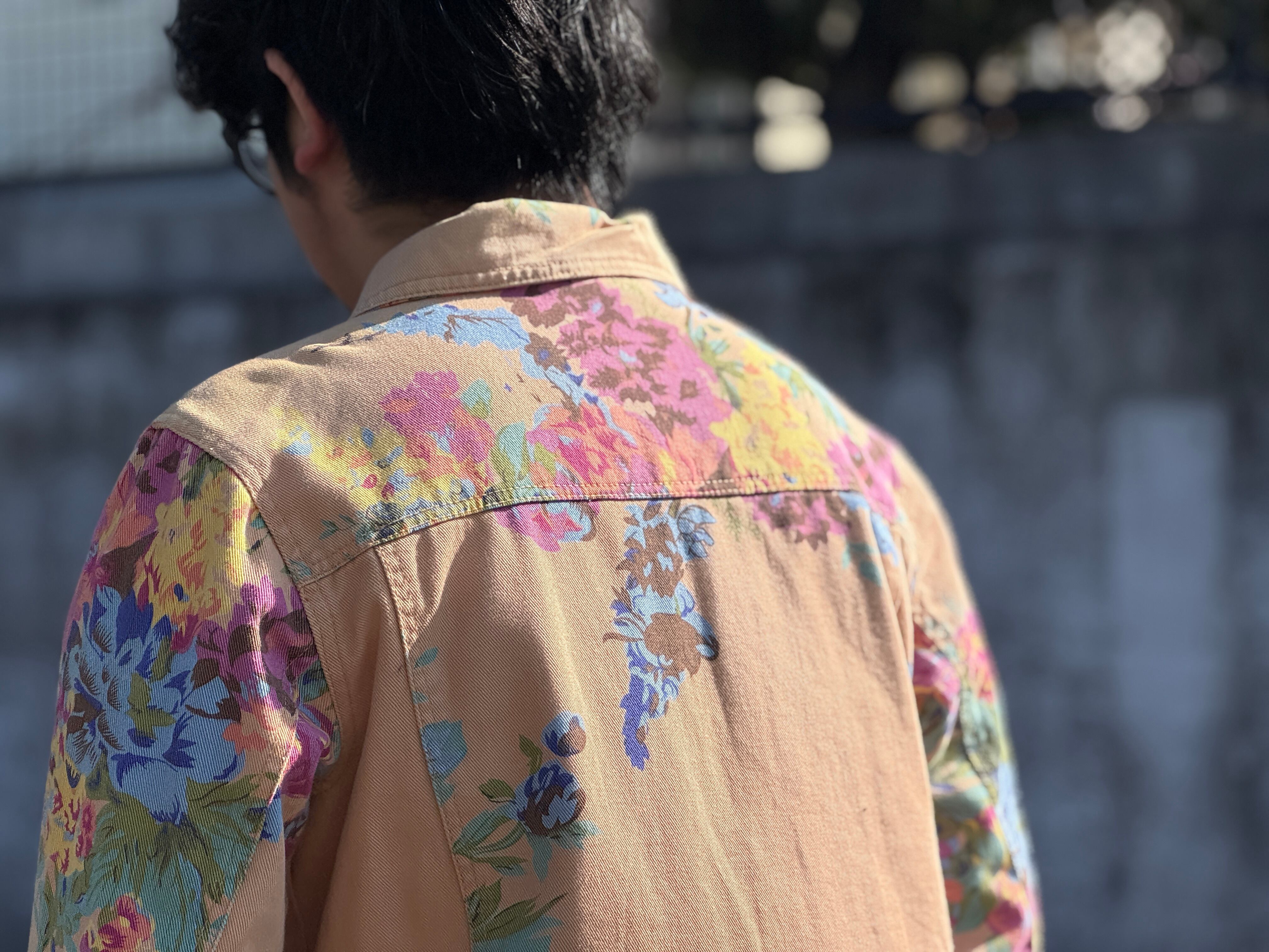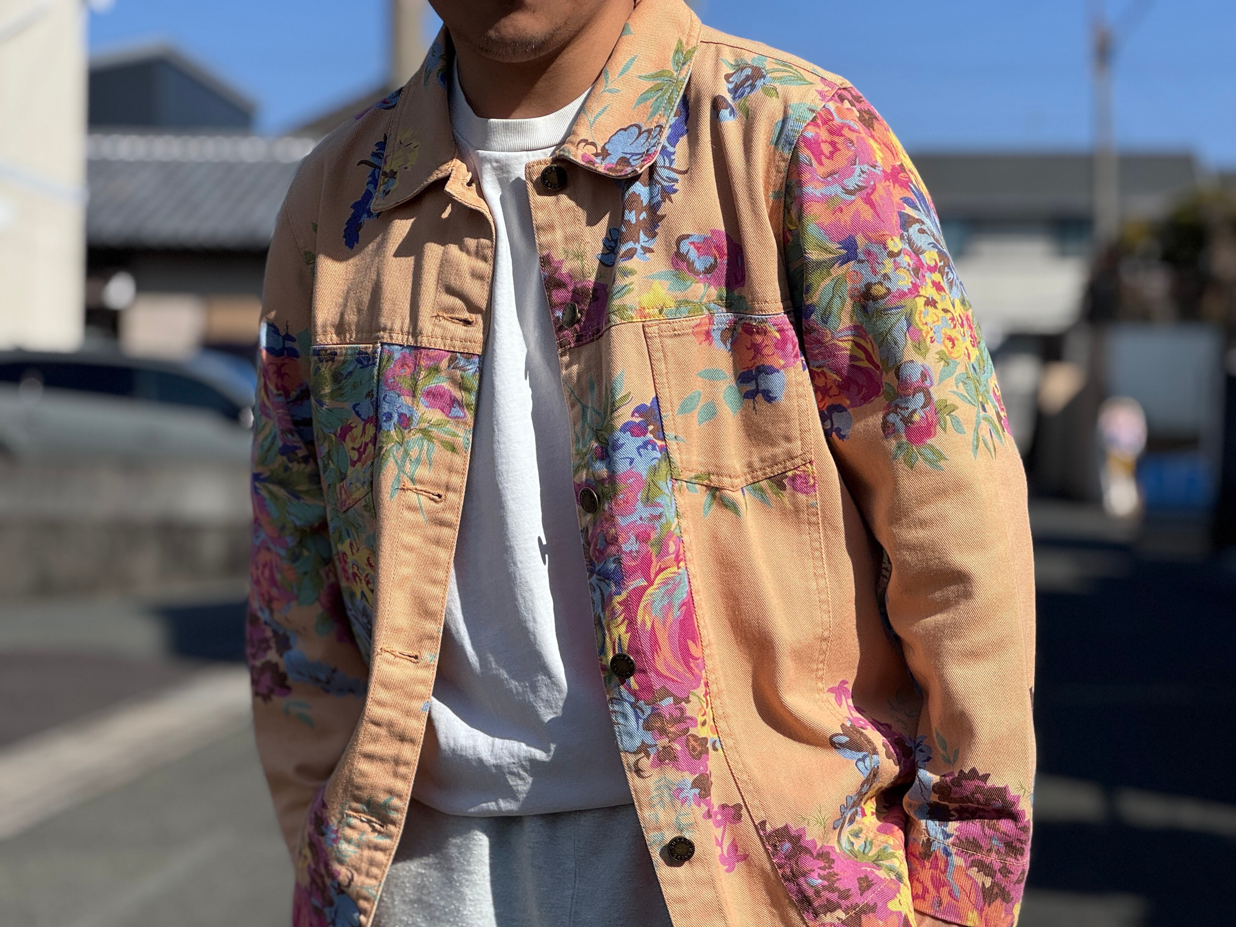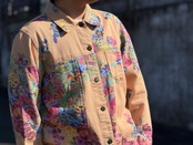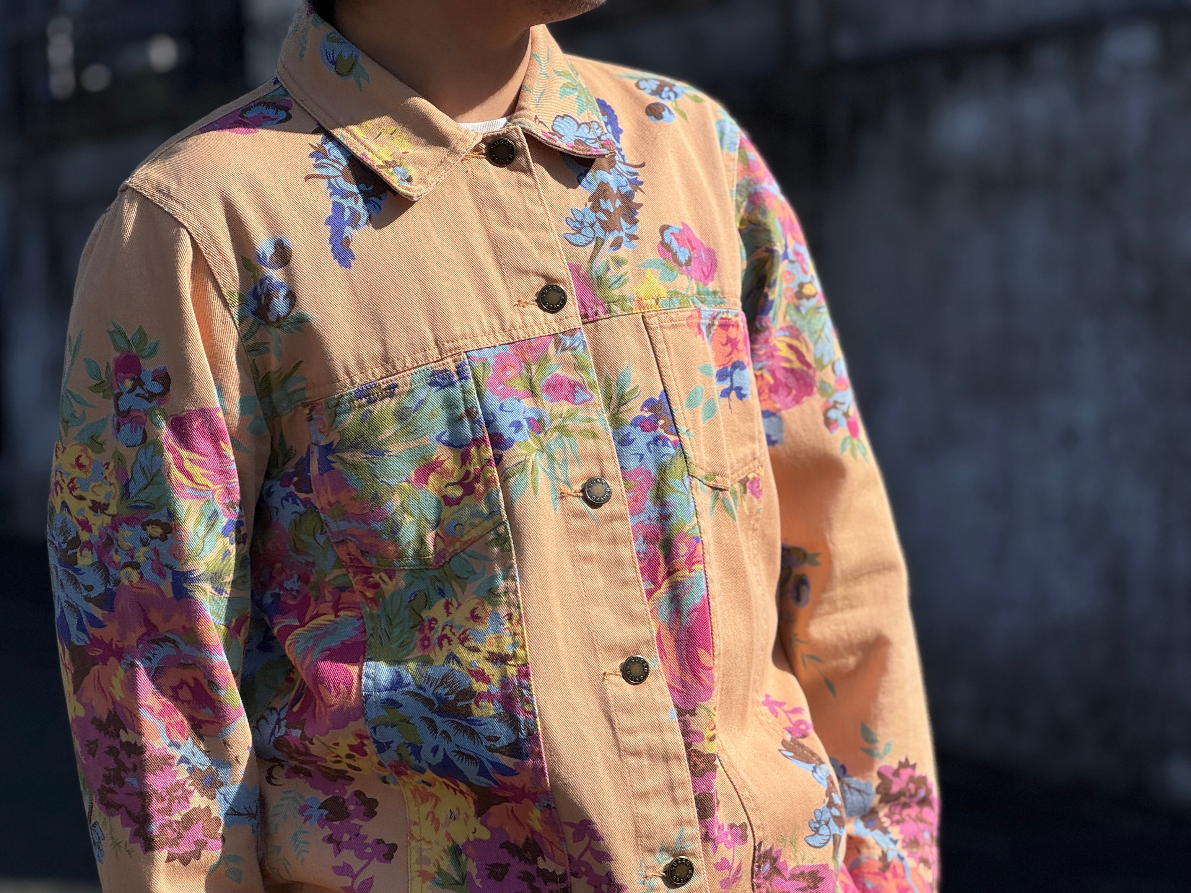 優しいペールトーンのオレンジカラーのボディにフラワープリントが施されたトラッカータイプのjkt。一重仕様のライトな生地感はjktとしてはもちろん、シャツjkt感覚でもスタイリングが楽しめます。
