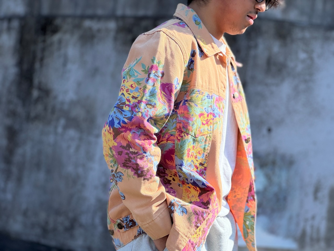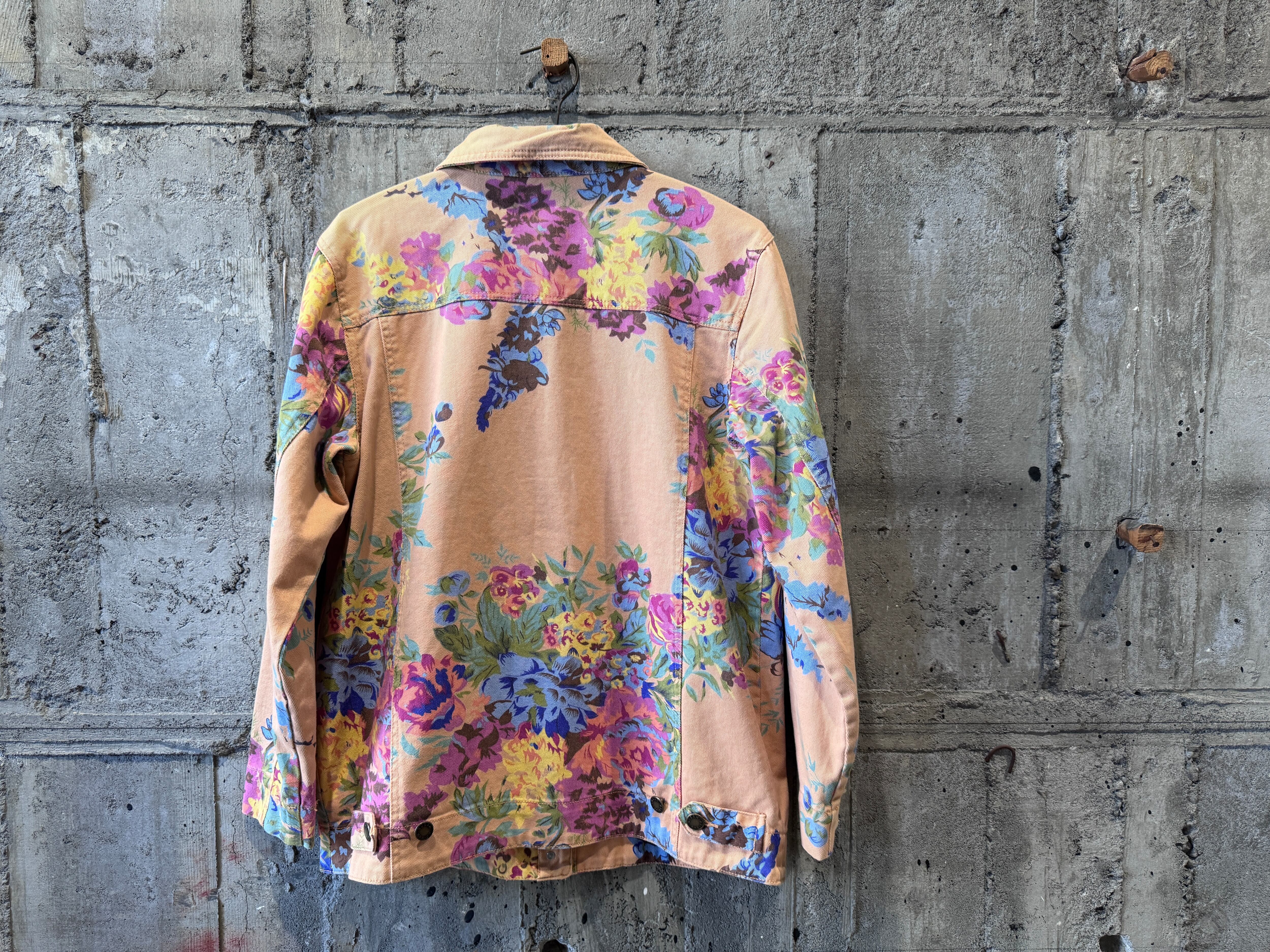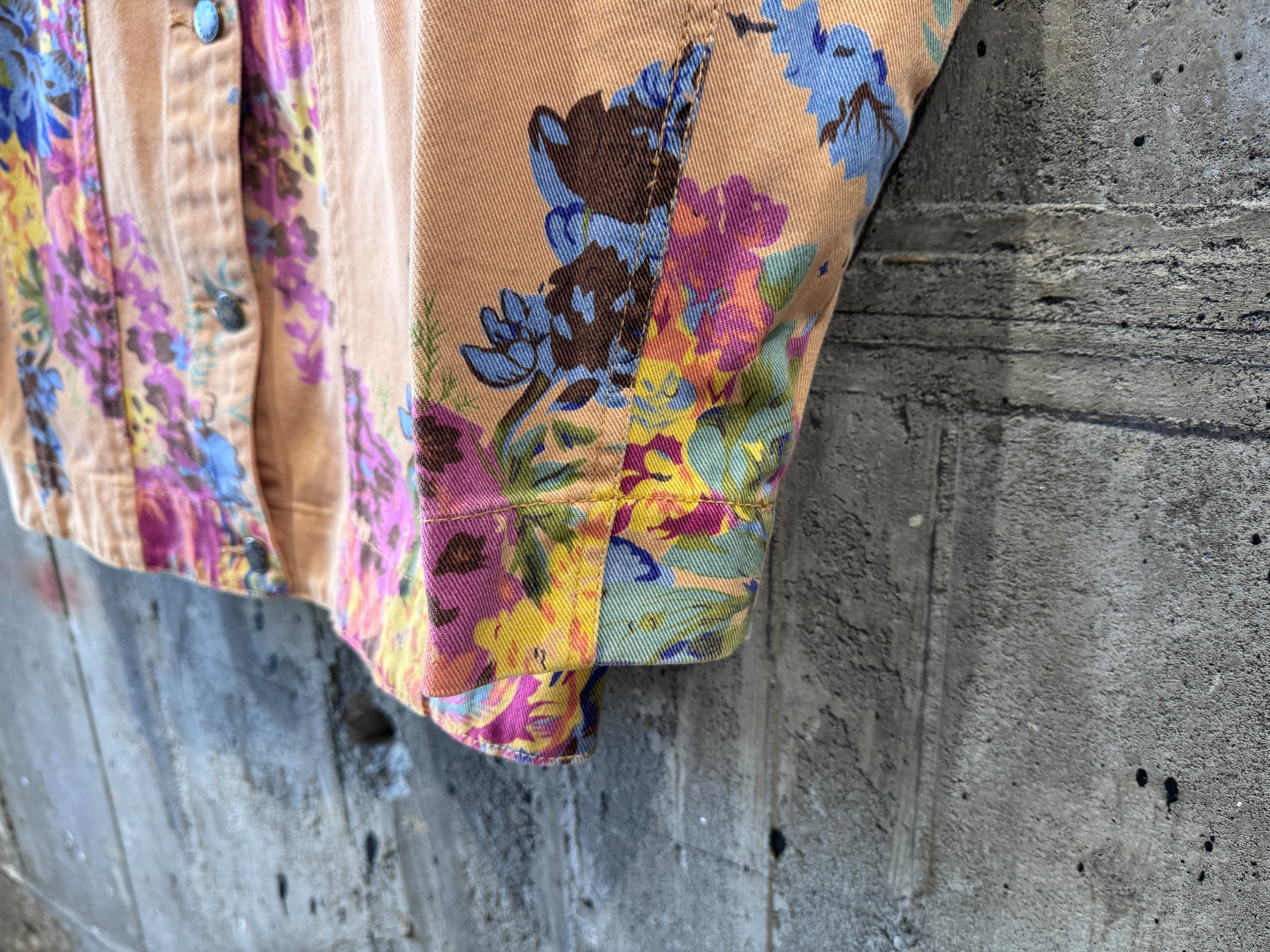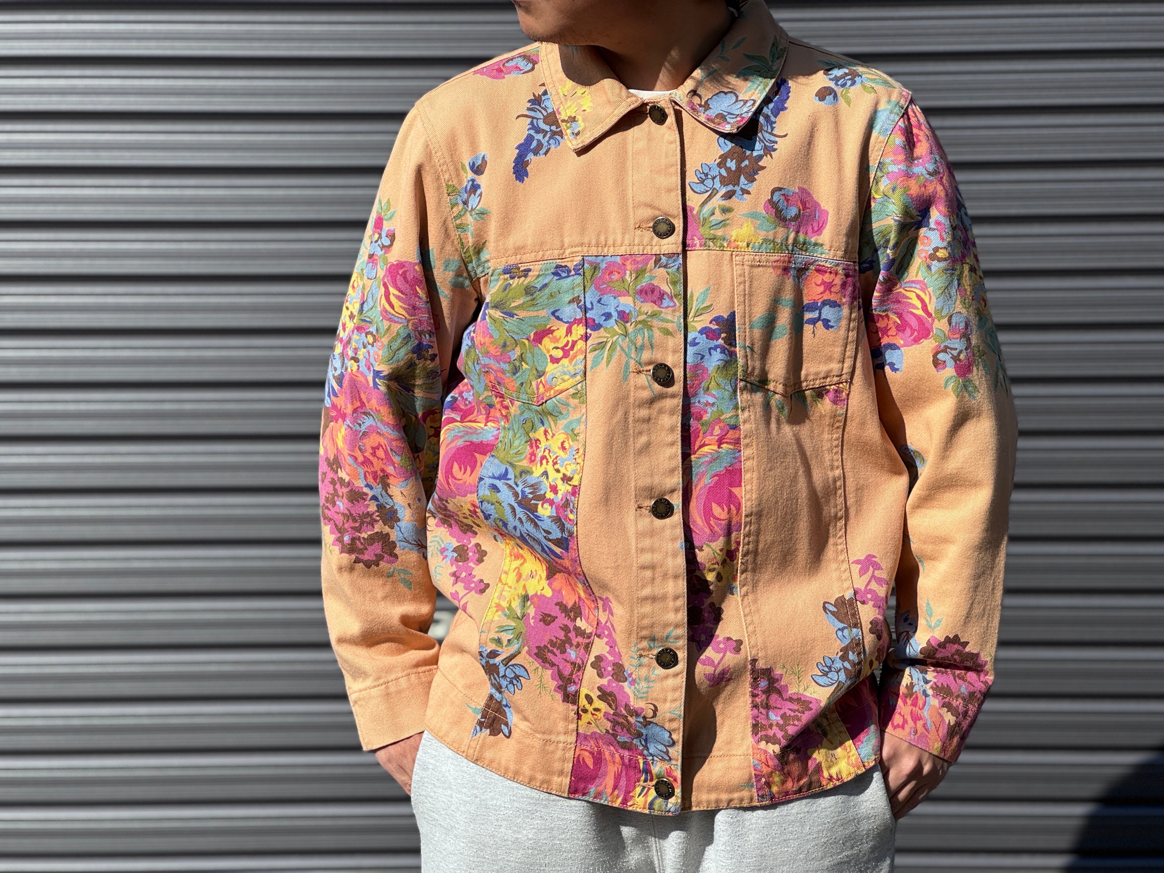 優しいペールトーンのオレンジカラーのボディにフラワープリントが施されたトラッカータイプのjkt。一重仕様のライトな生地感はjktとしてはもちろん、シャツjkt感覚でもスタイリングが楽しめます。