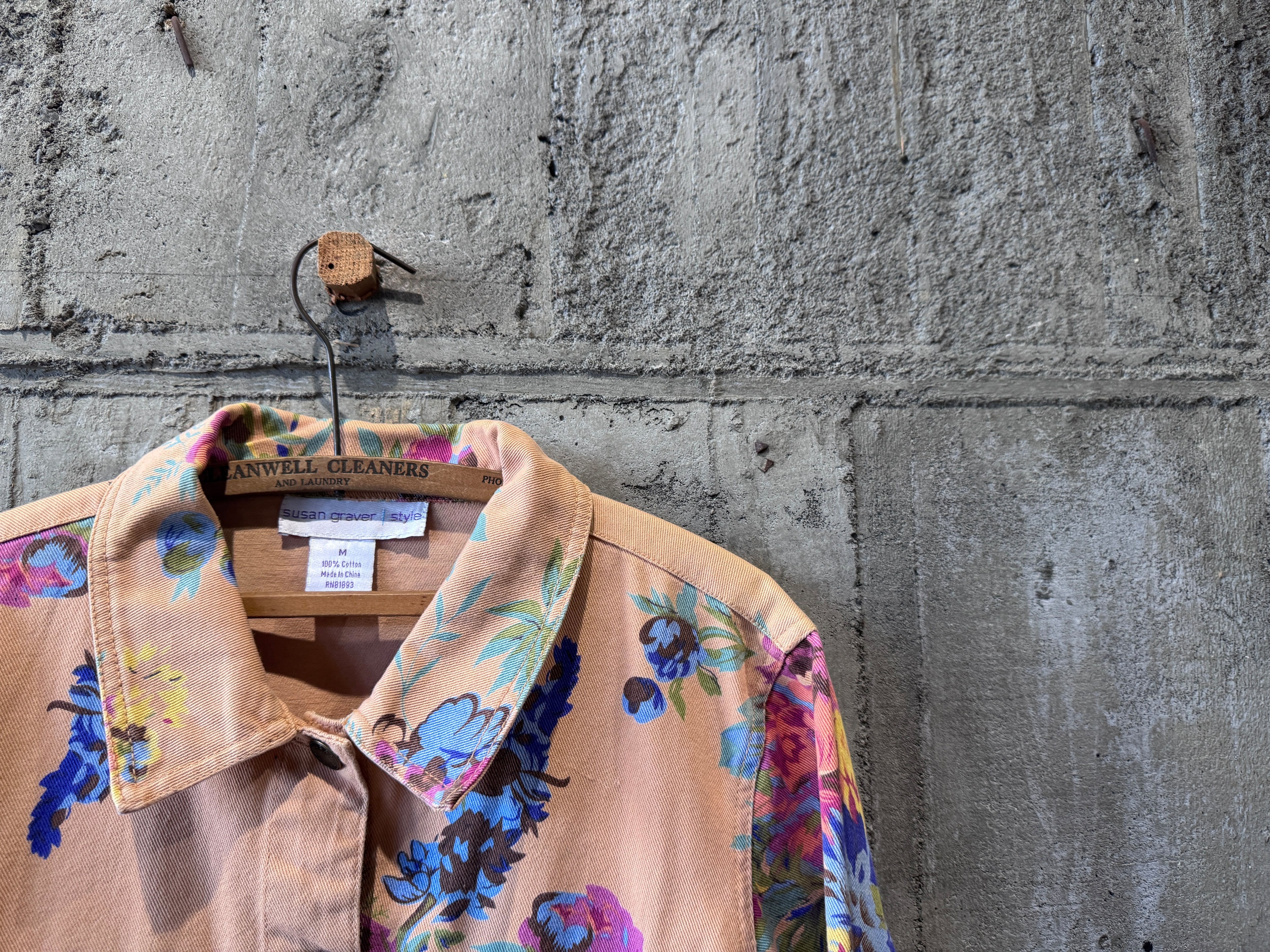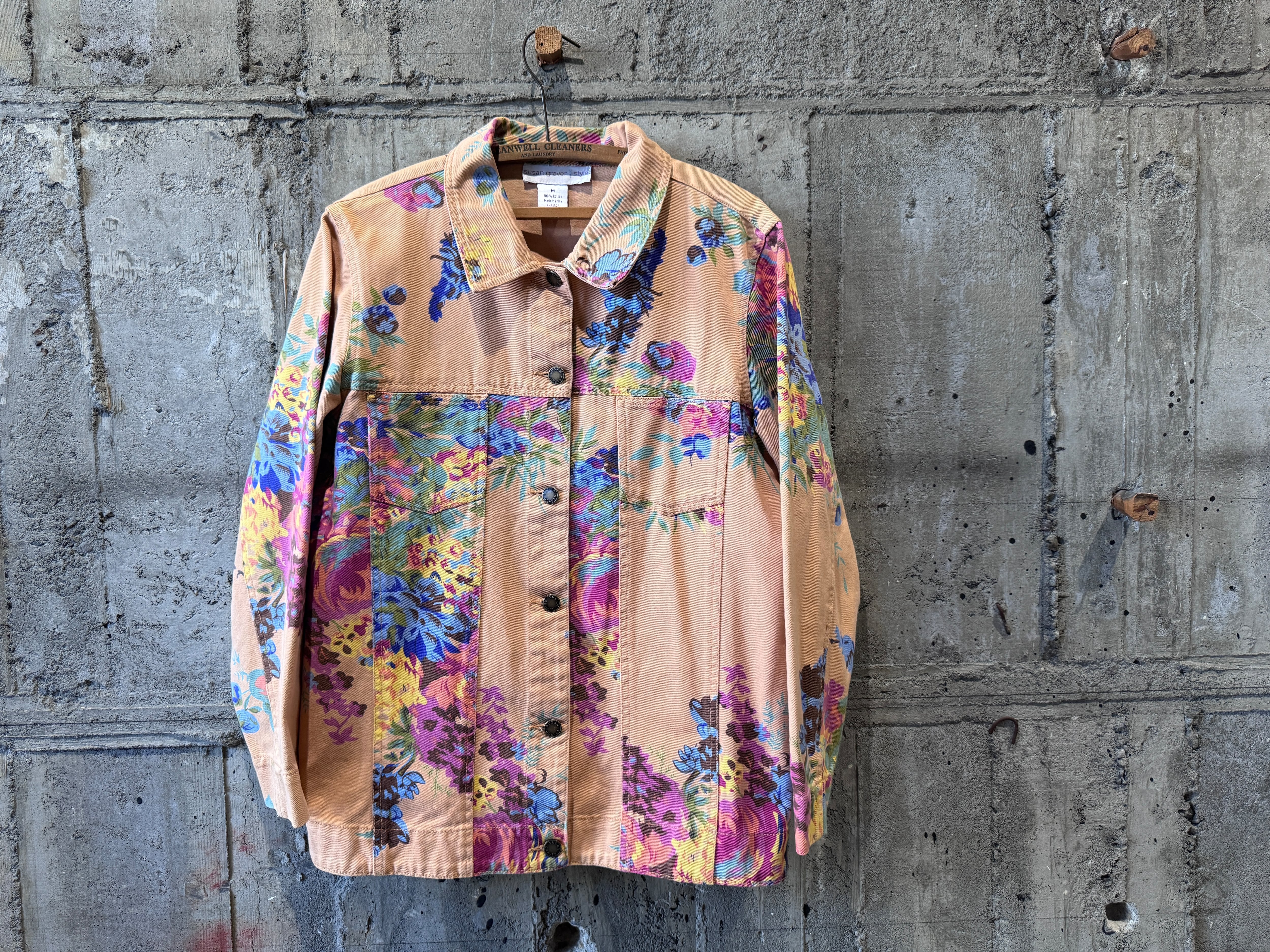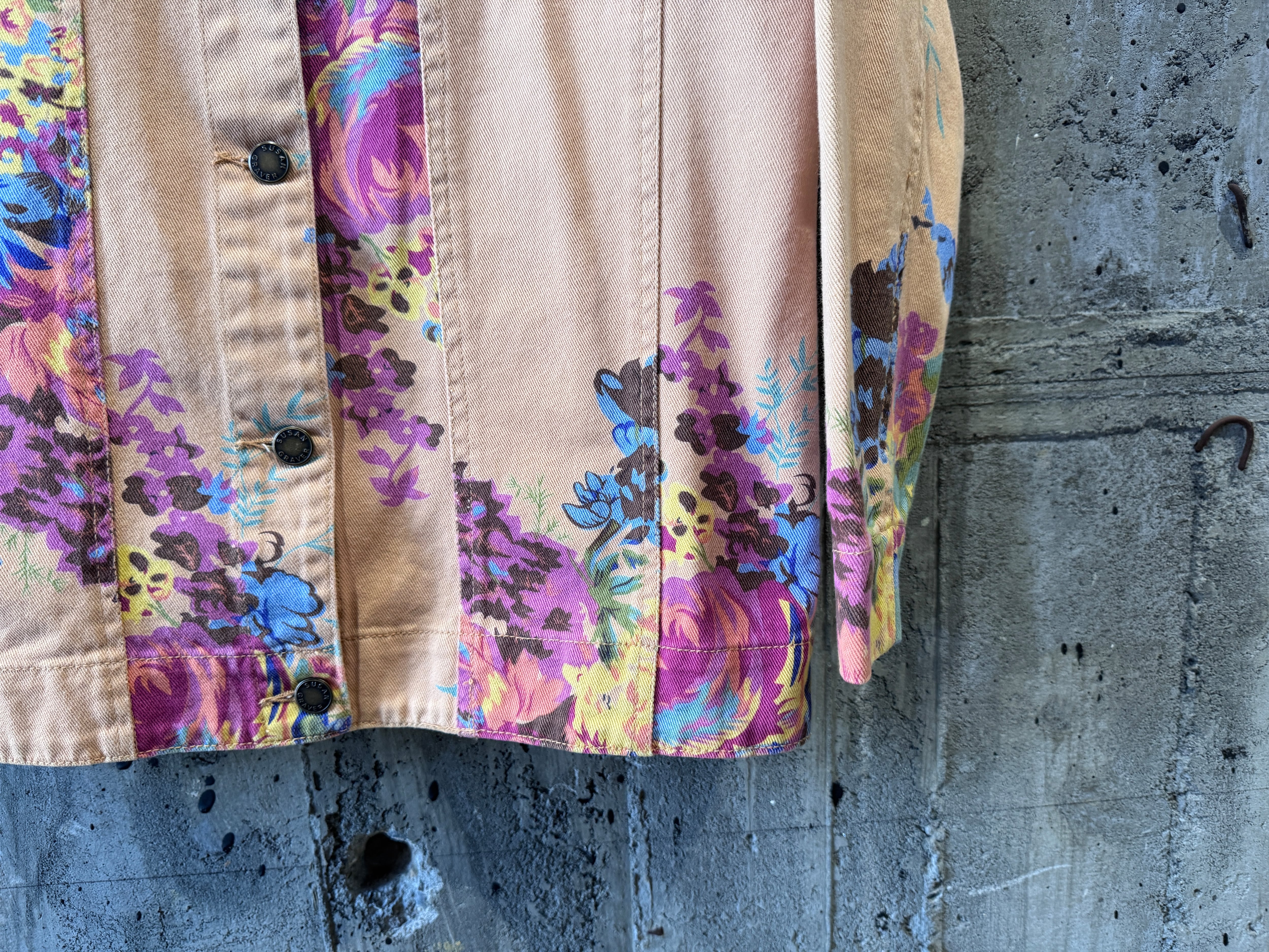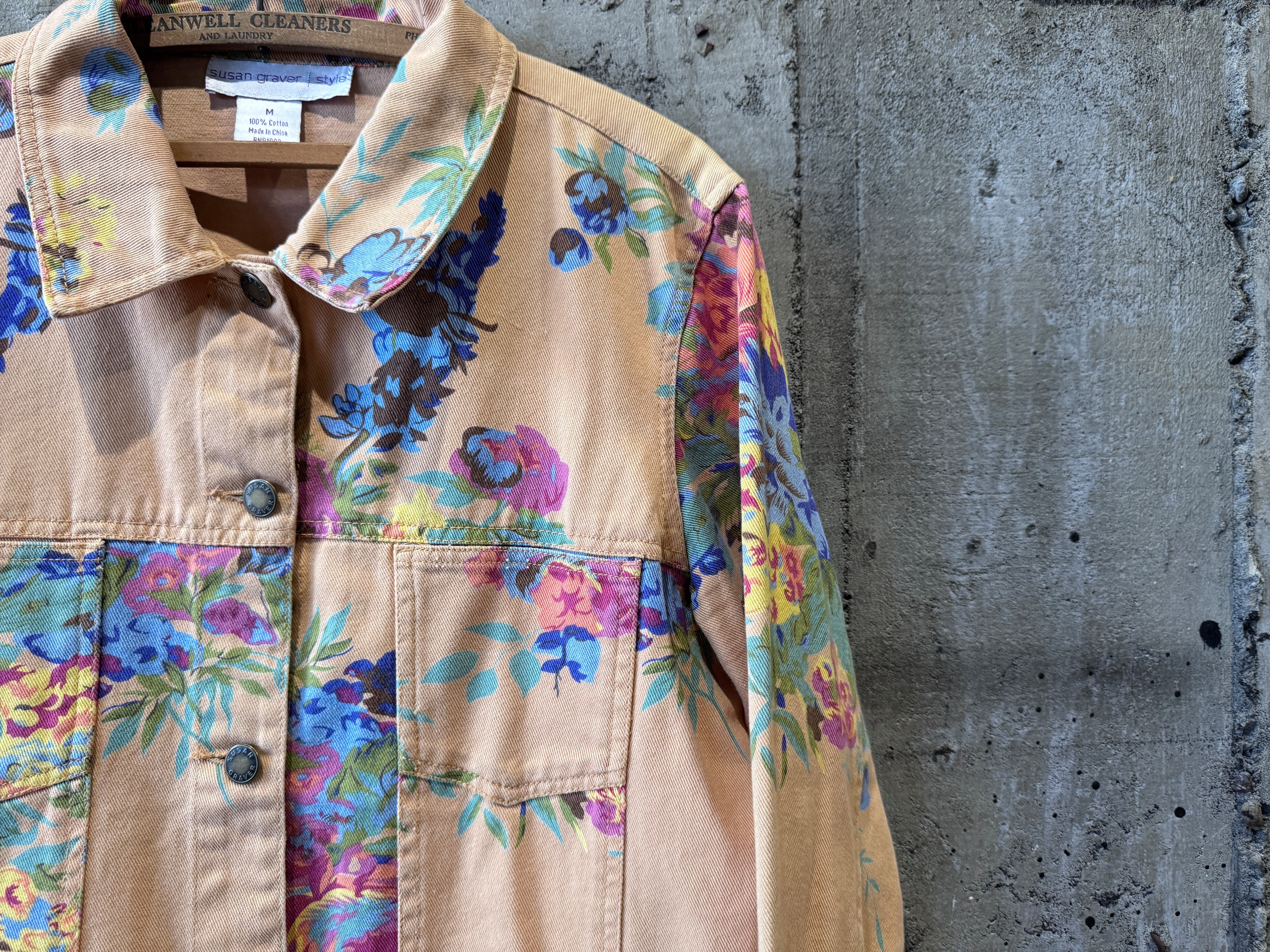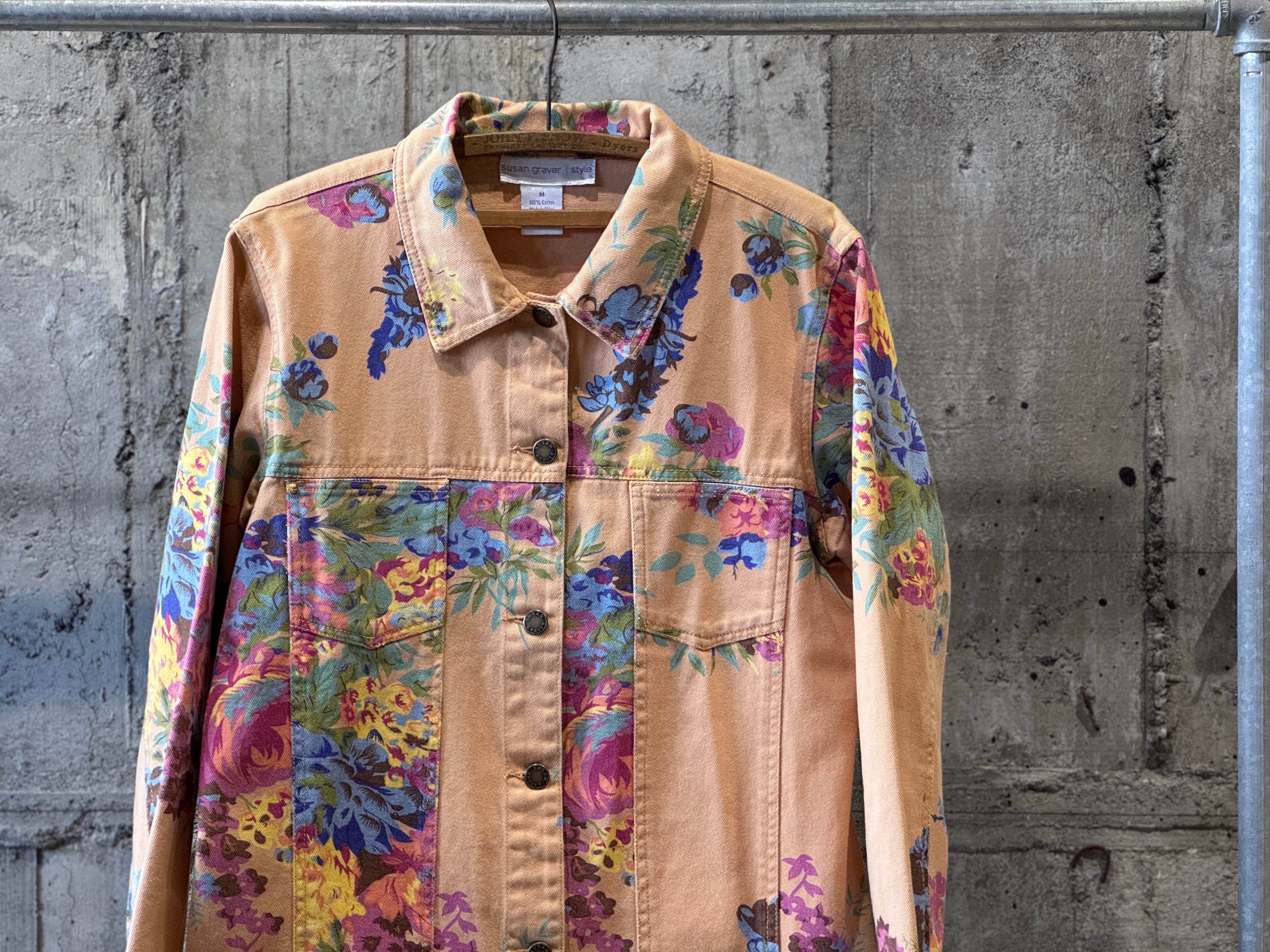 優しいペールトーンのオレンジカラーのボディにフラワープリントが施されたトラッカータイプのjkt。一重仕様のライトな生地感はjktとしてはもちろん、シャツjkt感覚でもスタイリングが楽しめます。