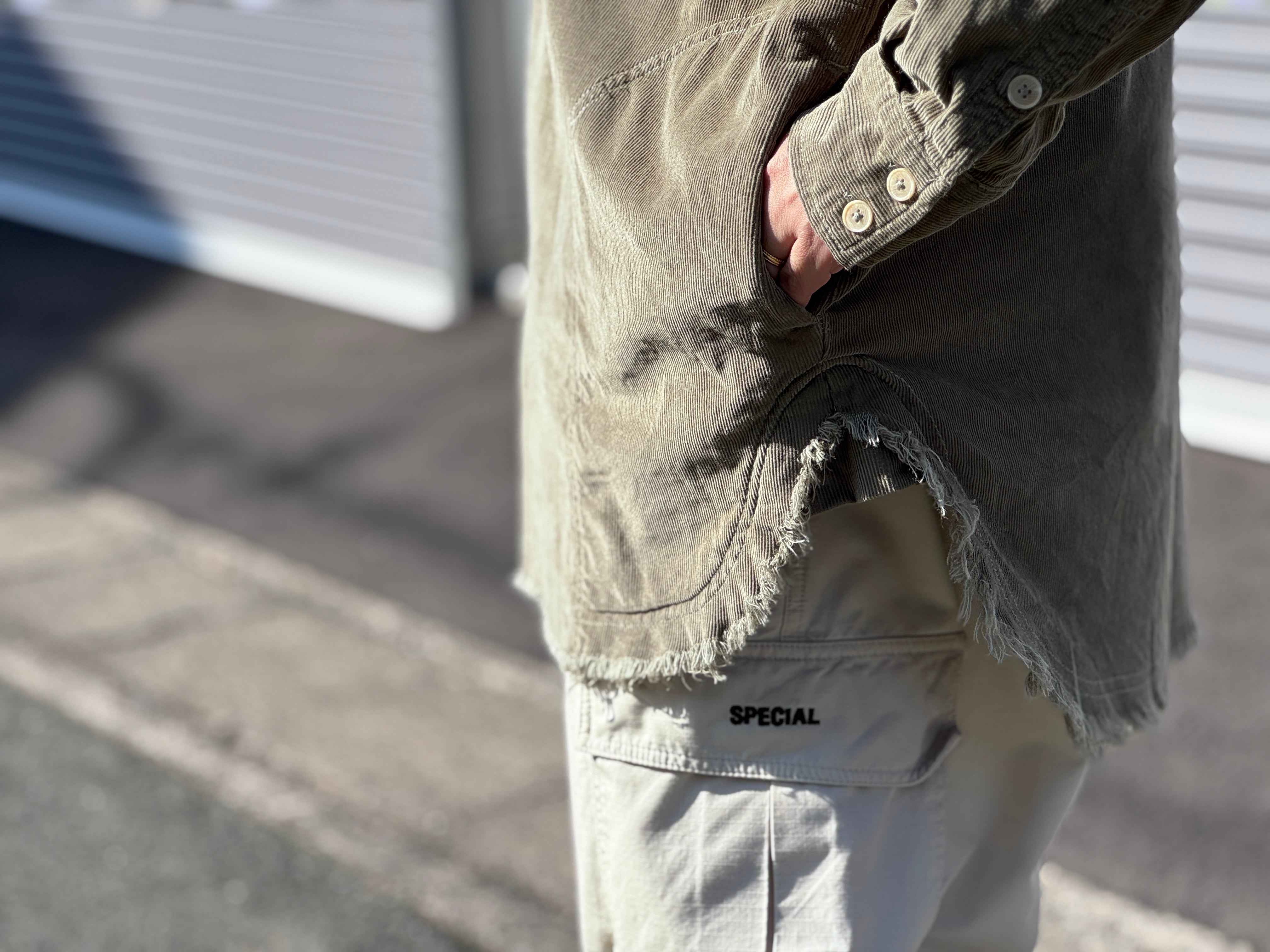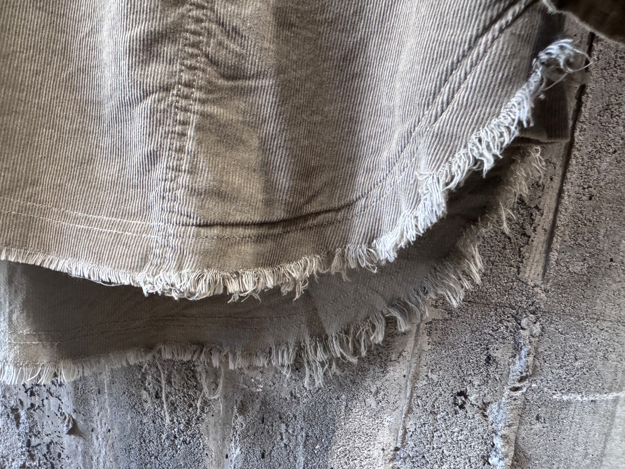 両サイドにスラッシュポケットが配され、裾はフリンジ仕様。