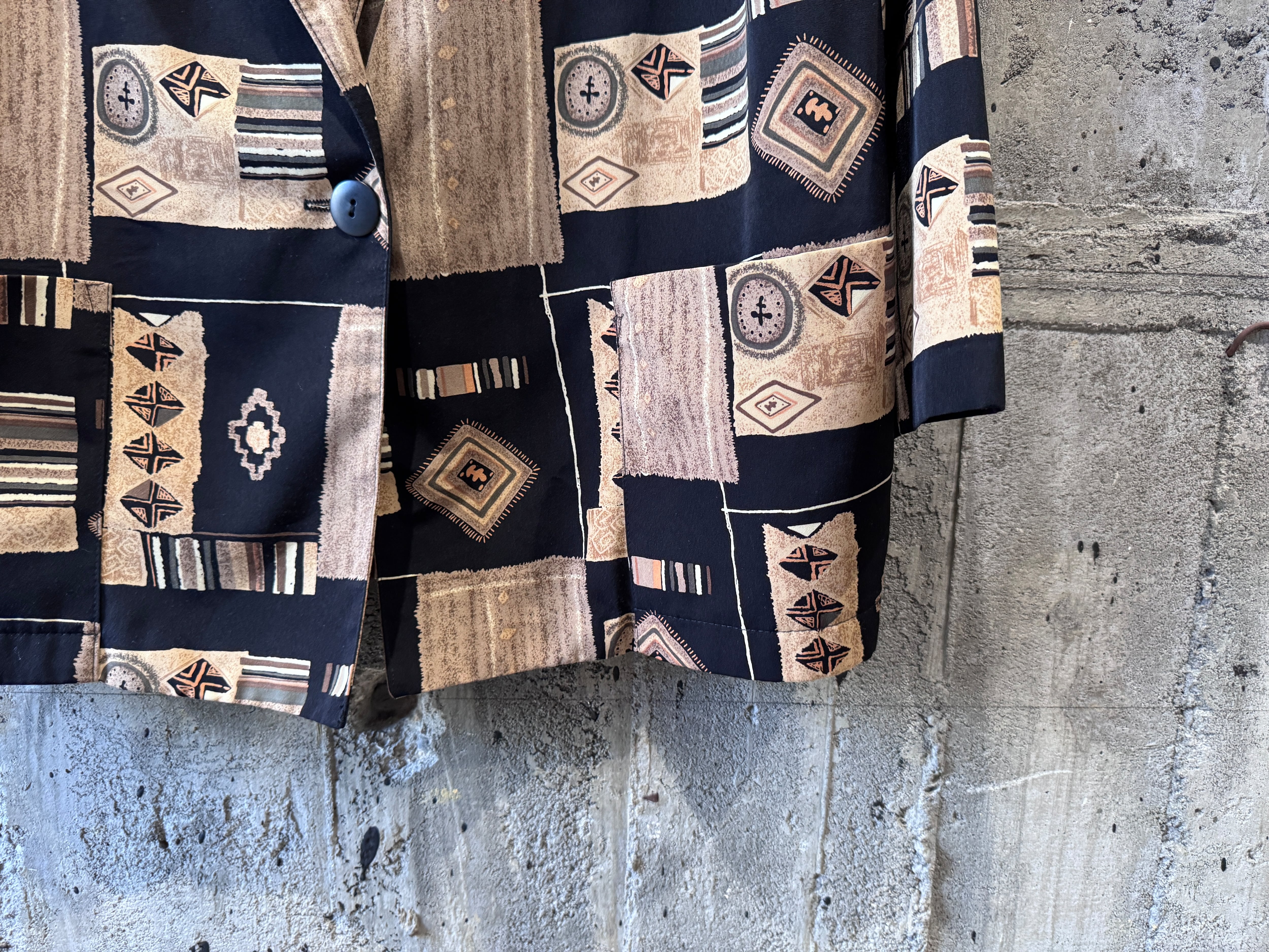 コチラはブラックベースの総柄タイプ、生地感はライトなポリエステル100%。ライトjktとしても、シャツ感覚でもスタイリングが楽しむことが可能。