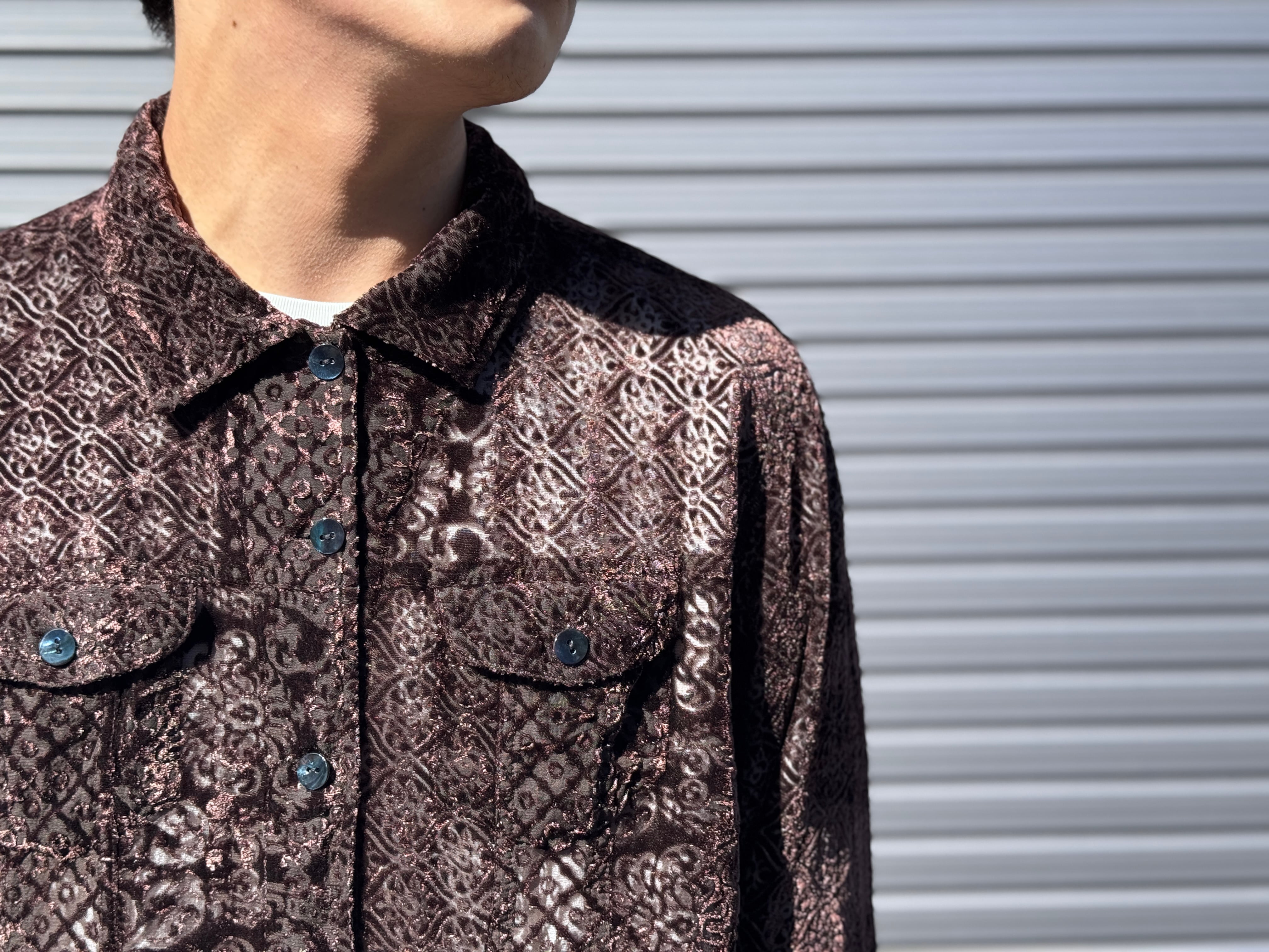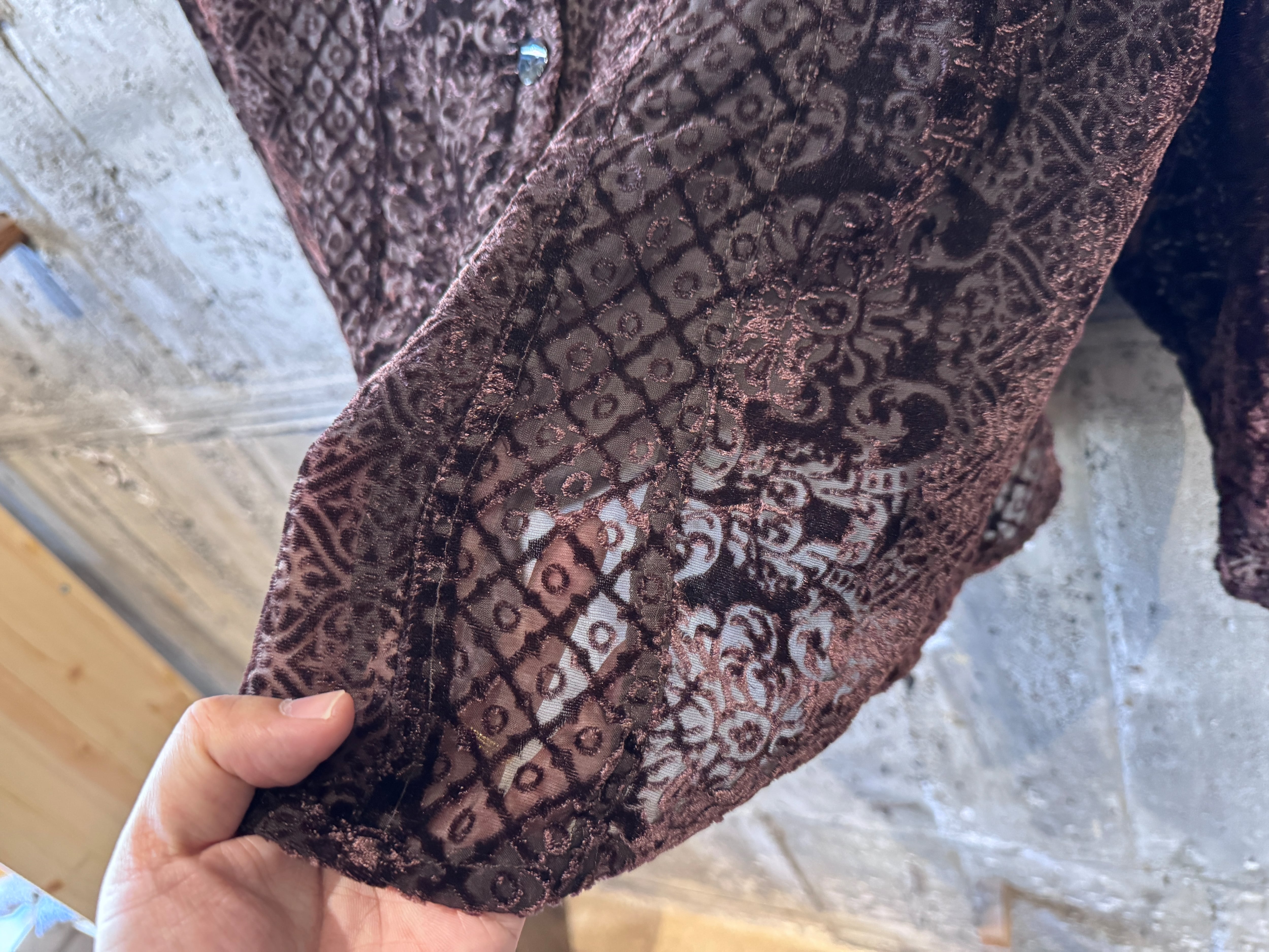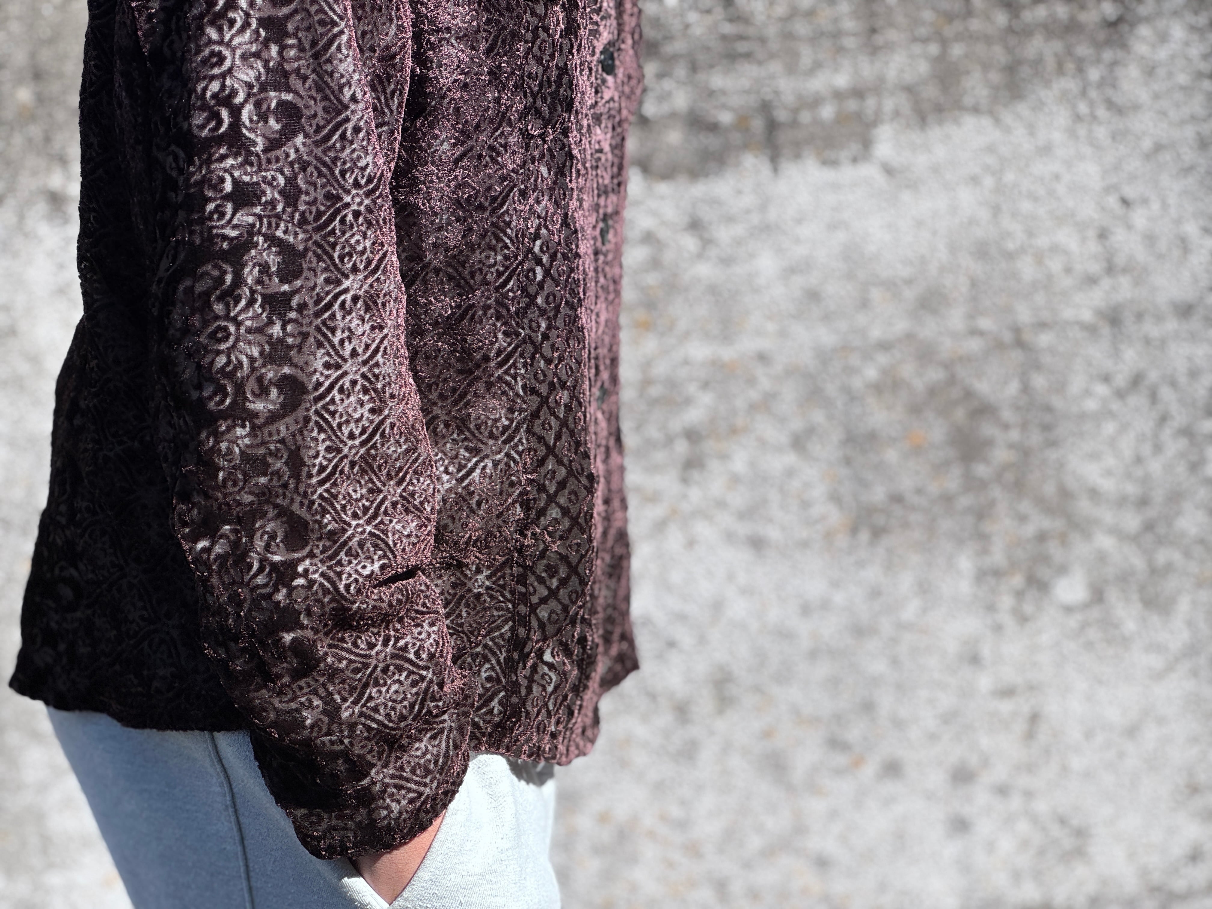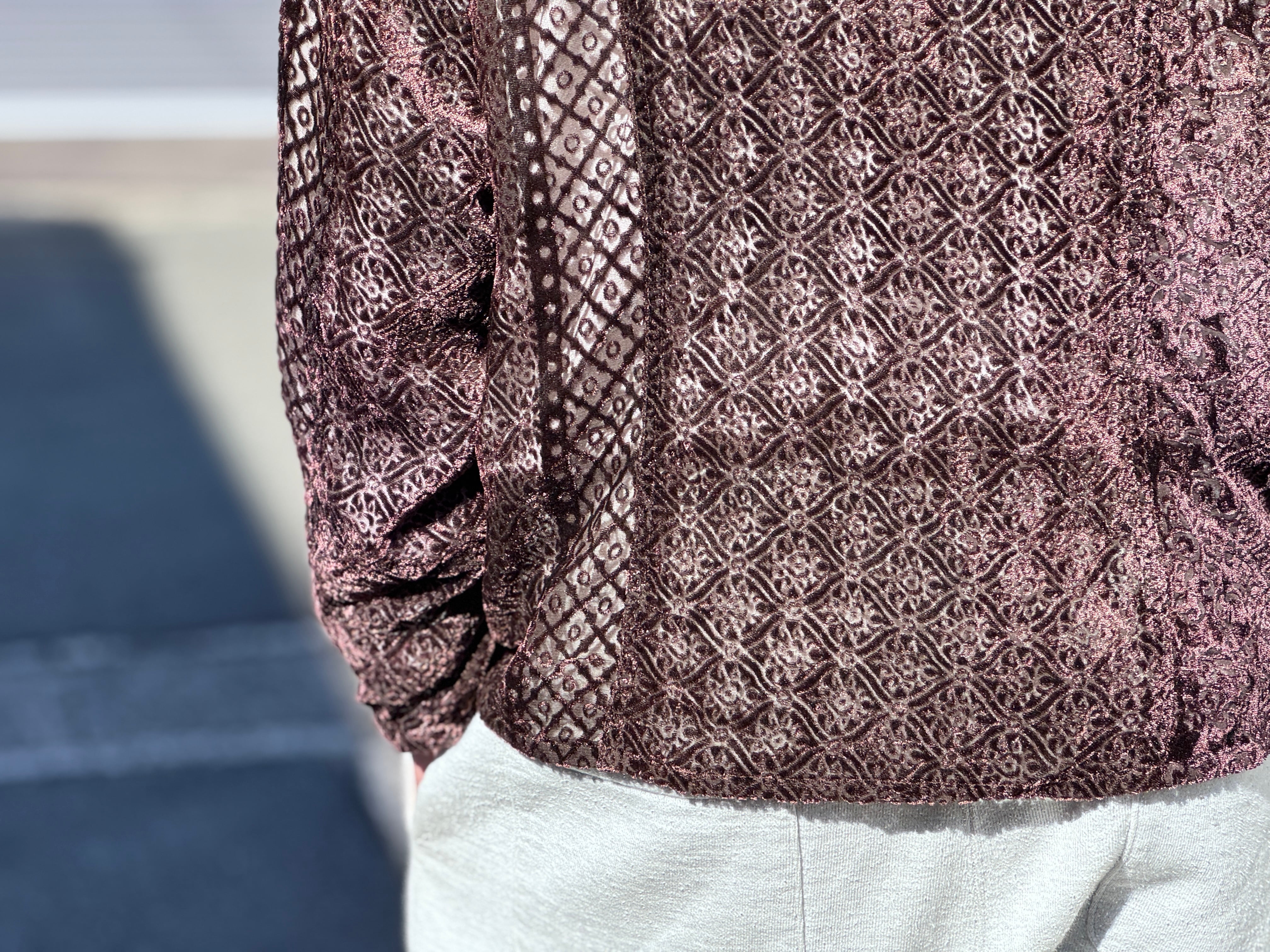 モコモコで凸凹とした生地でパターンが施され、透け感のある部分との絶妙な表情です。インナーに何のカラーを着るかでその表情が異なりますね。