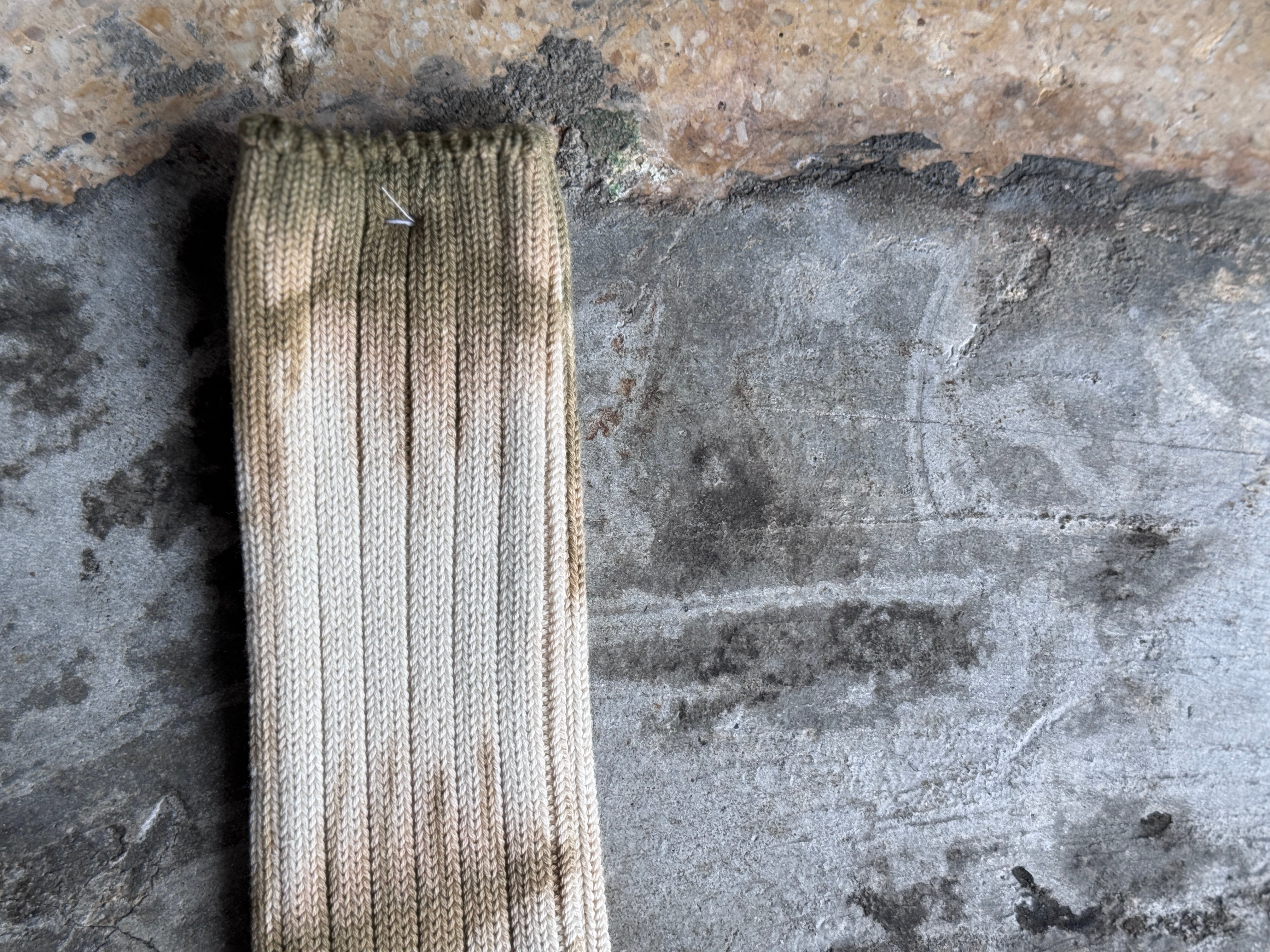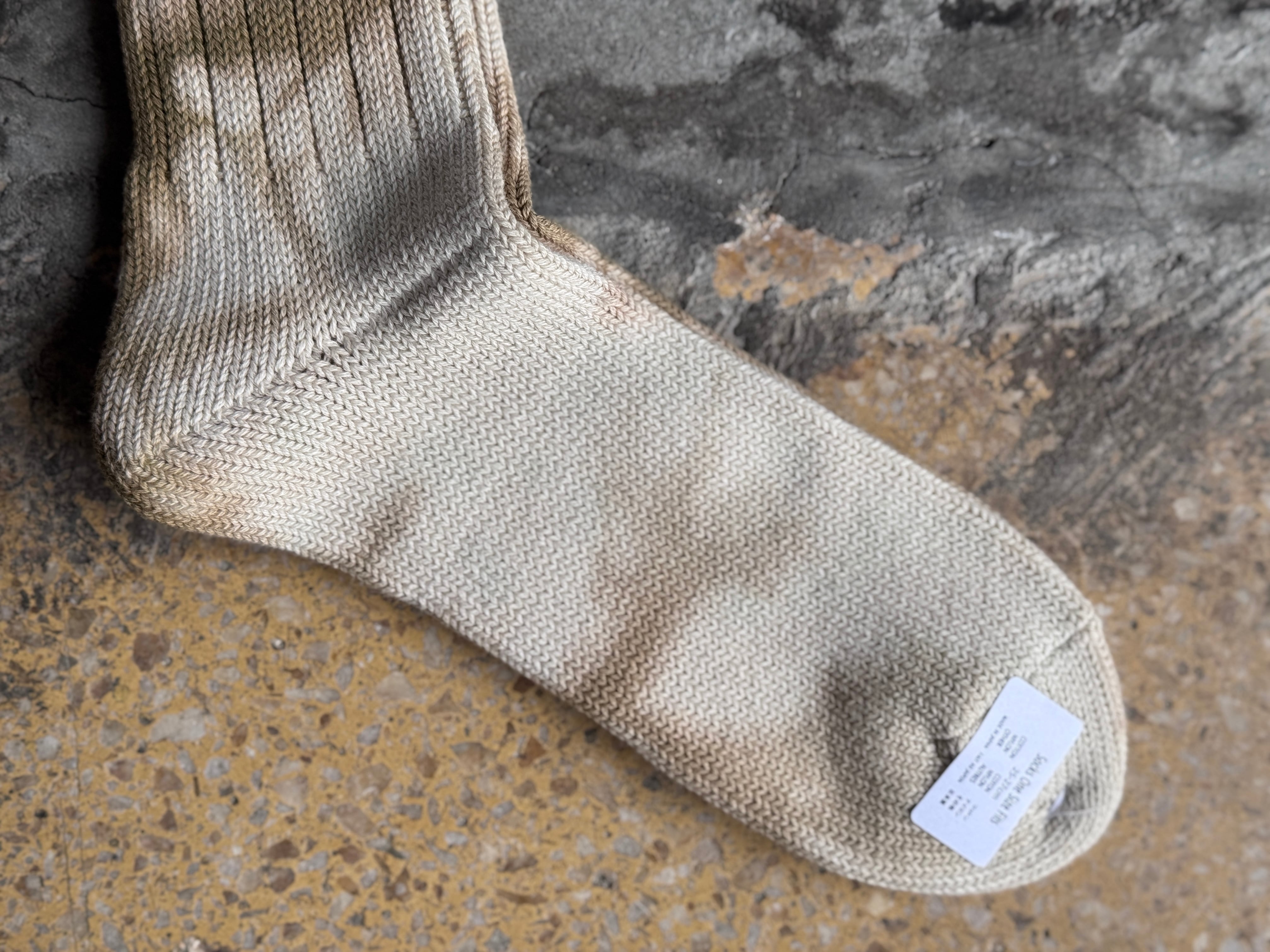 ローゲージソックスを技術の特化した染色工場で一足一足丁寧にグラデーションが美しい単色のムラ染めを施しています。