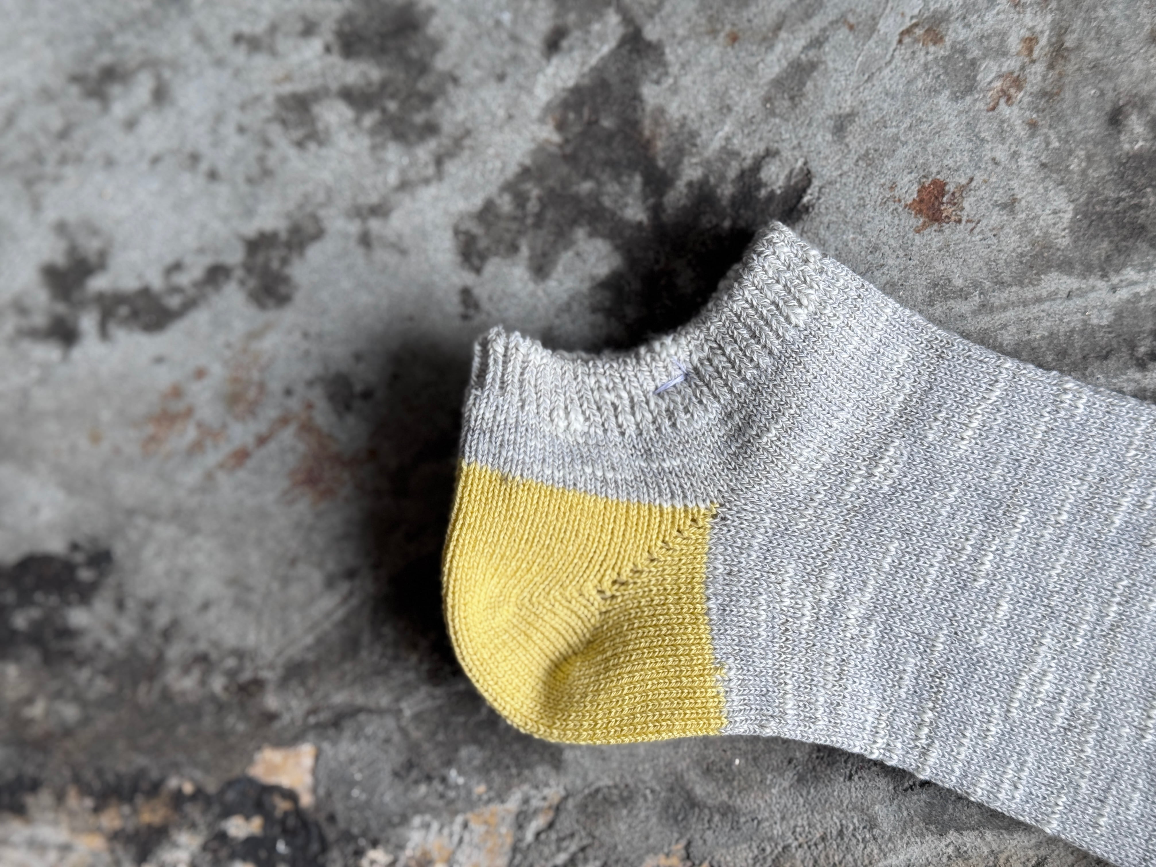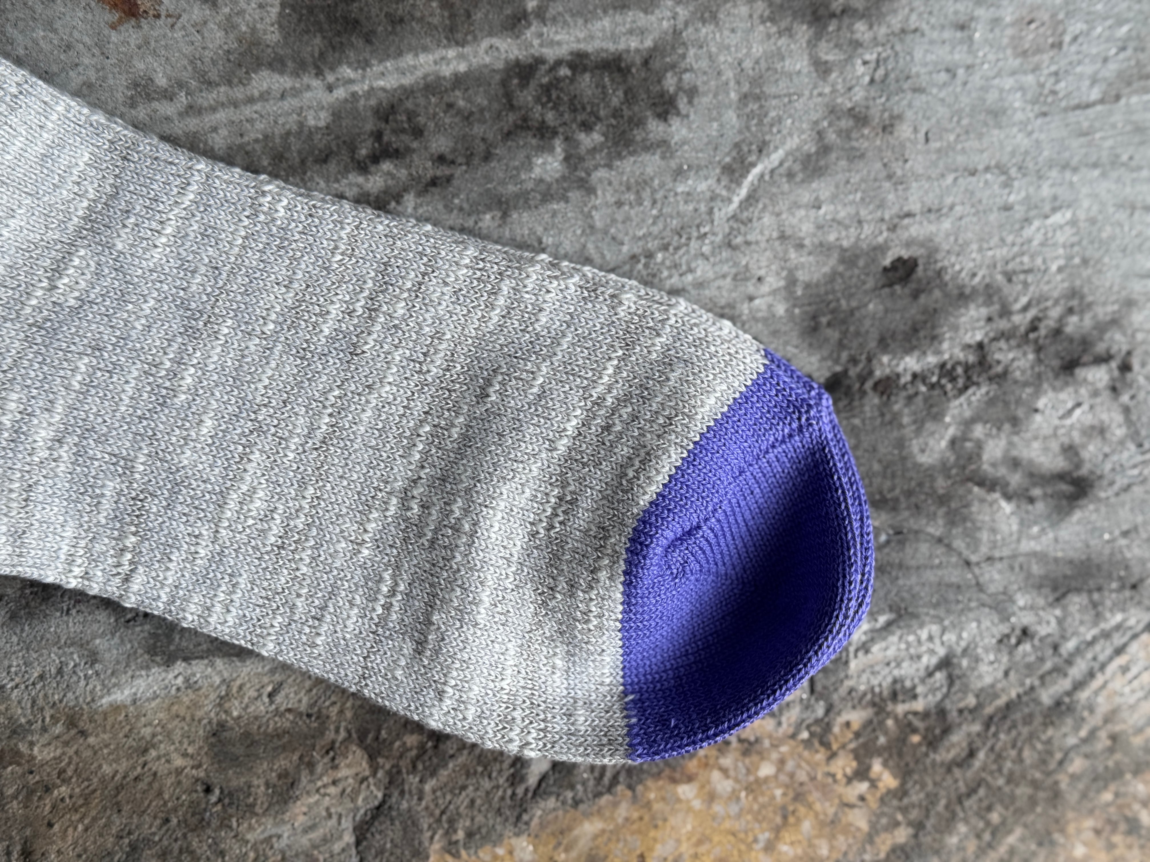 表情豊かなスラブ糸を使用したナチュラルな編み地に、つま先とかかとの配色切り替えをプラス。