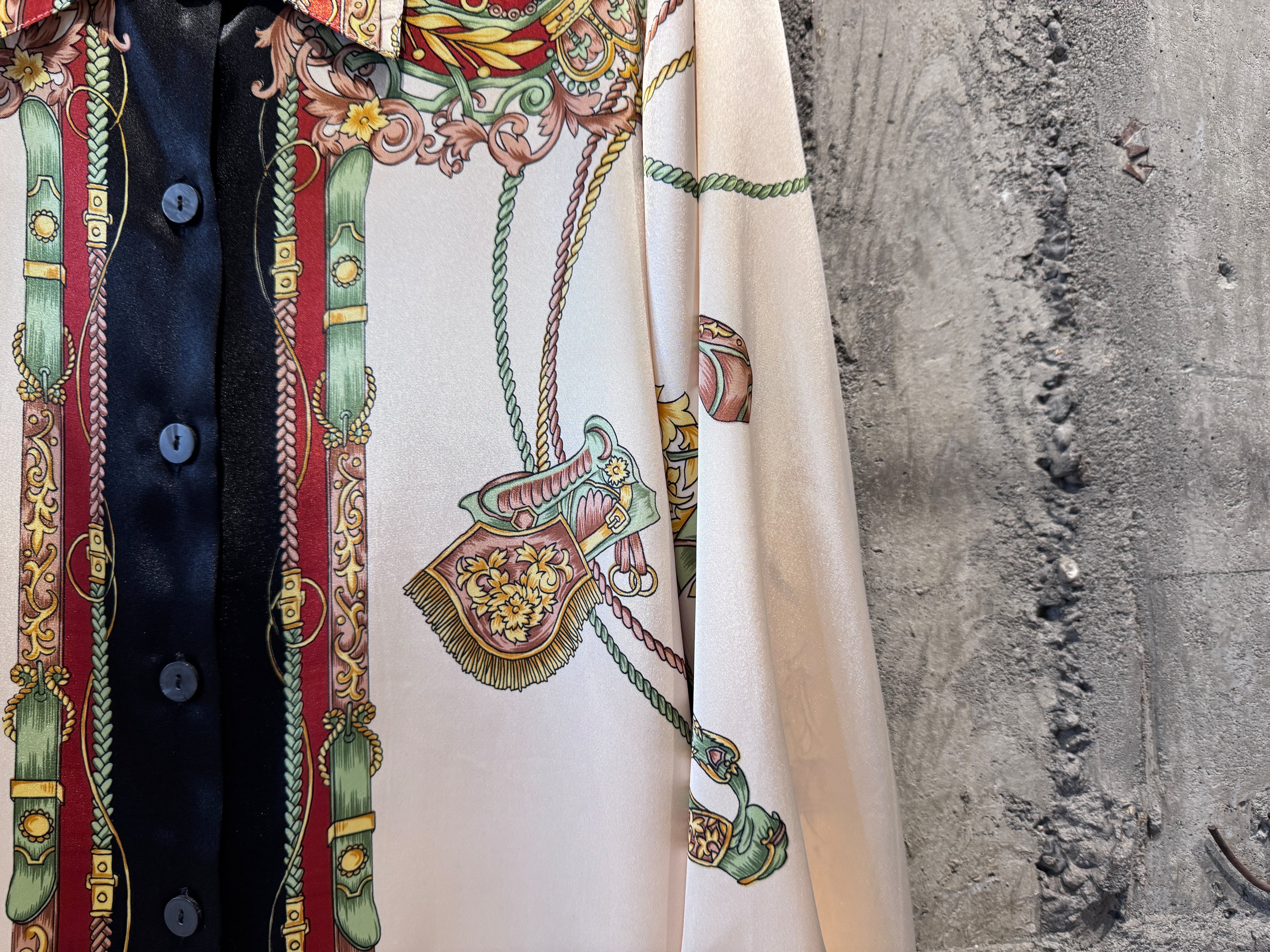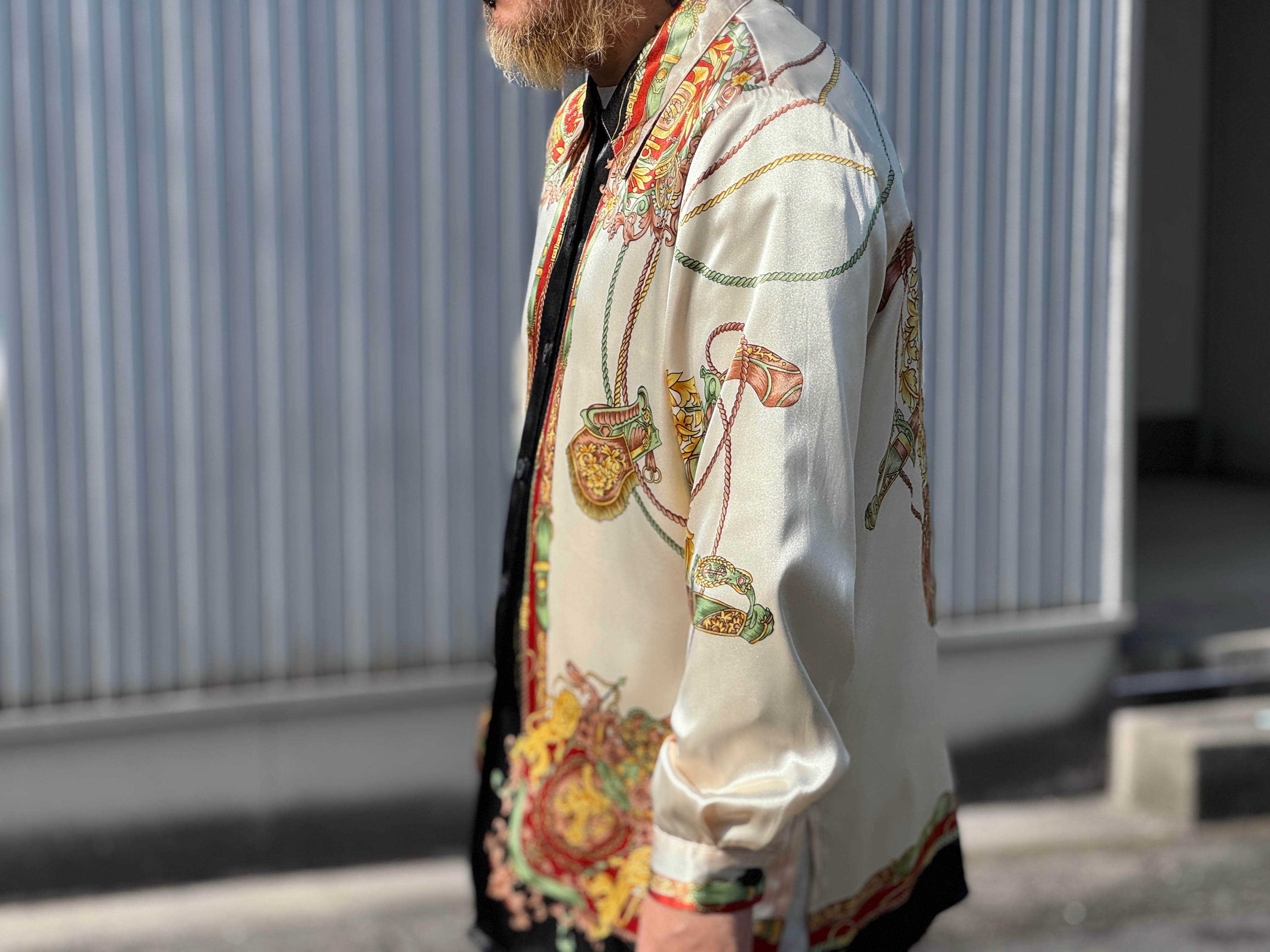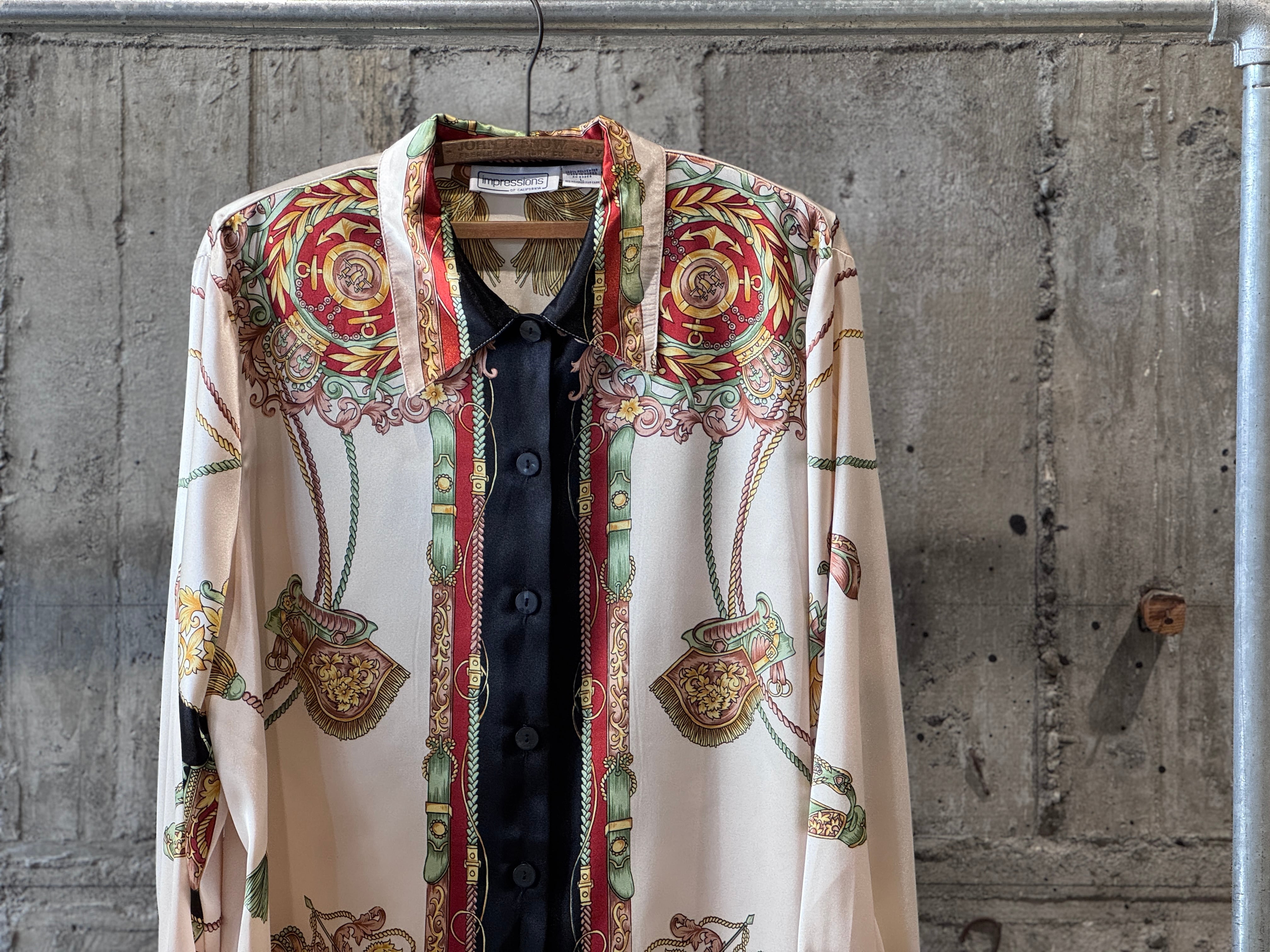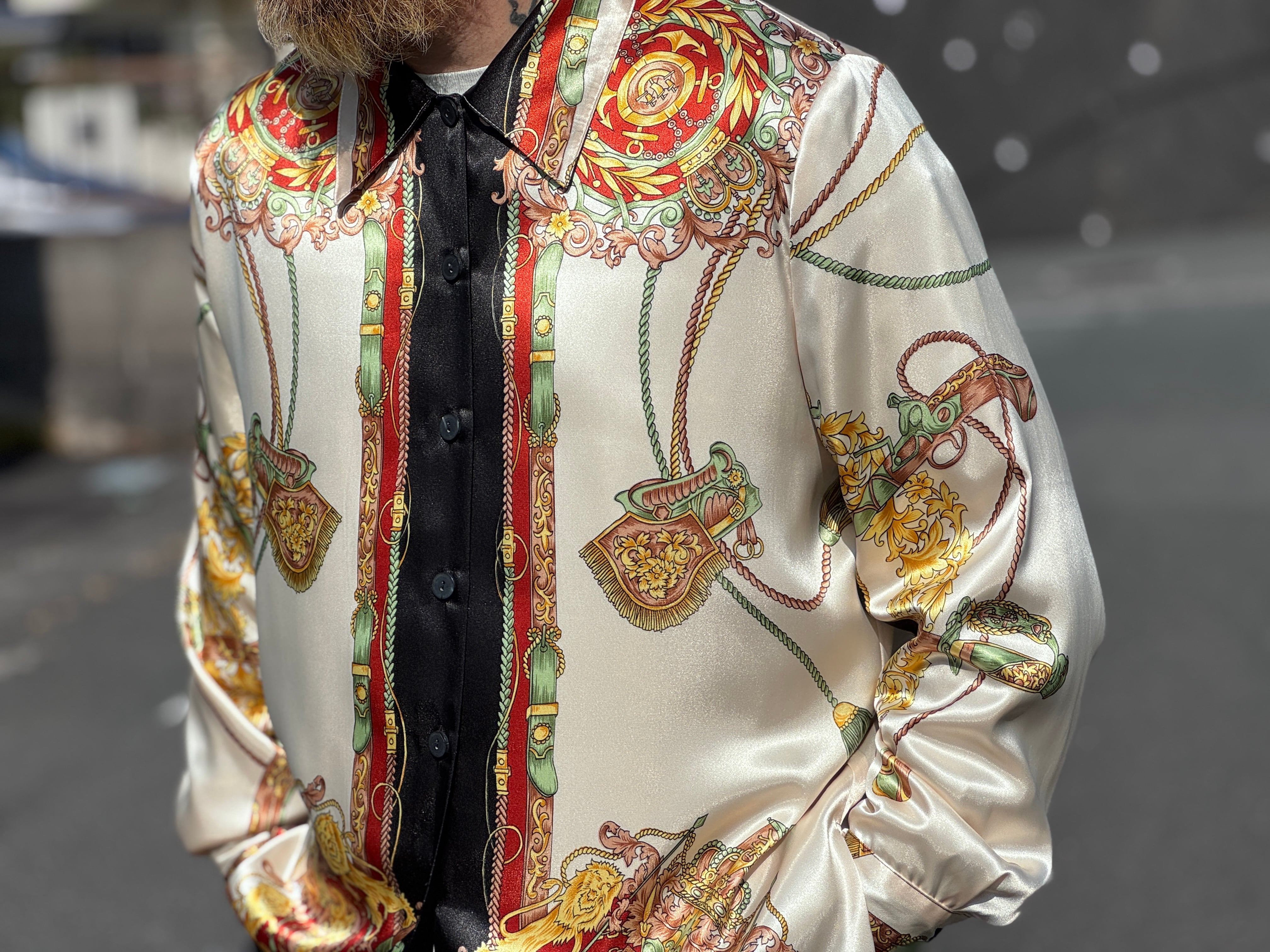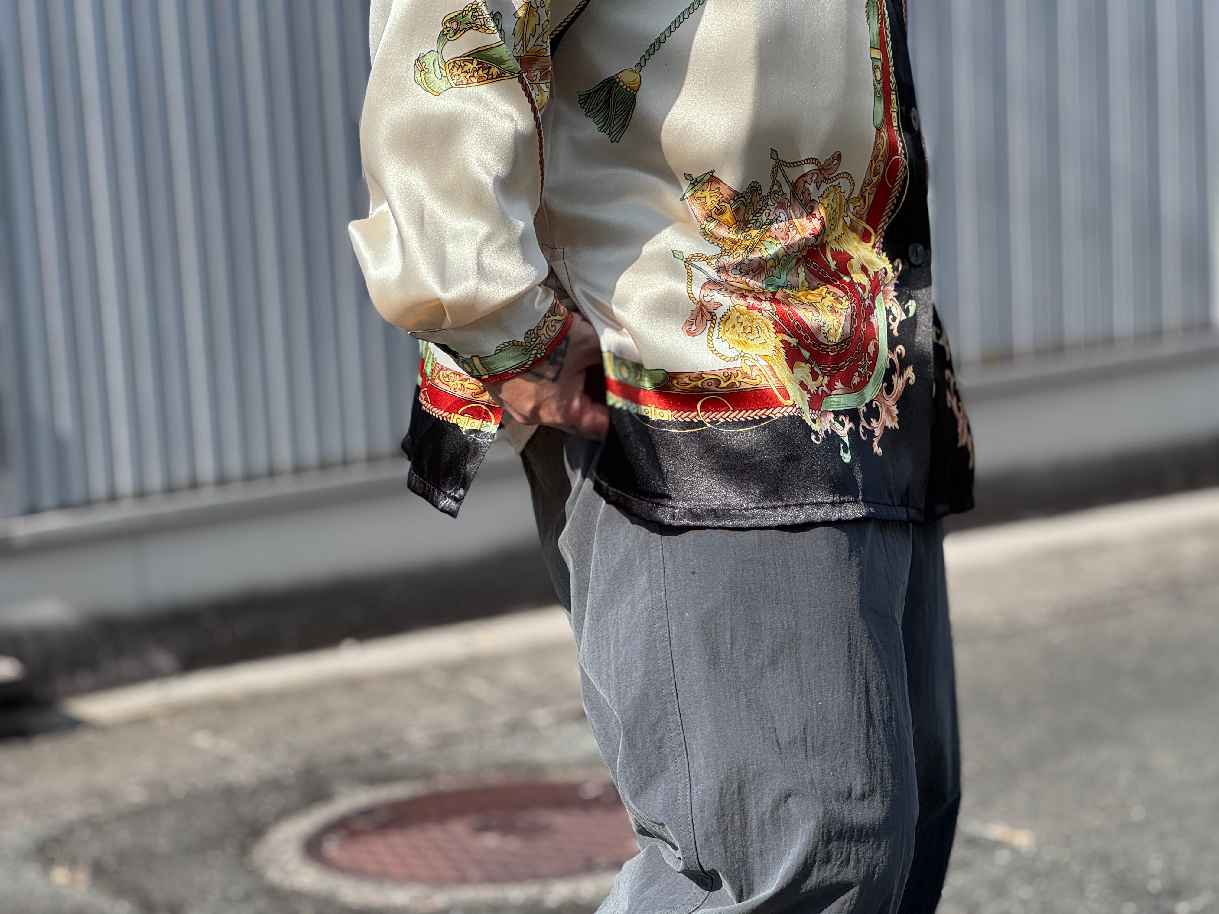 サテン生地のような光沢感があり、テロッとした生地感のデザインシャツ。