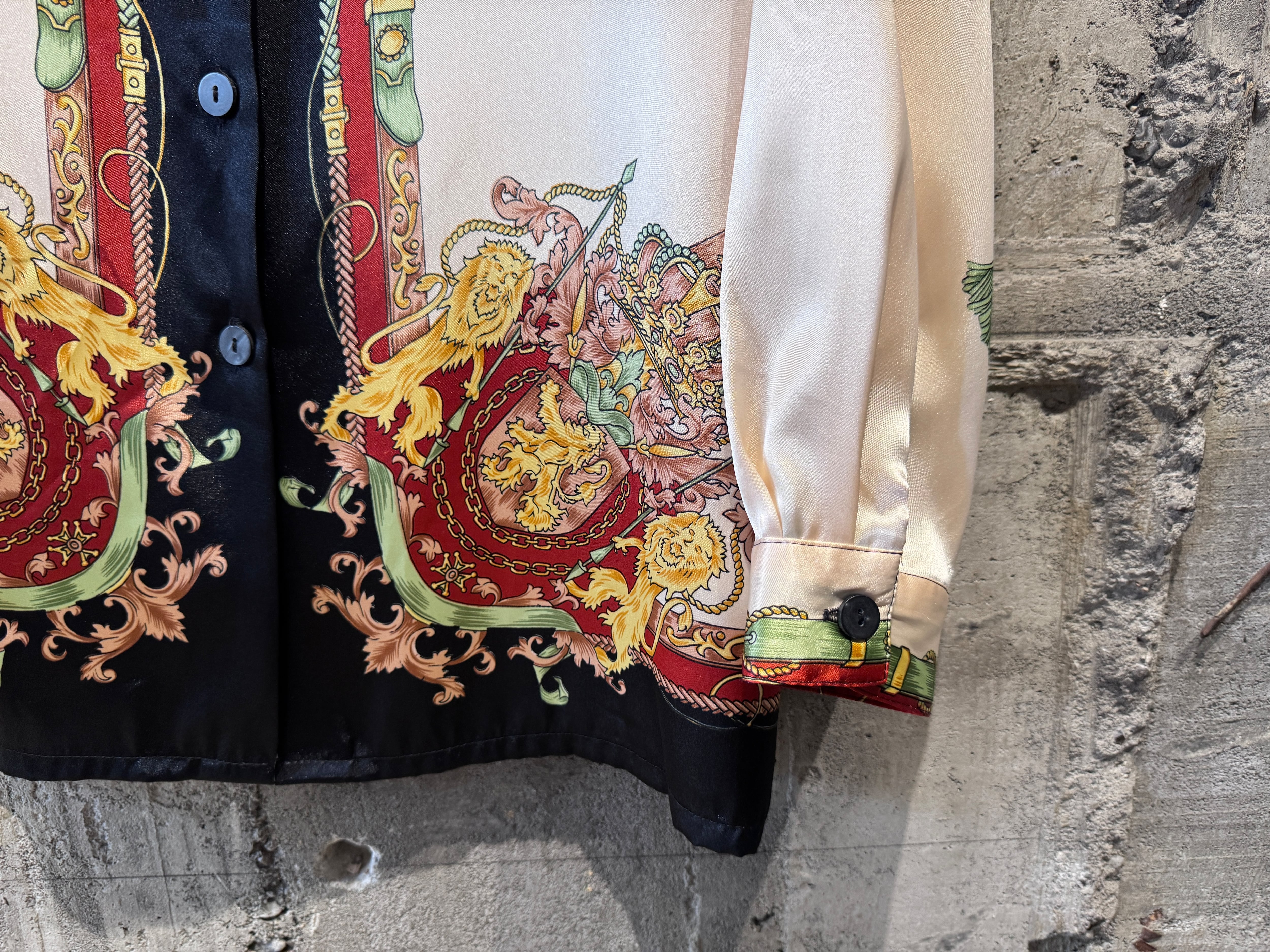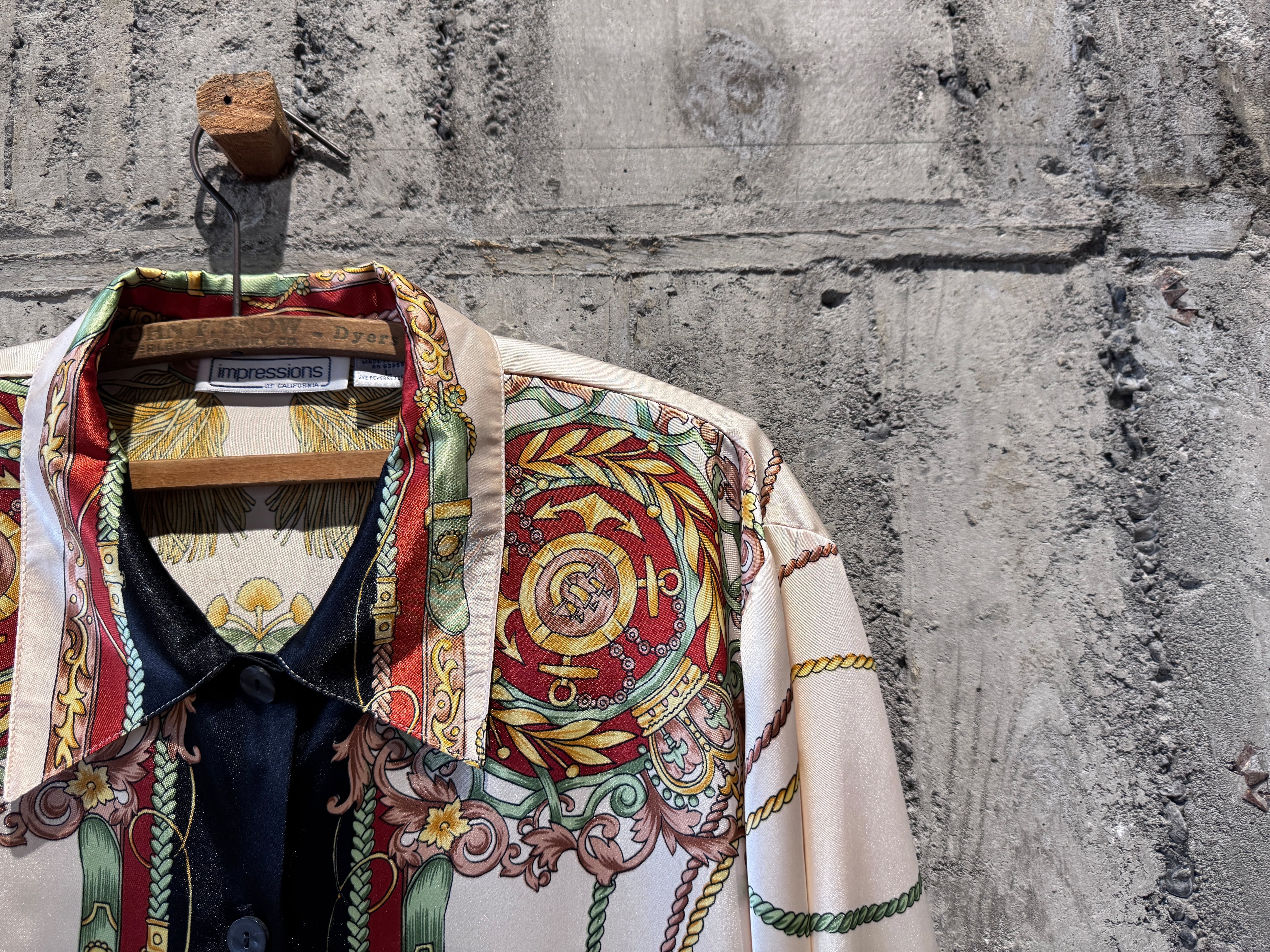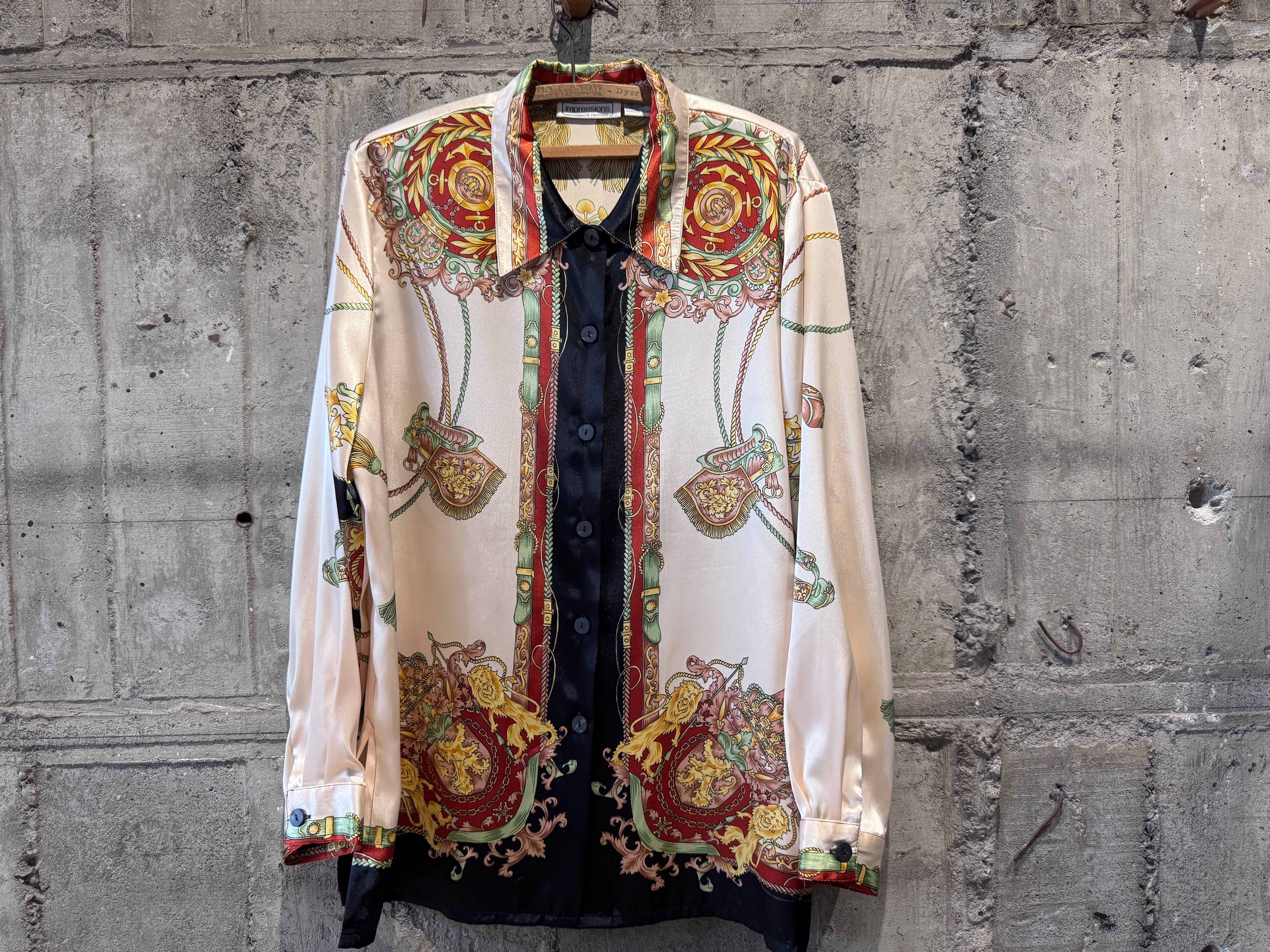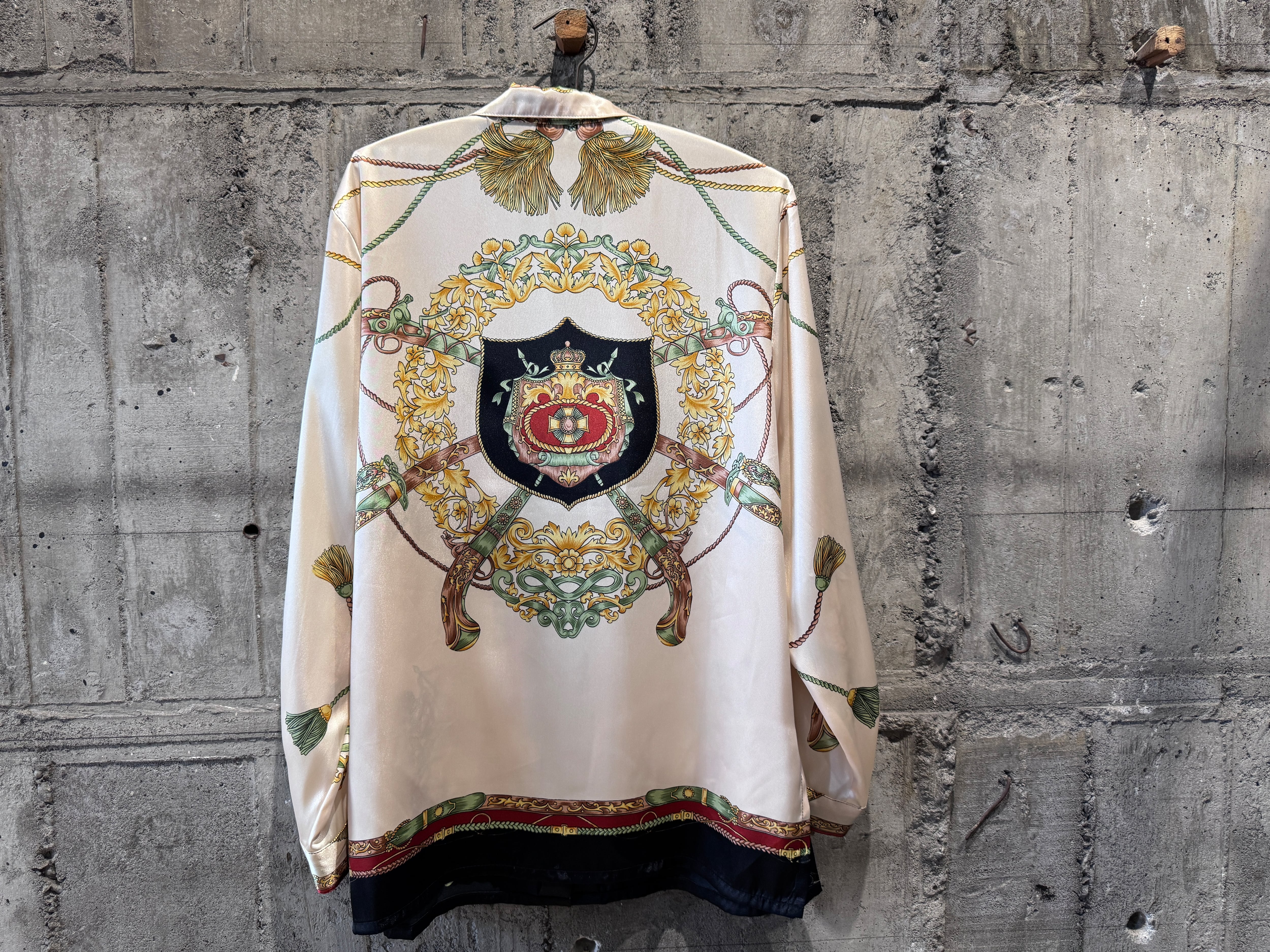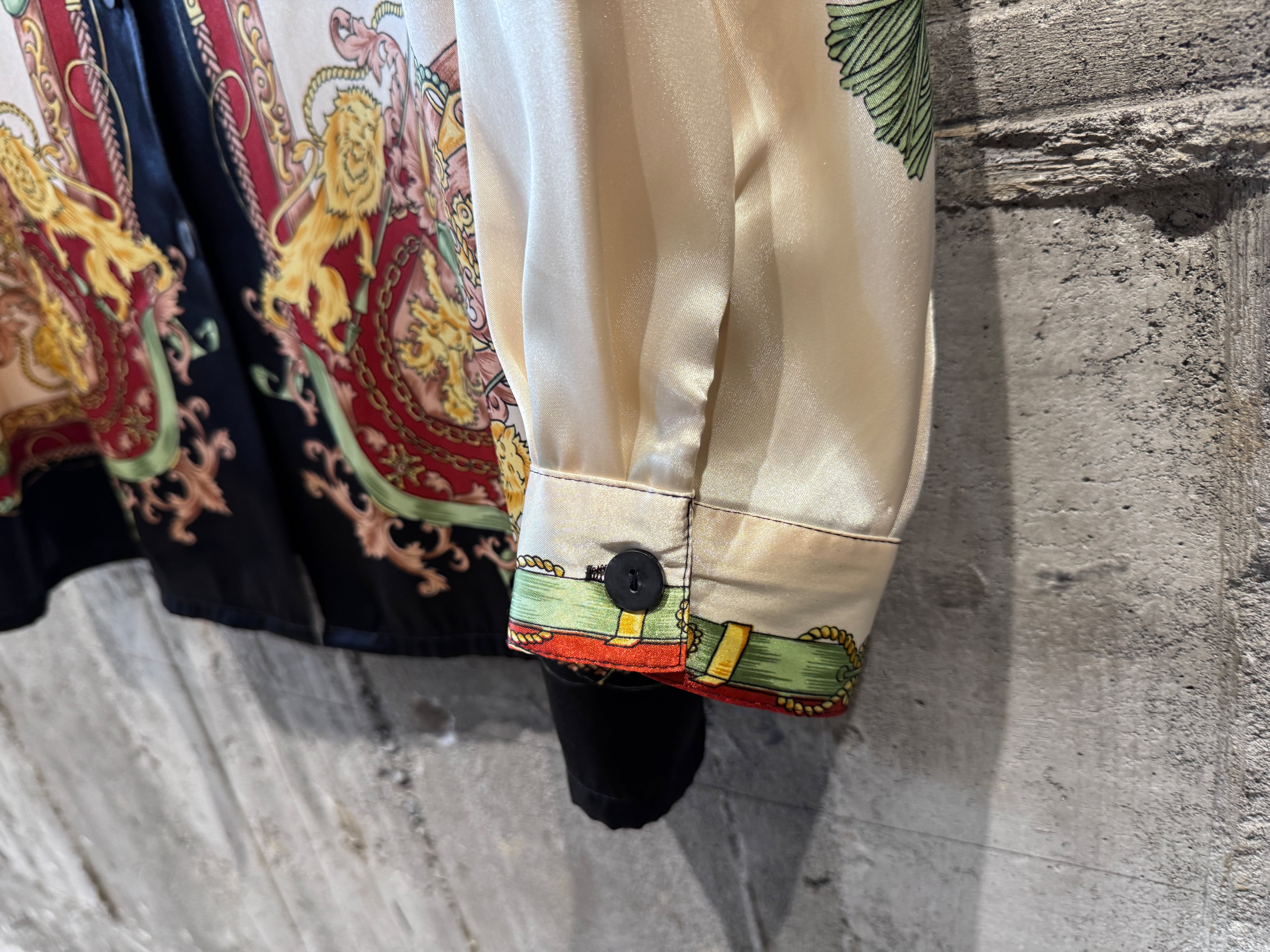 サテン生地のような光沢感があり、テロッとした生地感のデザインシャツ。