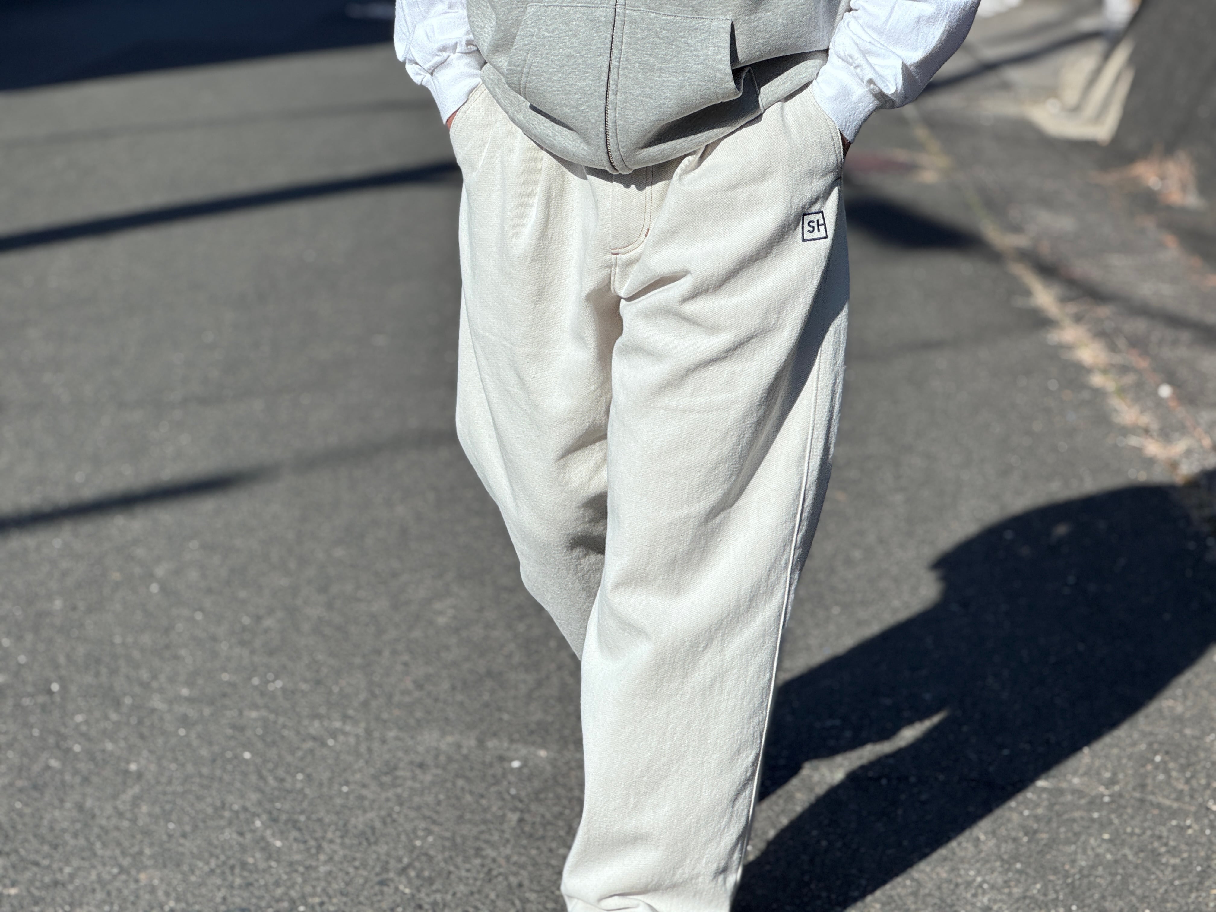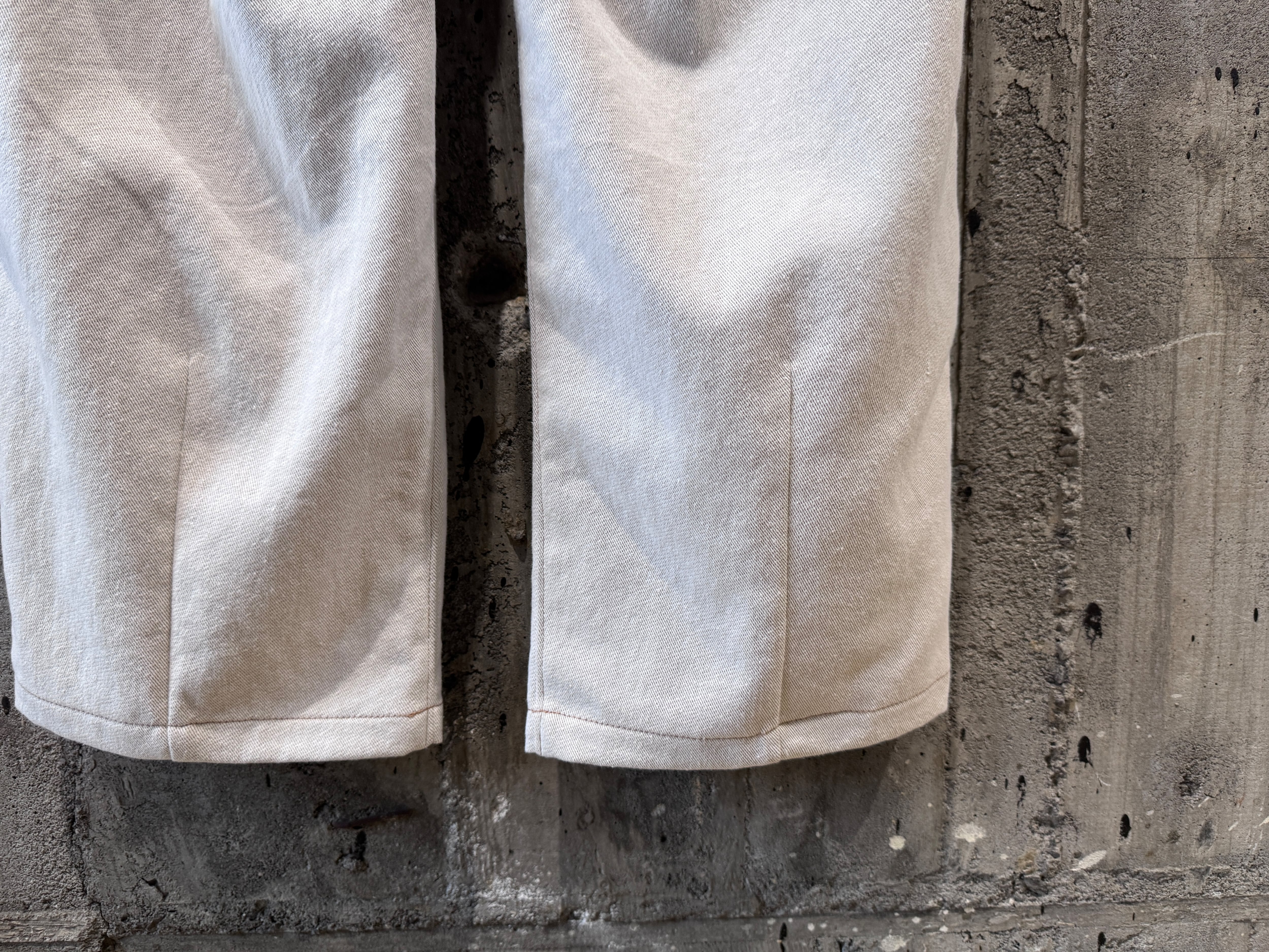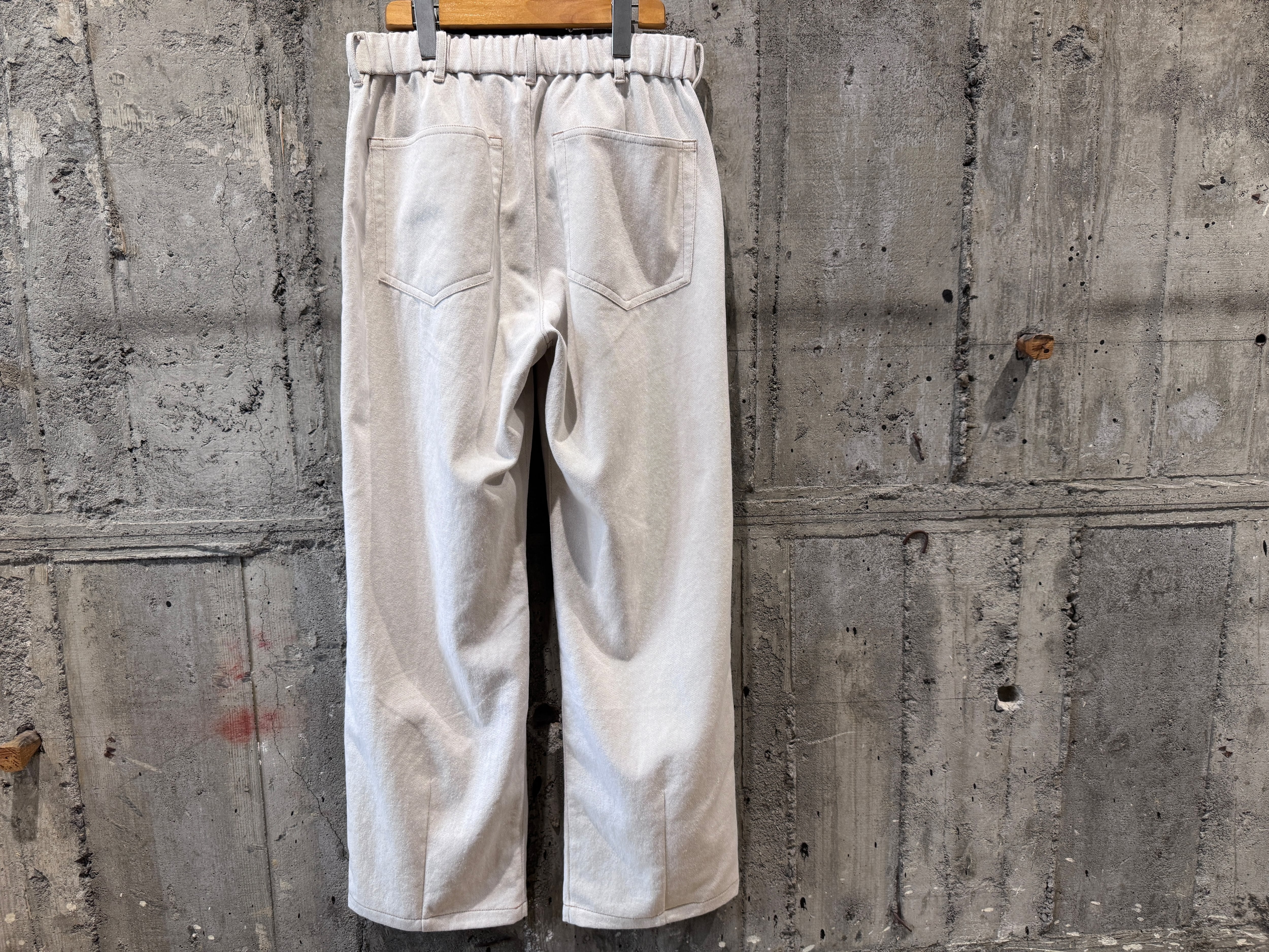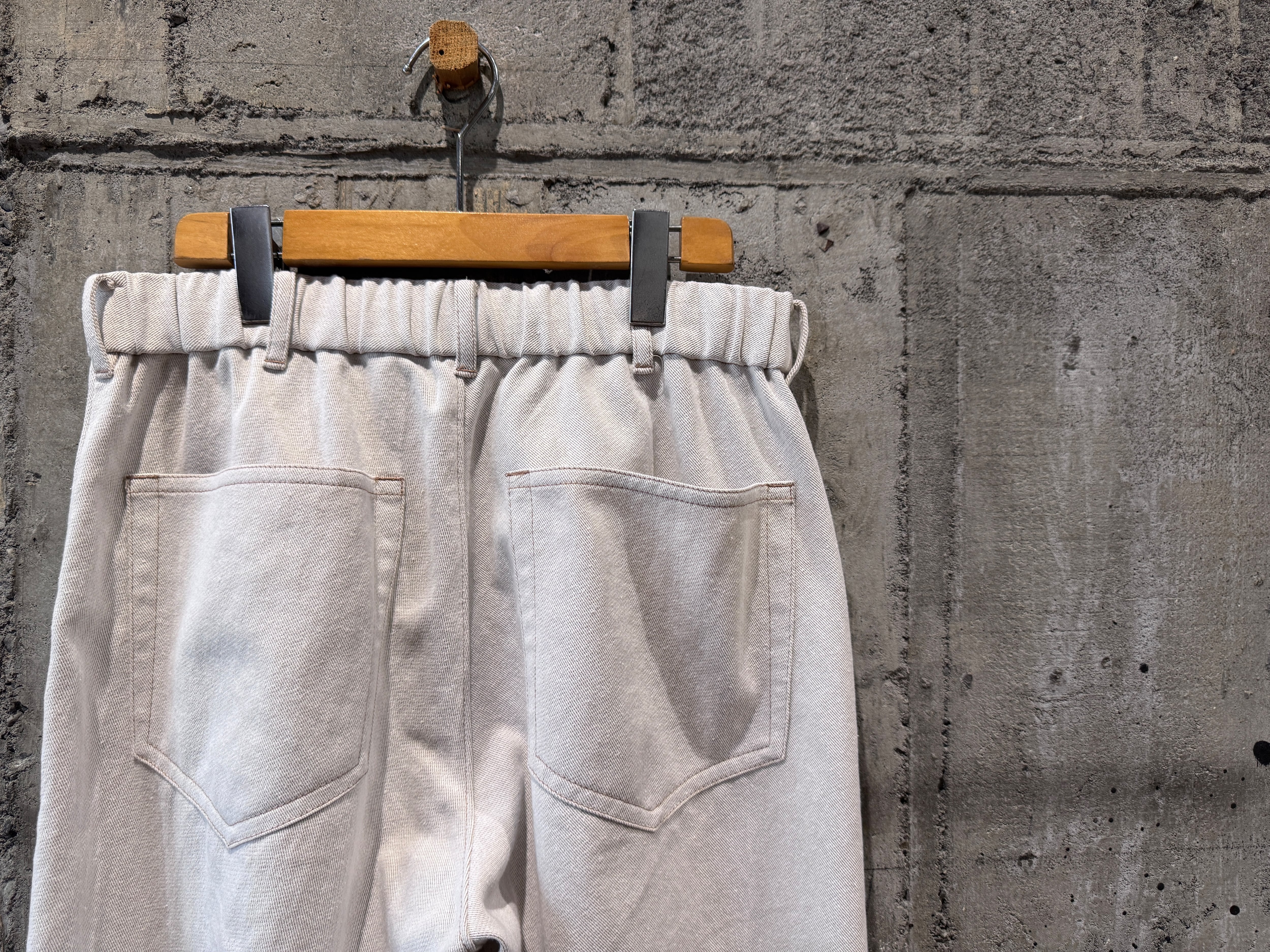腰回りに入れたタックでゆとりを出し、腰部分をゴム仕様にする事でイージーな穿き心地。そして裾にはダーツを加え、より定番物とは異なるシルエットを表現。