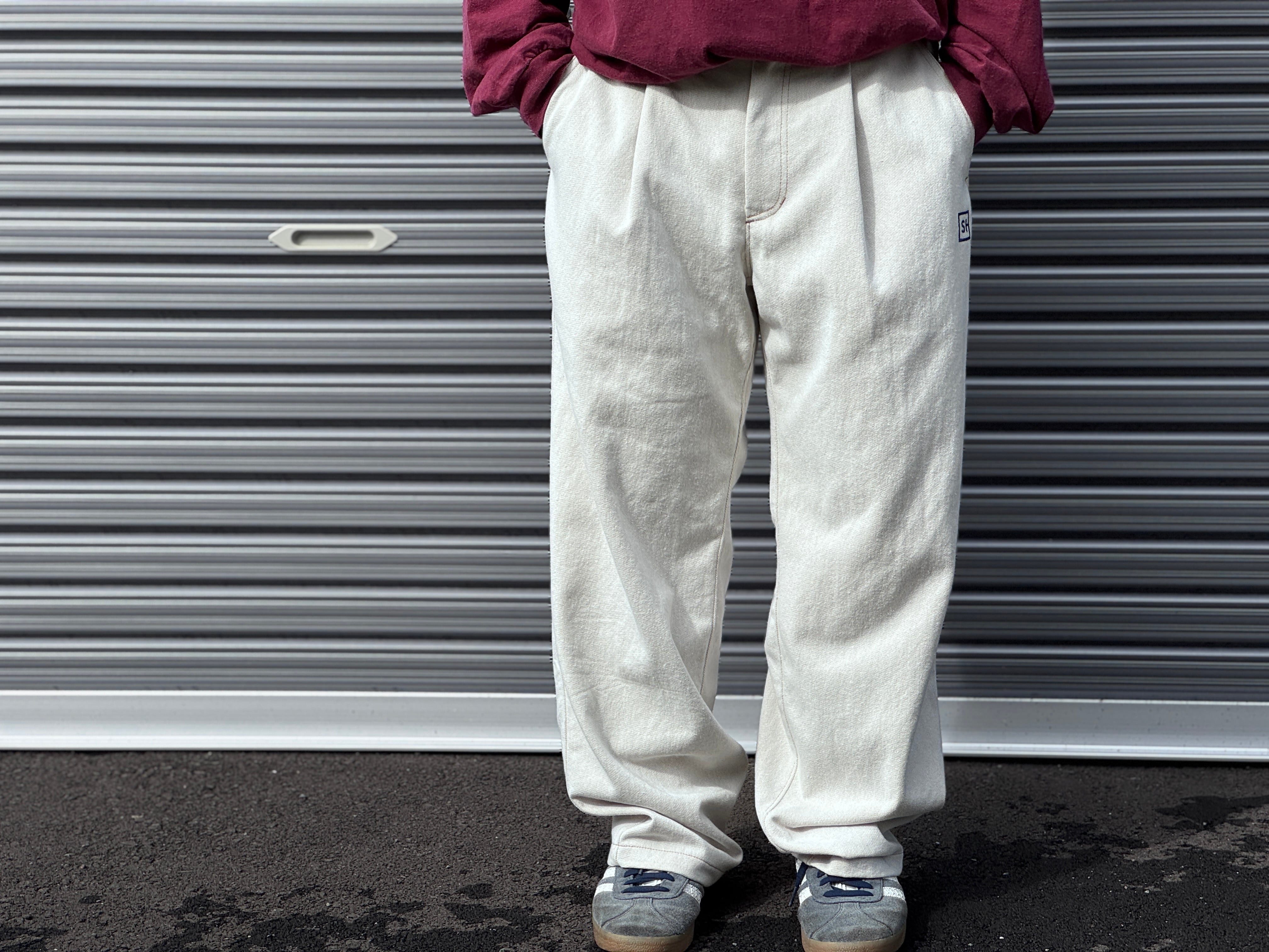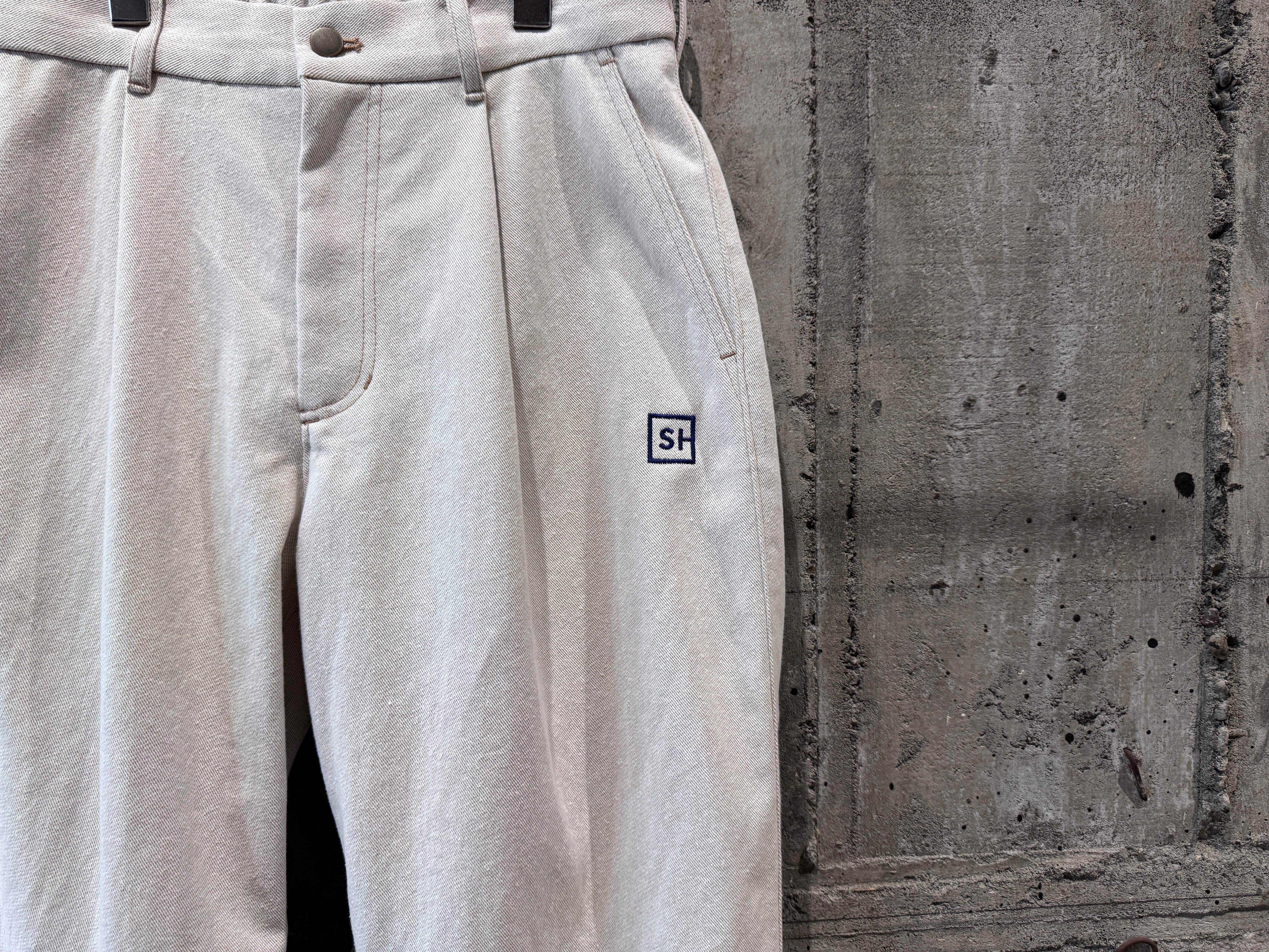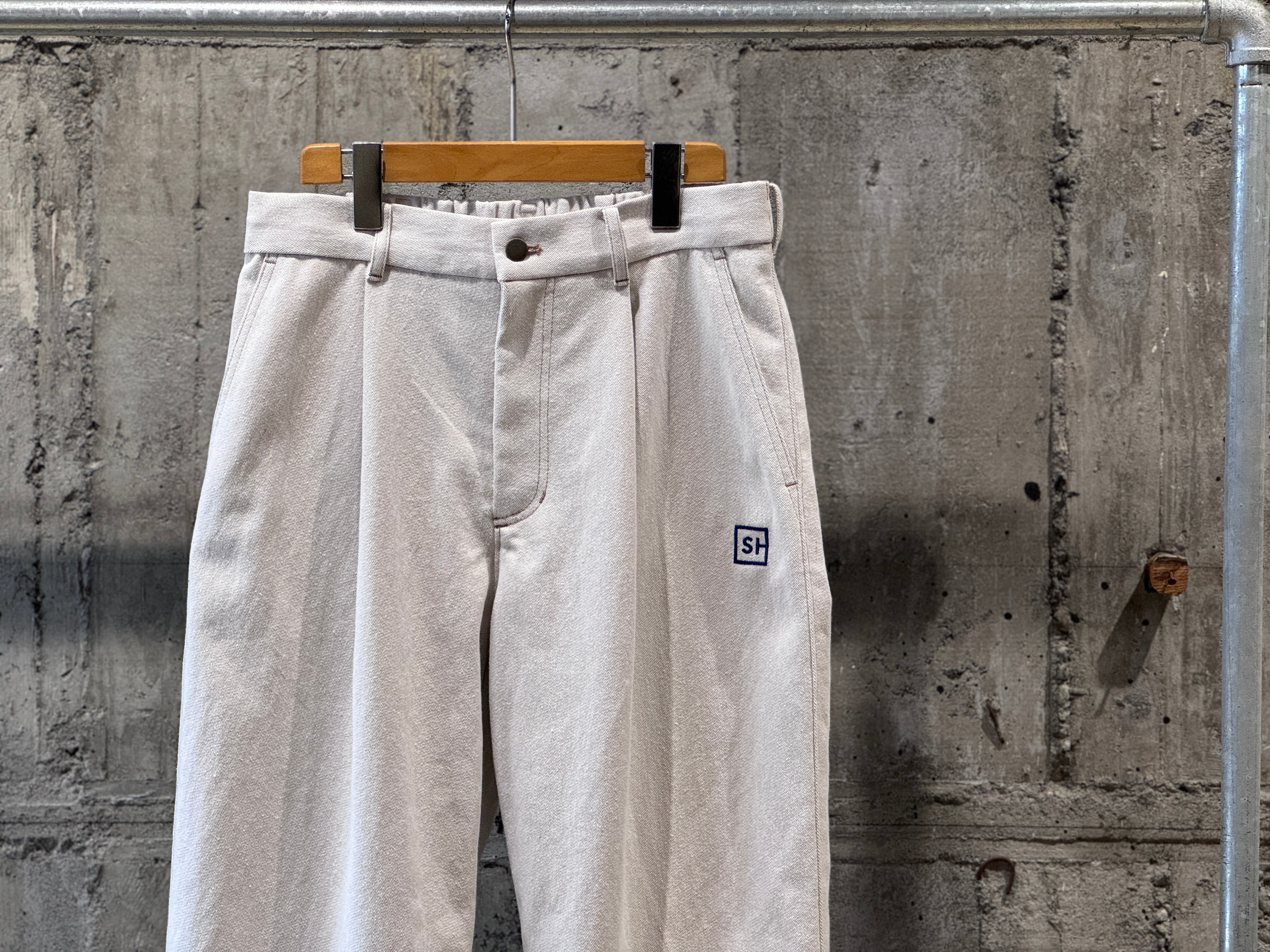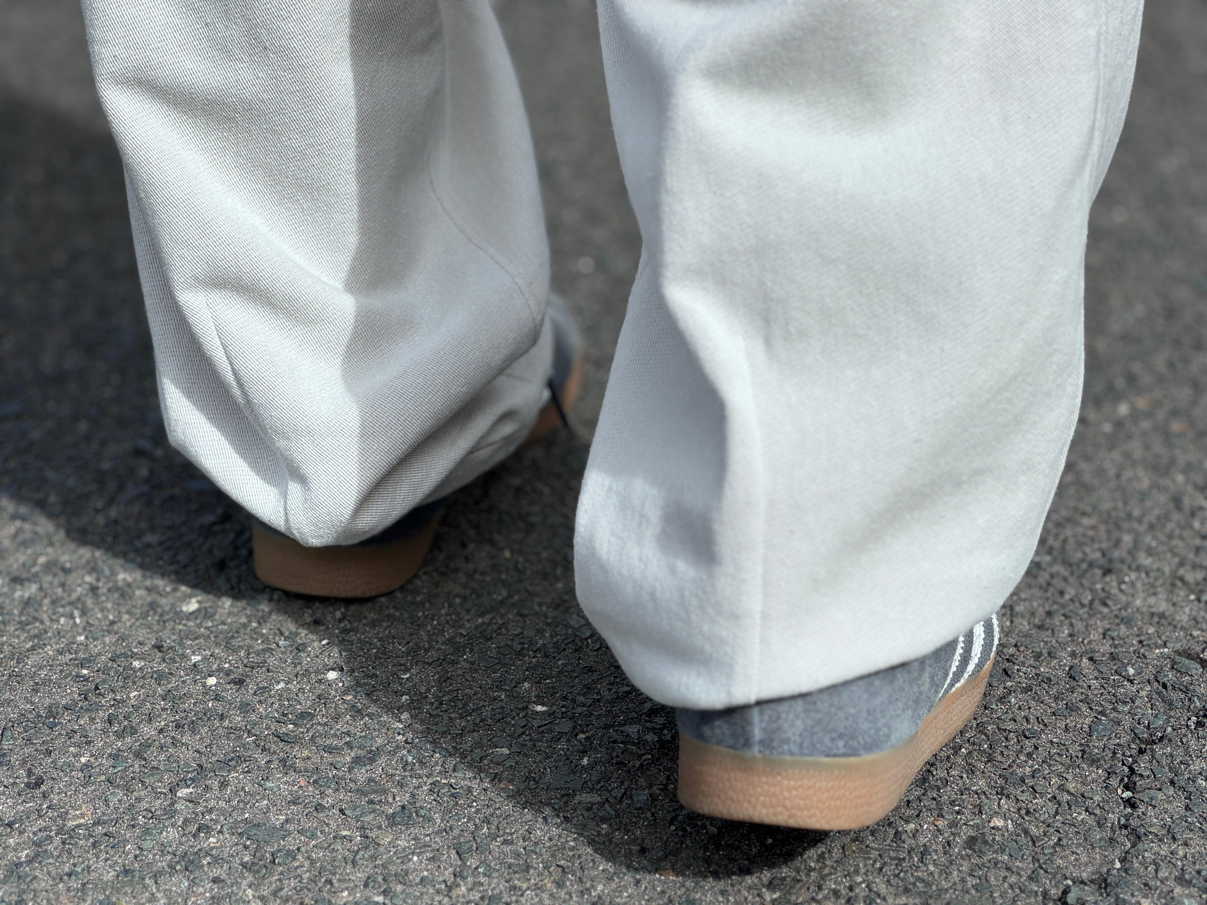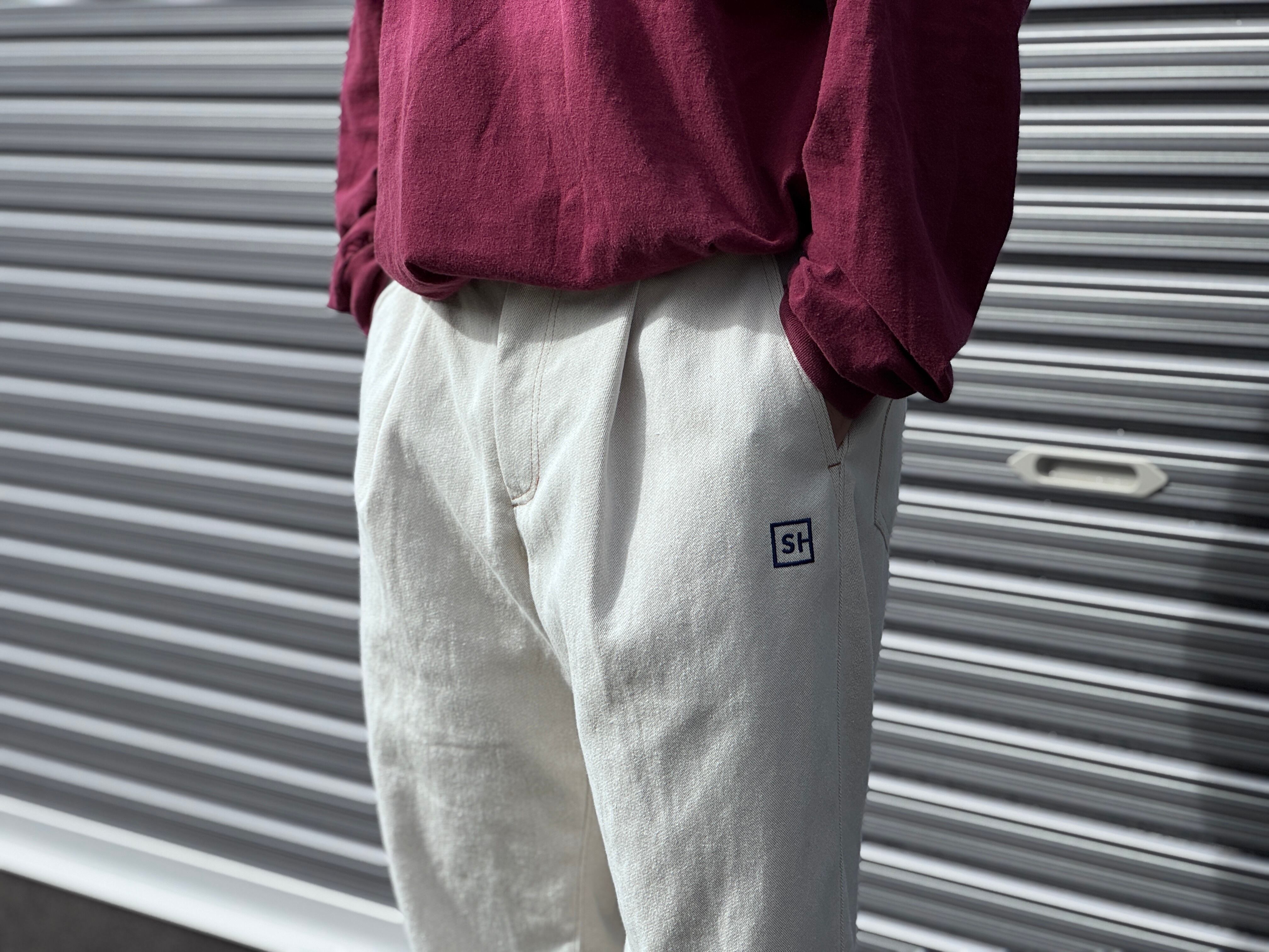 腰回りに入れたタックでゆとりを出し、腰部分をゴム仕様にする事でイージーな穿き心地。そして裾にはダーツを加え、より定番物とは異なるシルエットを表現。