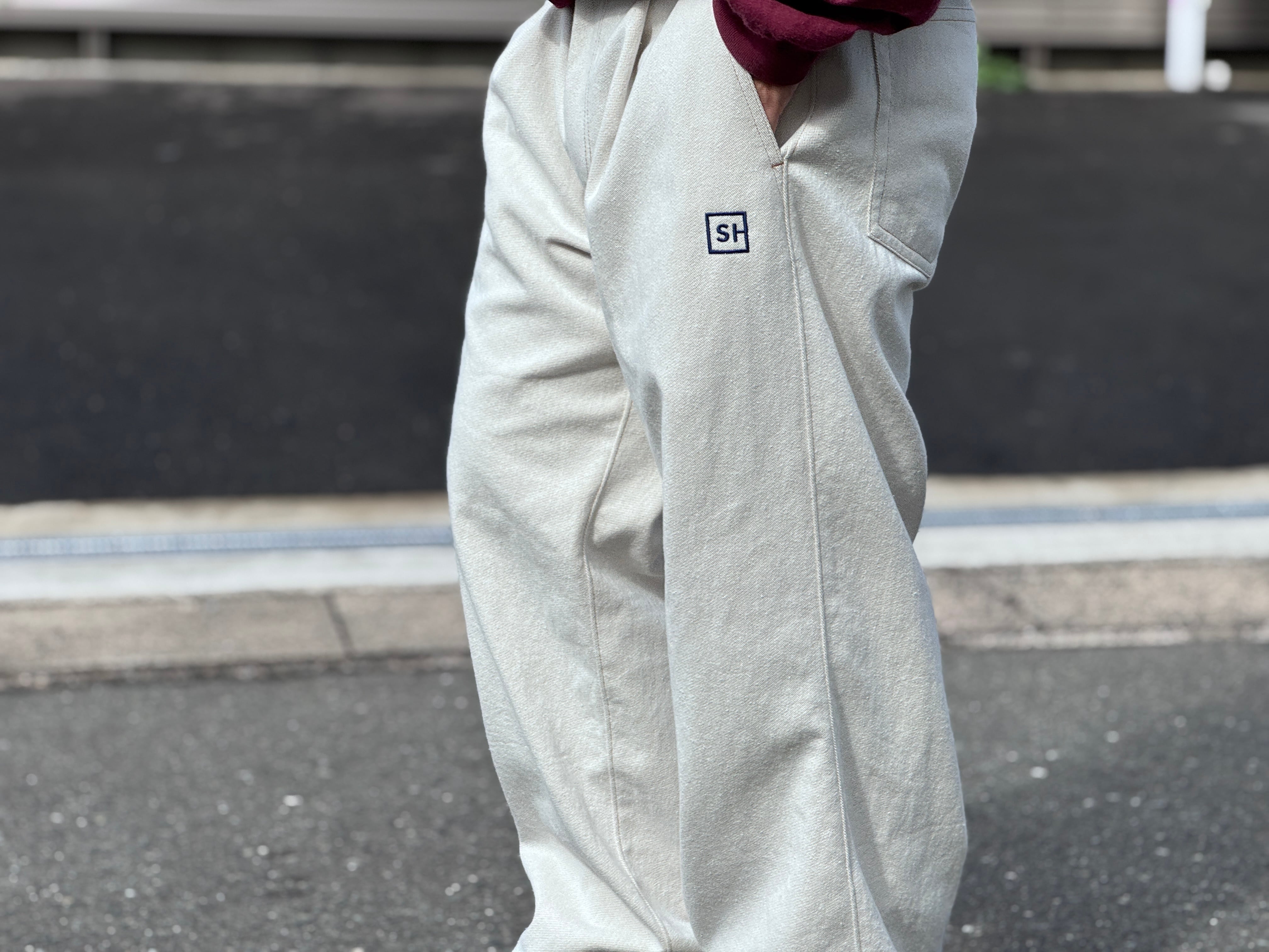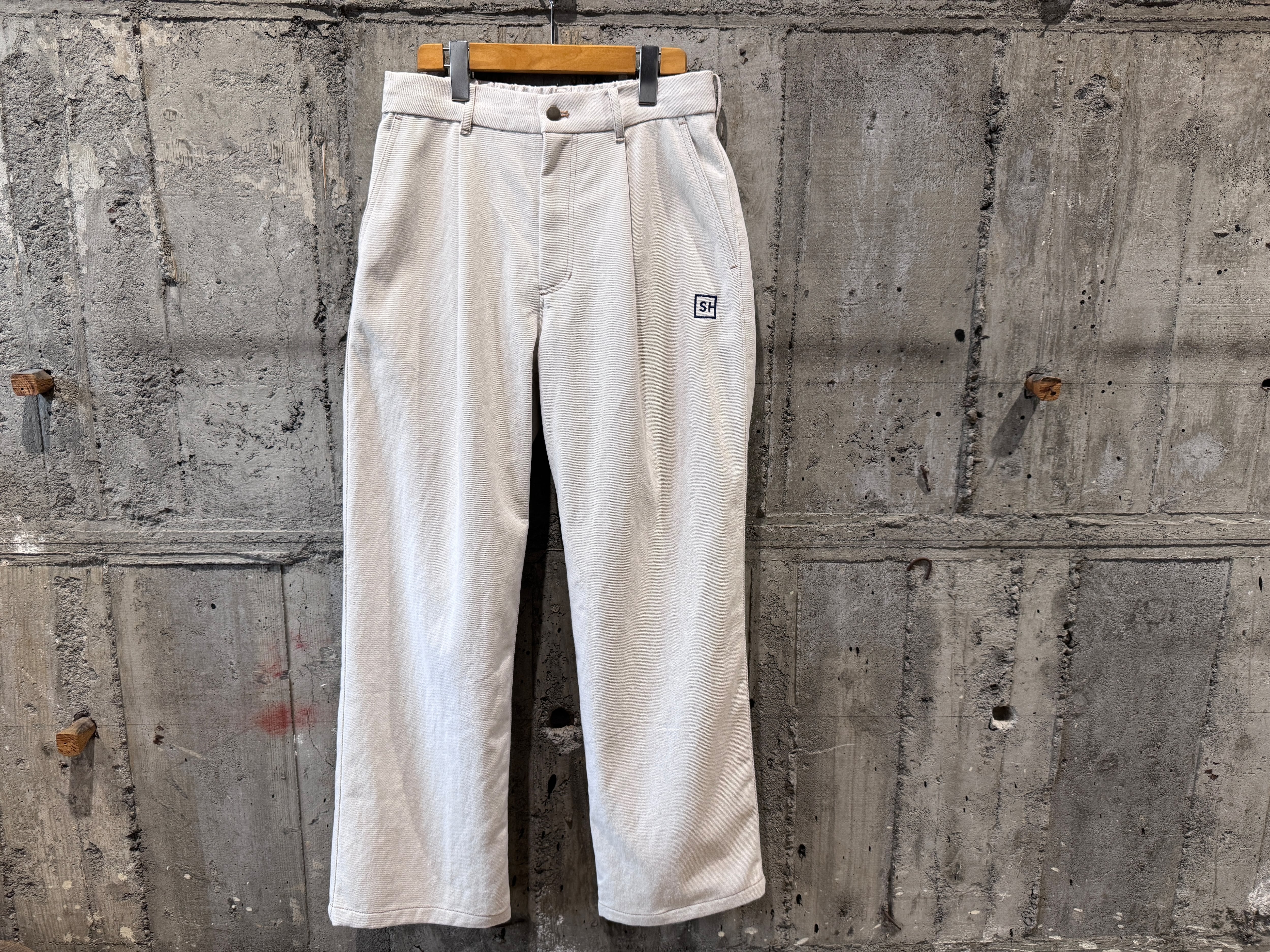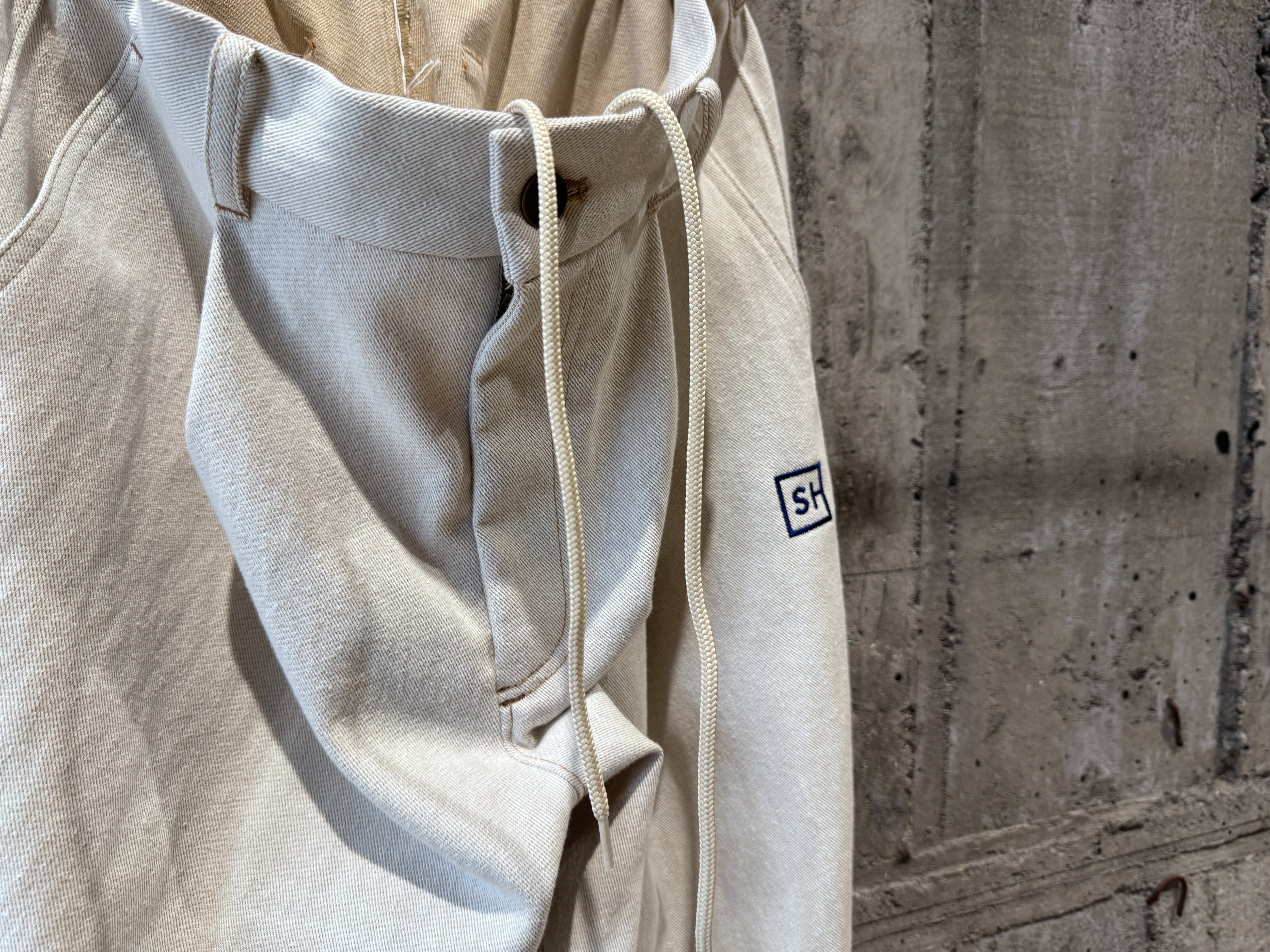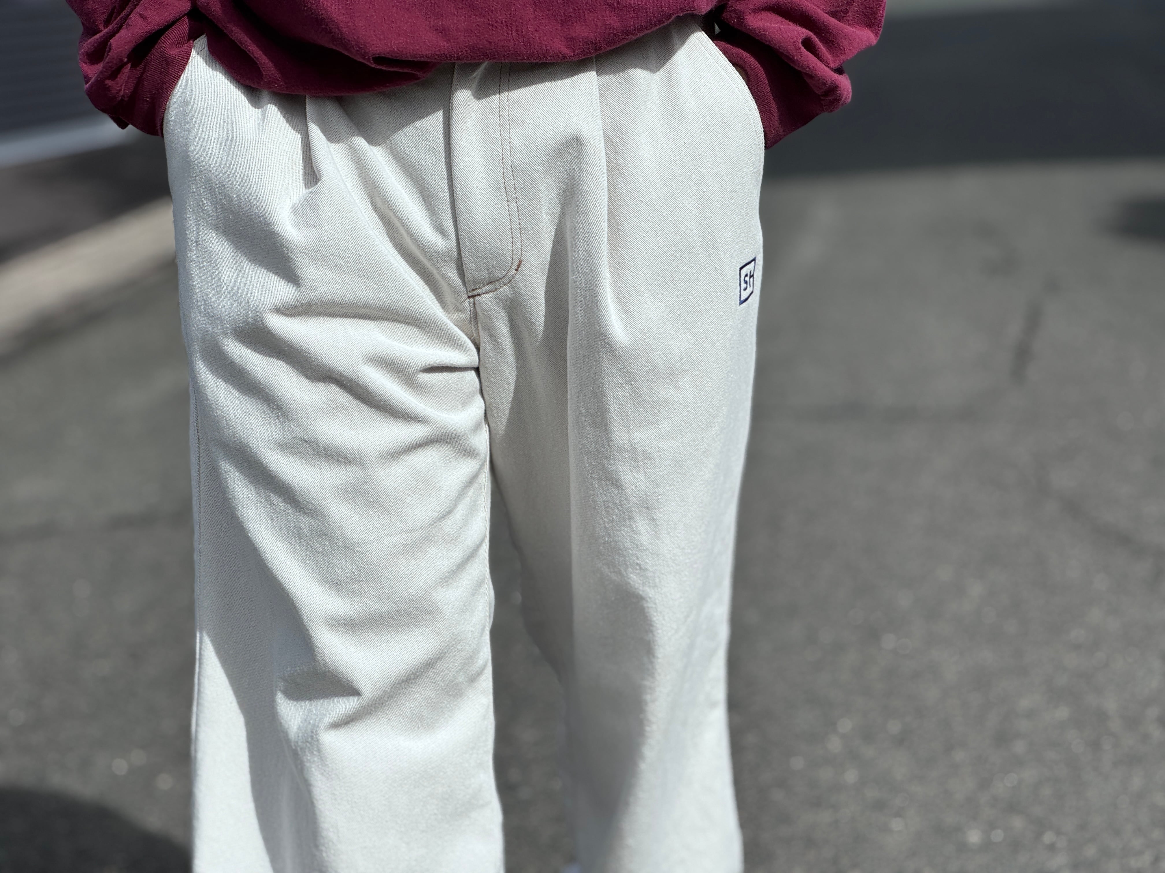 腰回りに入れたタックでゆとりを出し、腰部分をゴム仕様にする事でイージーな穿き心地。そして裾にはダーツを加え、より定番物とは異なるシルエットを表現。