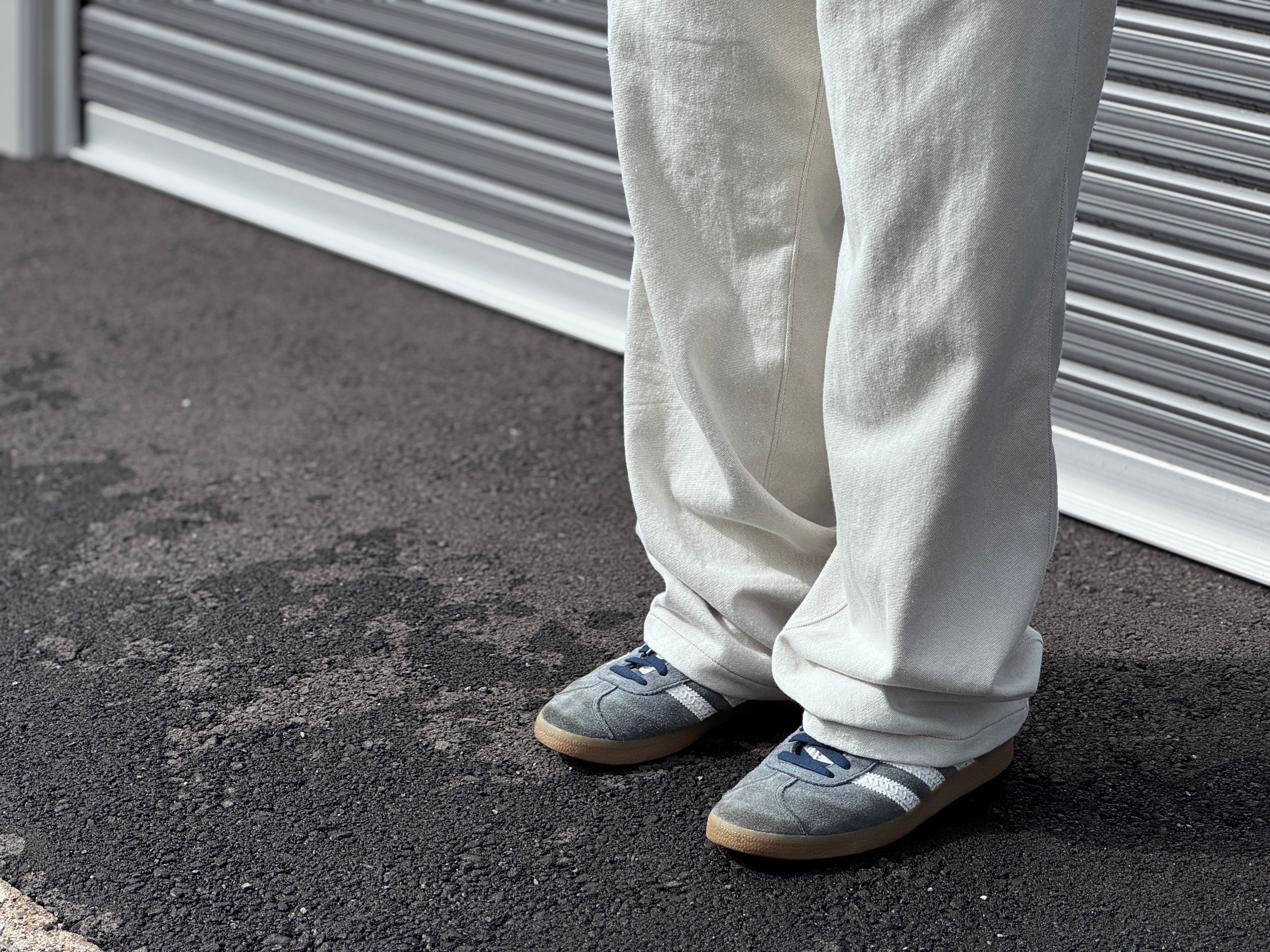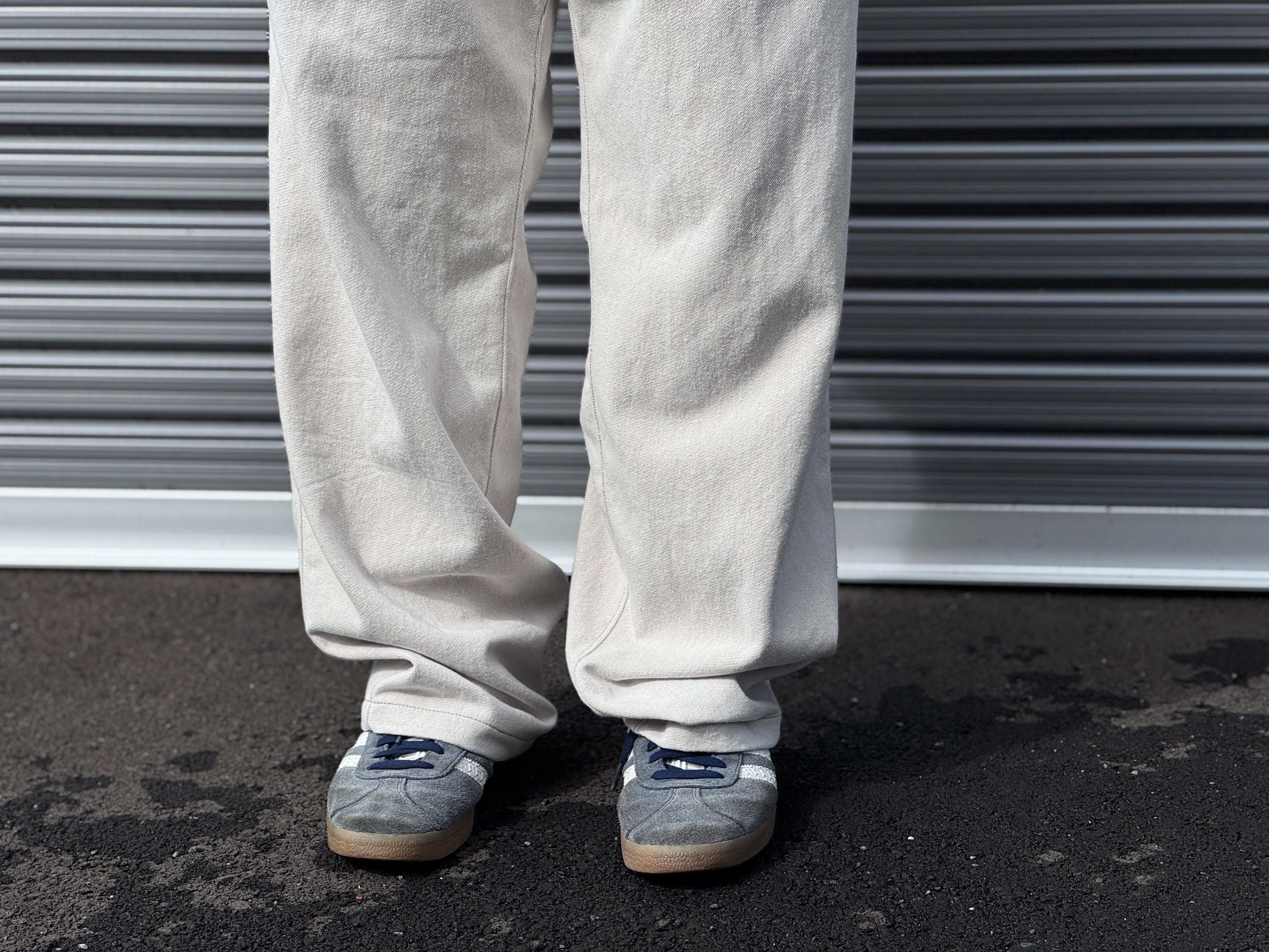 吸水性が高く(汗をかいてもベトつかない)、そしてシワになりにくいTCデニム生地でカーブパンツを作りました。