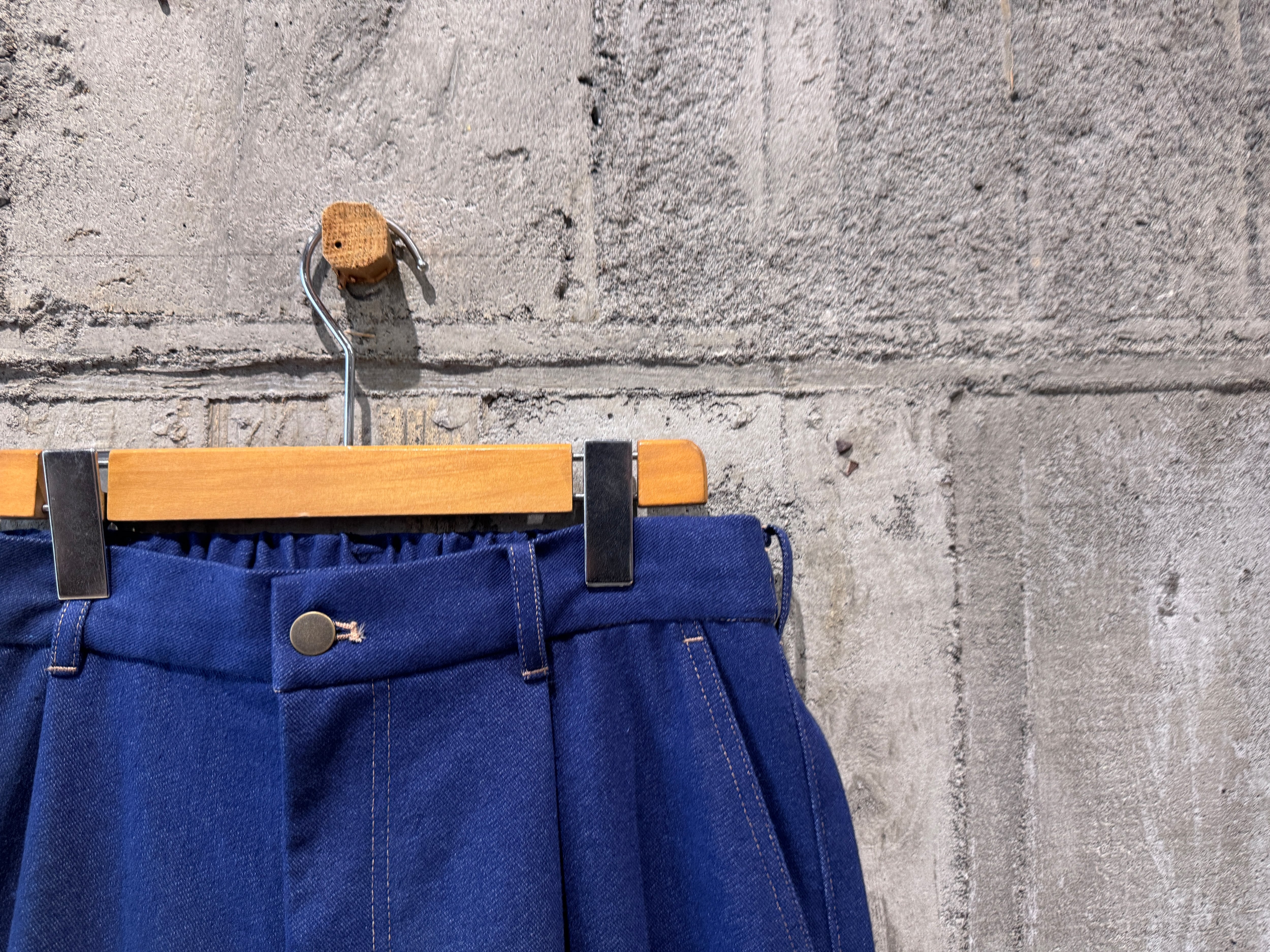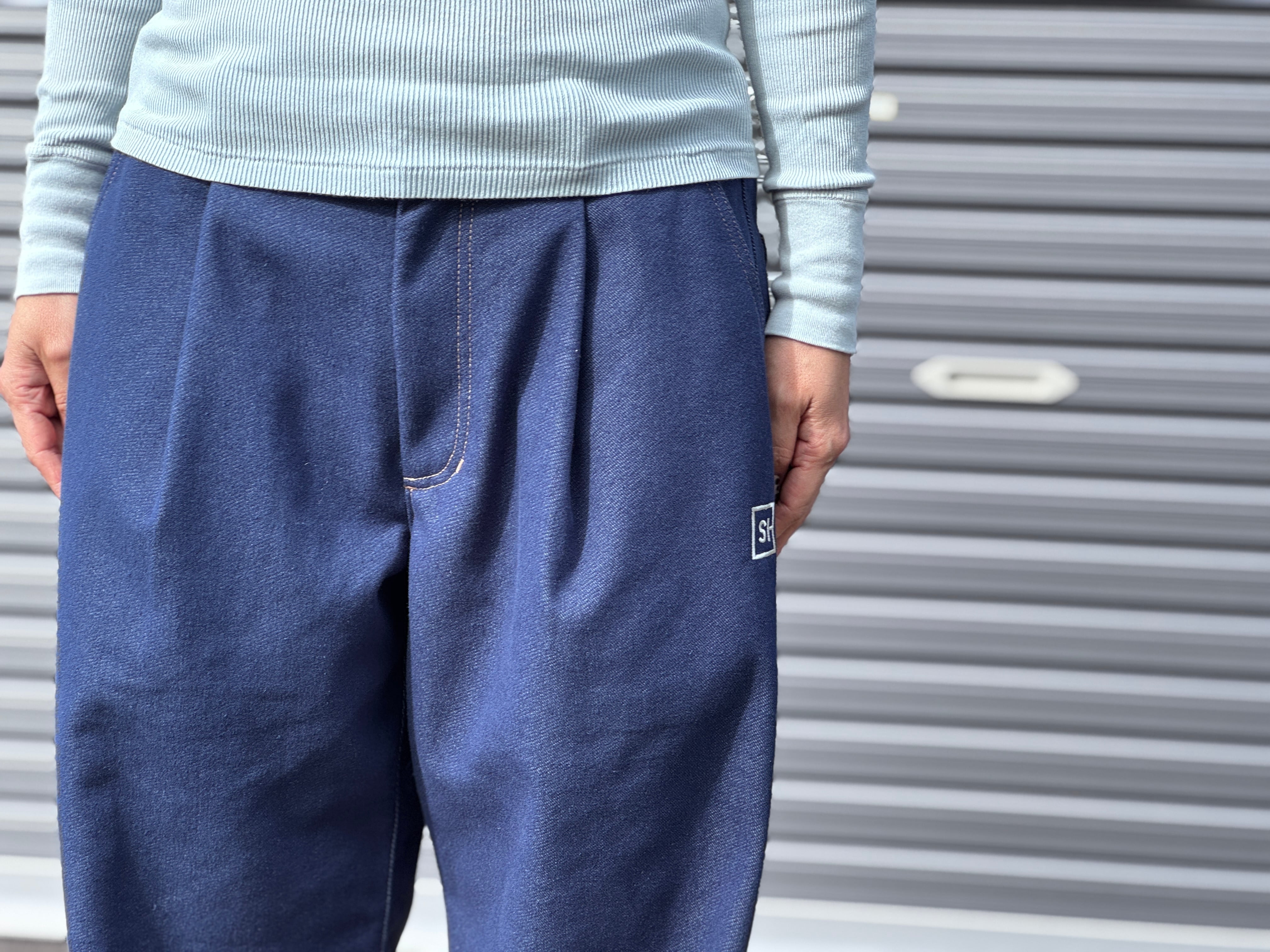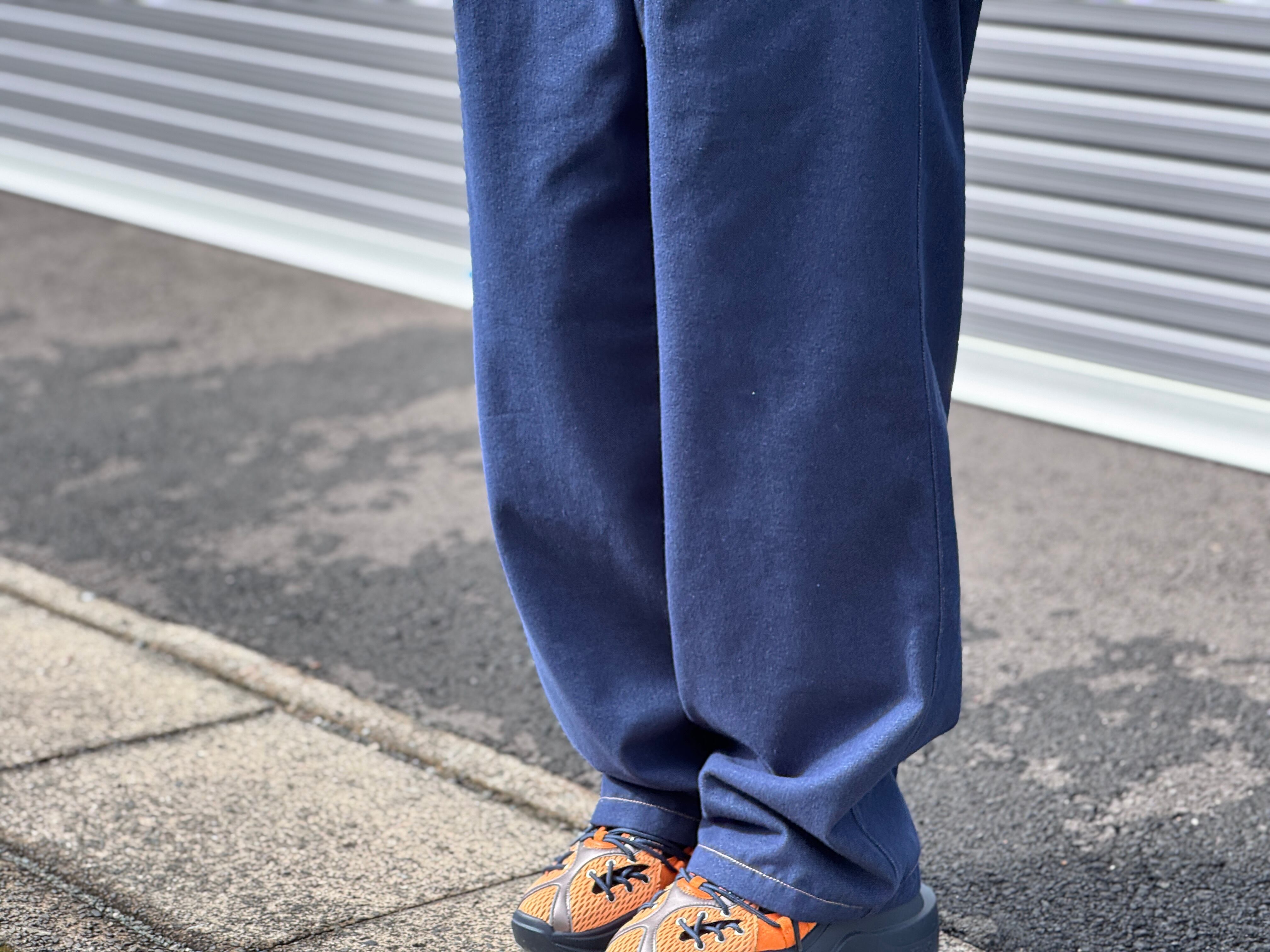 腰回りに入れたタックでゆとりを出し、腰部分をゴム仕様にする事でイージーな穿き心地。そして裾にはダーツを加え、より定番物とは異なるシルエットを表現。