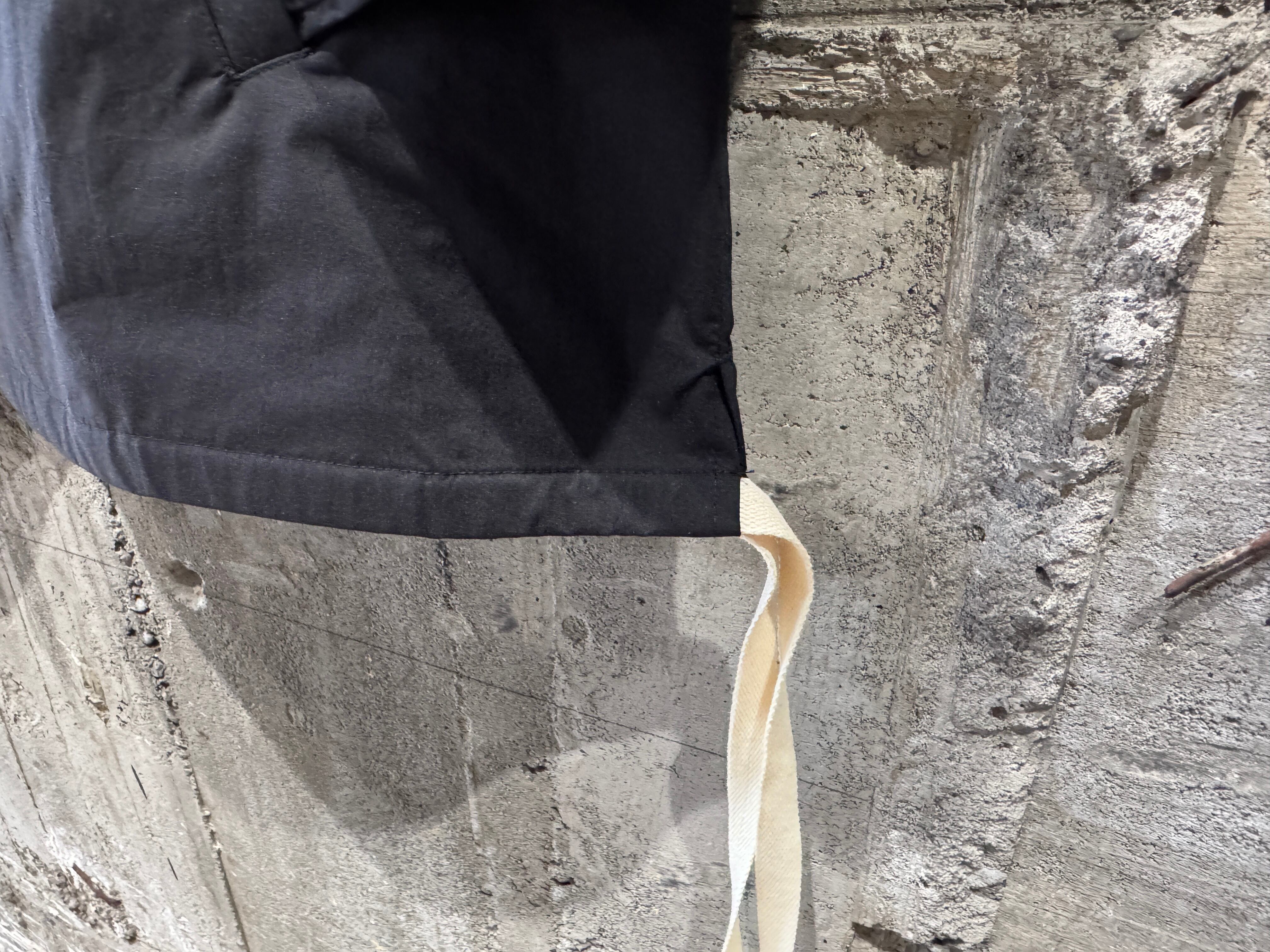 両サイド裾に綾テープを施し、そのままでアクセントに、絞ってシルエットに丸みをもたせての着用が楽しめます。