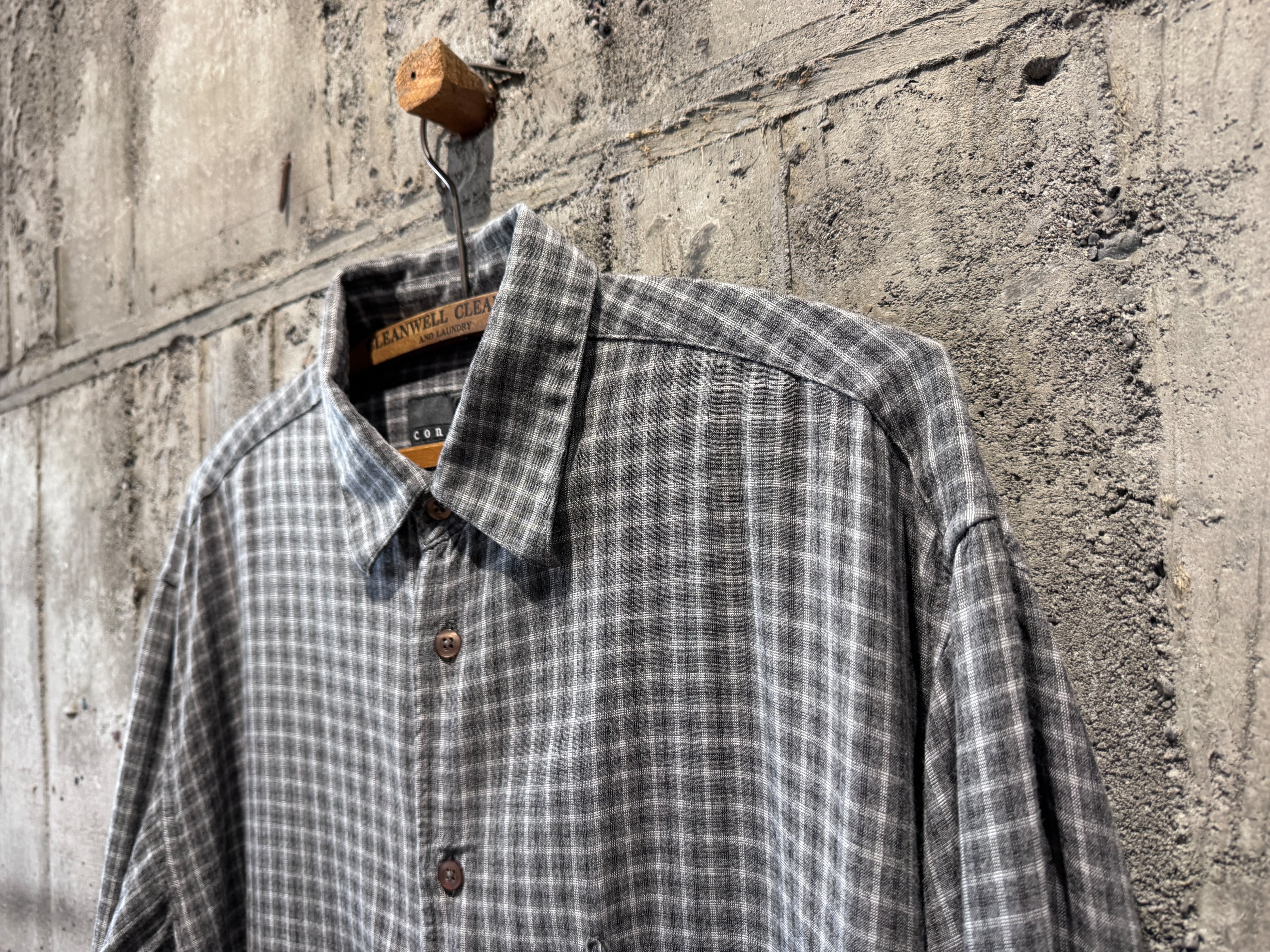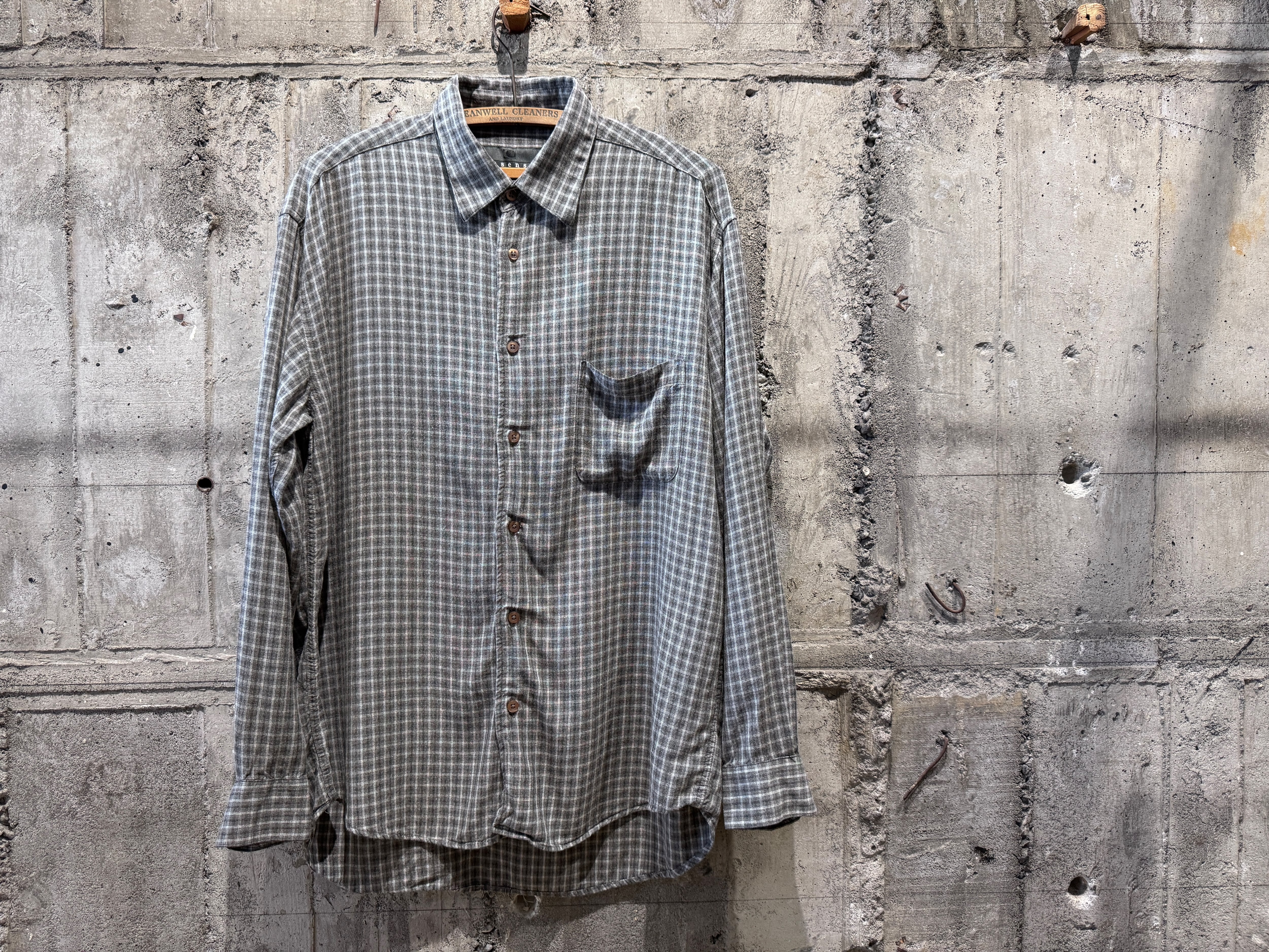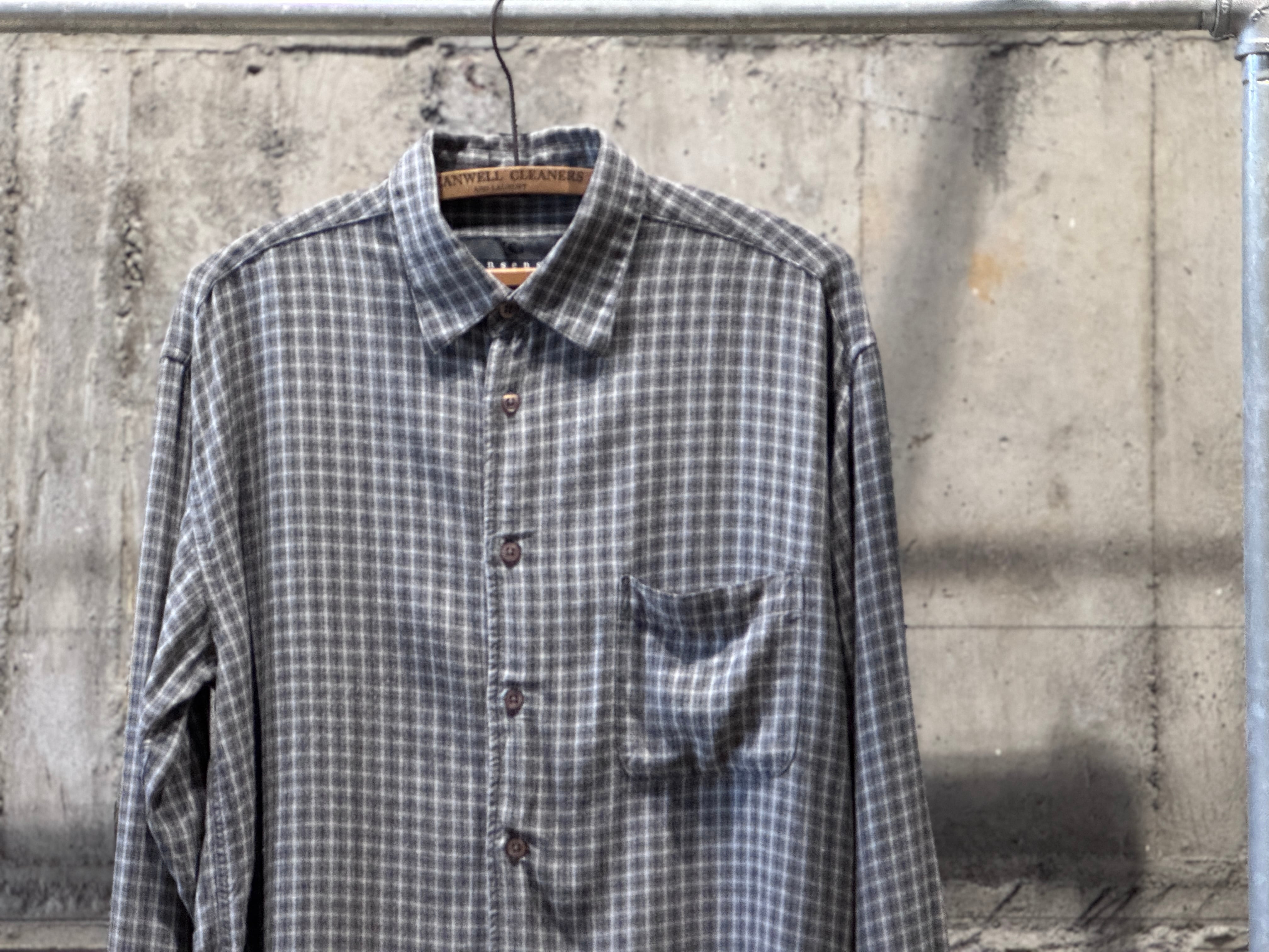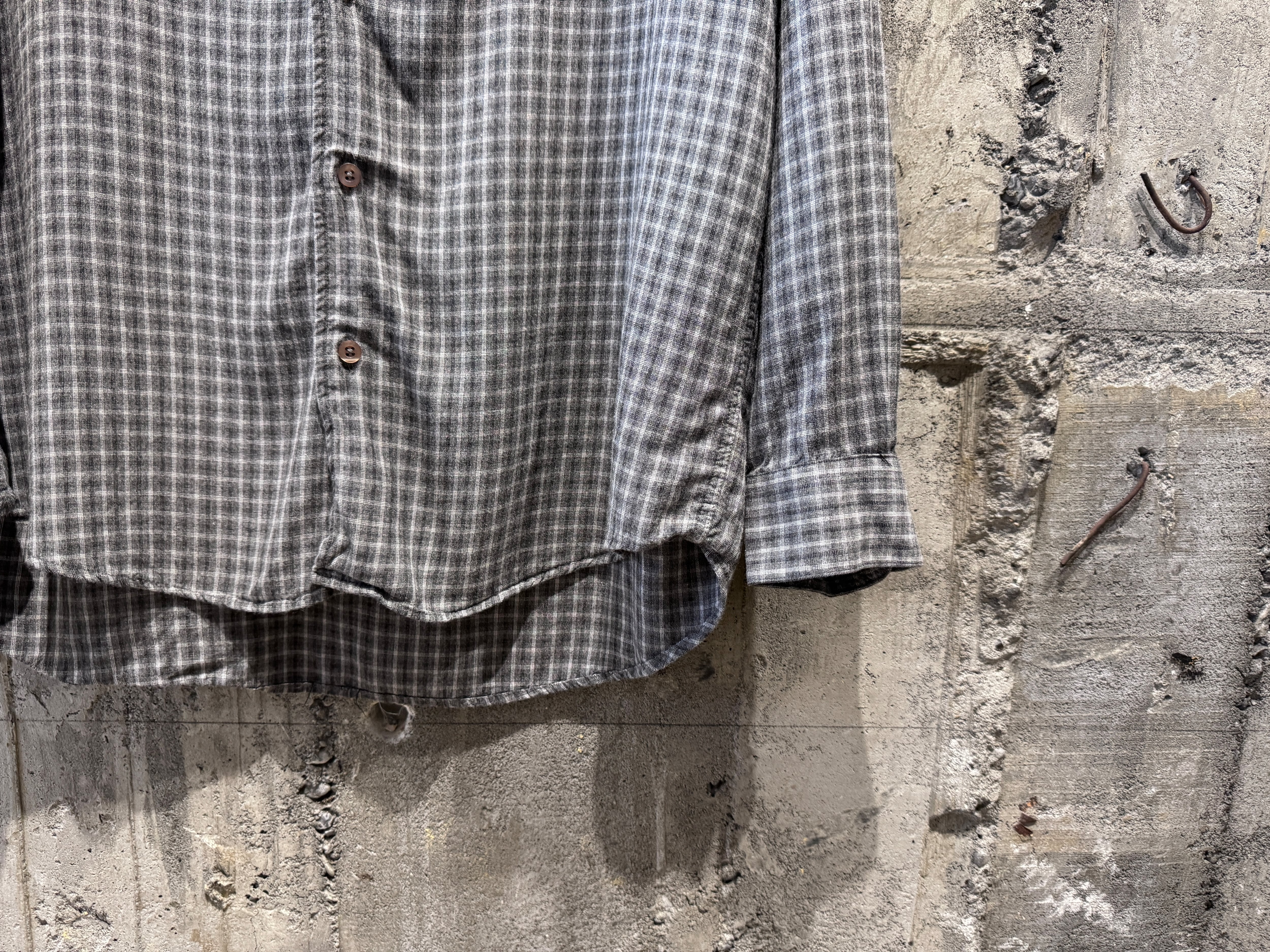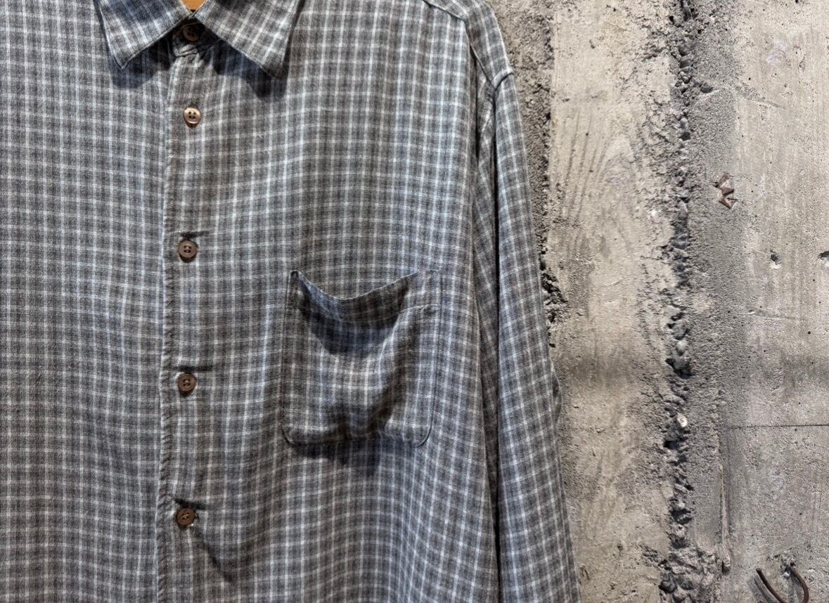 コチラは素材表記タグがないですが、レーヨンならではのサラッとした肌触りが良く、ドレープ感のあるモダンな生地感。落ち着いたトーンのグレーベースなチェックの配色も良い。