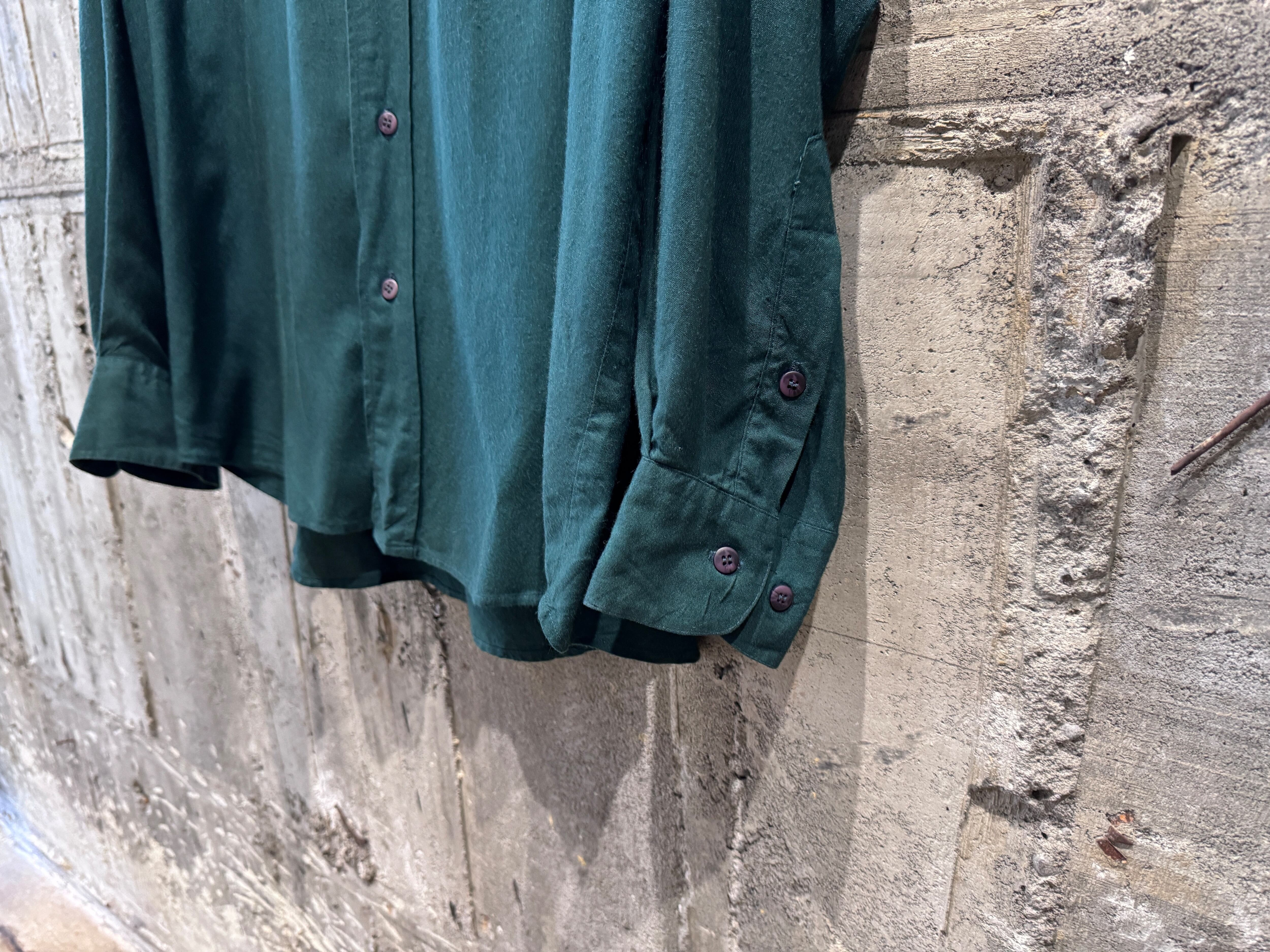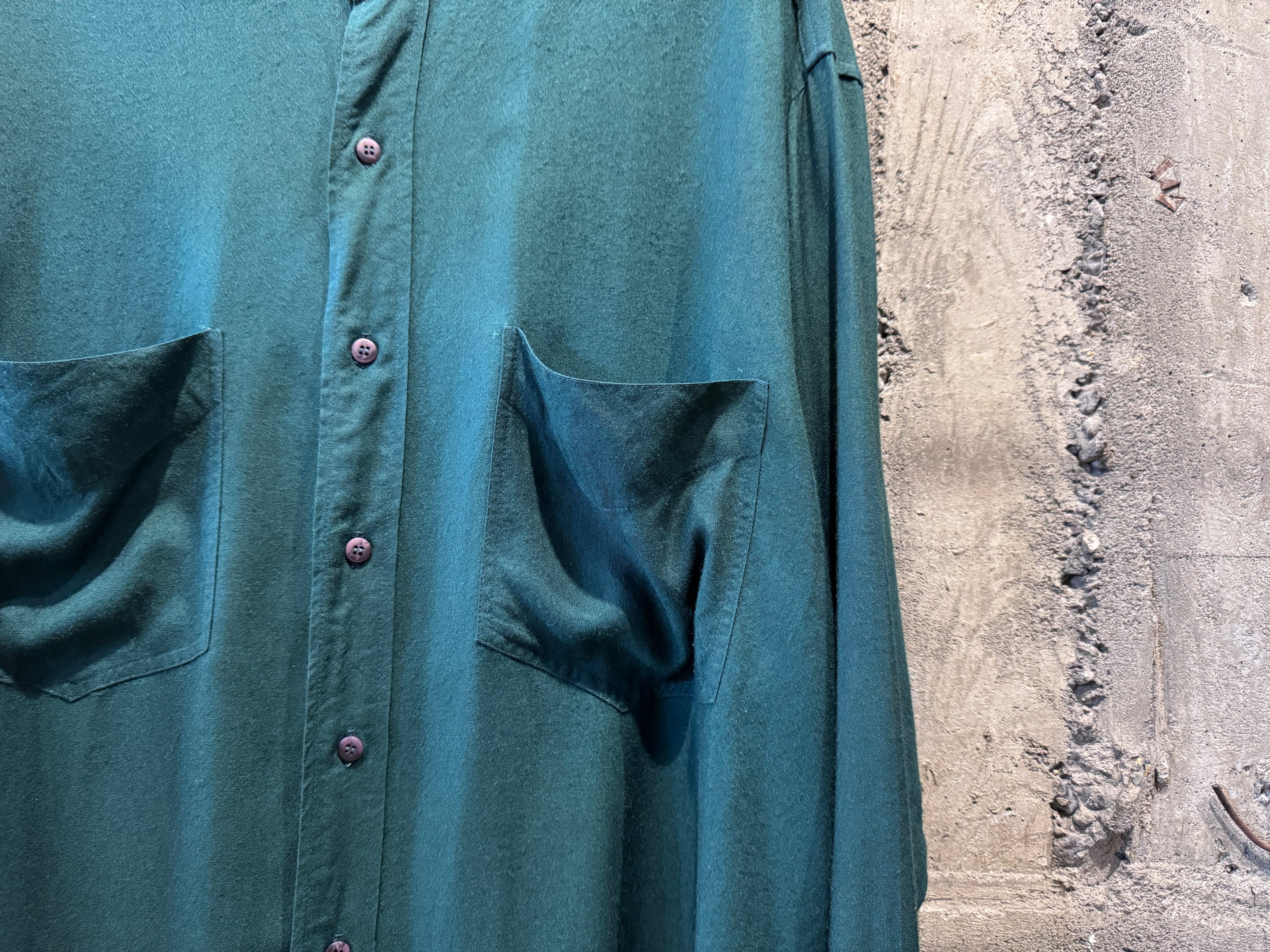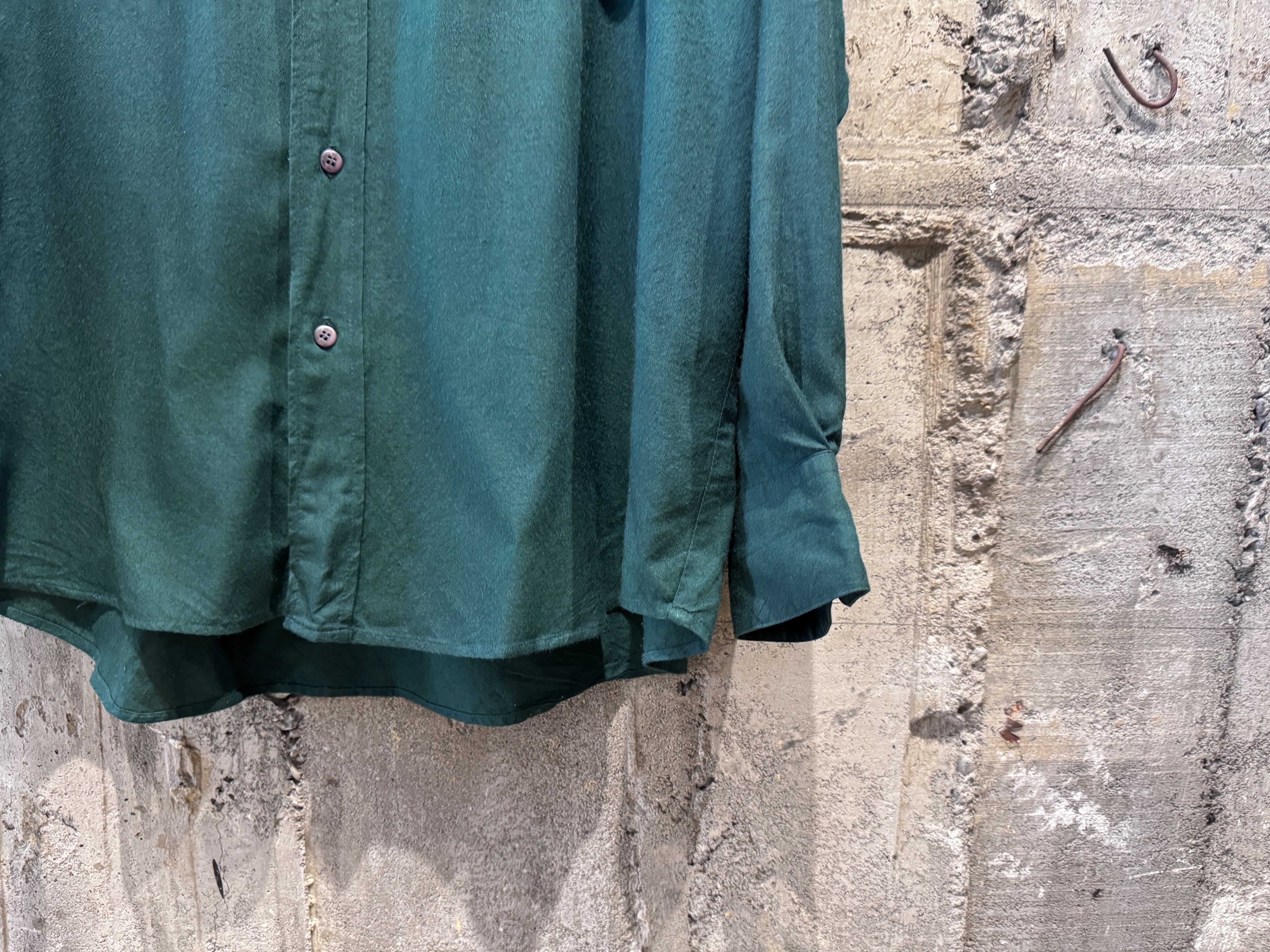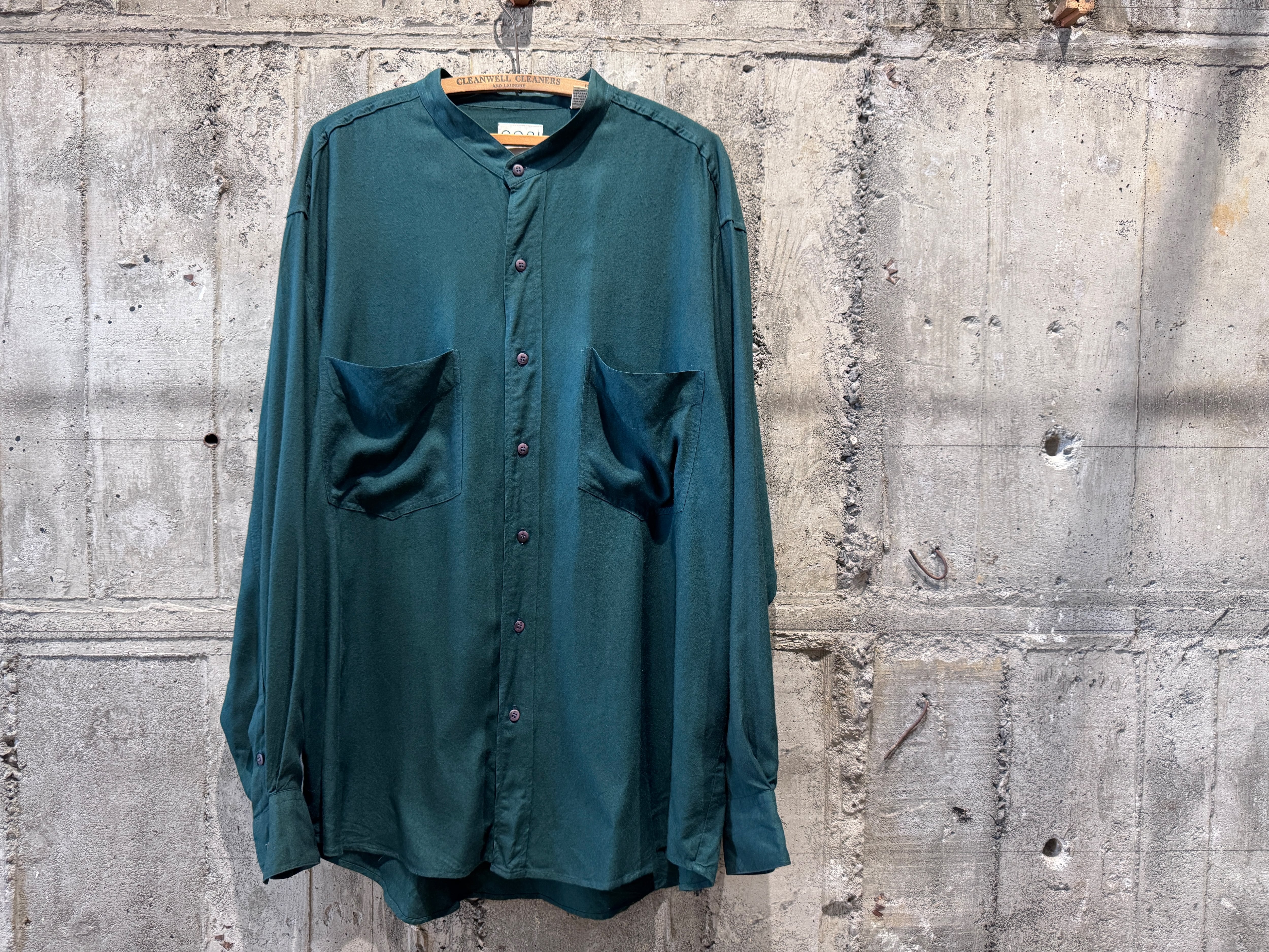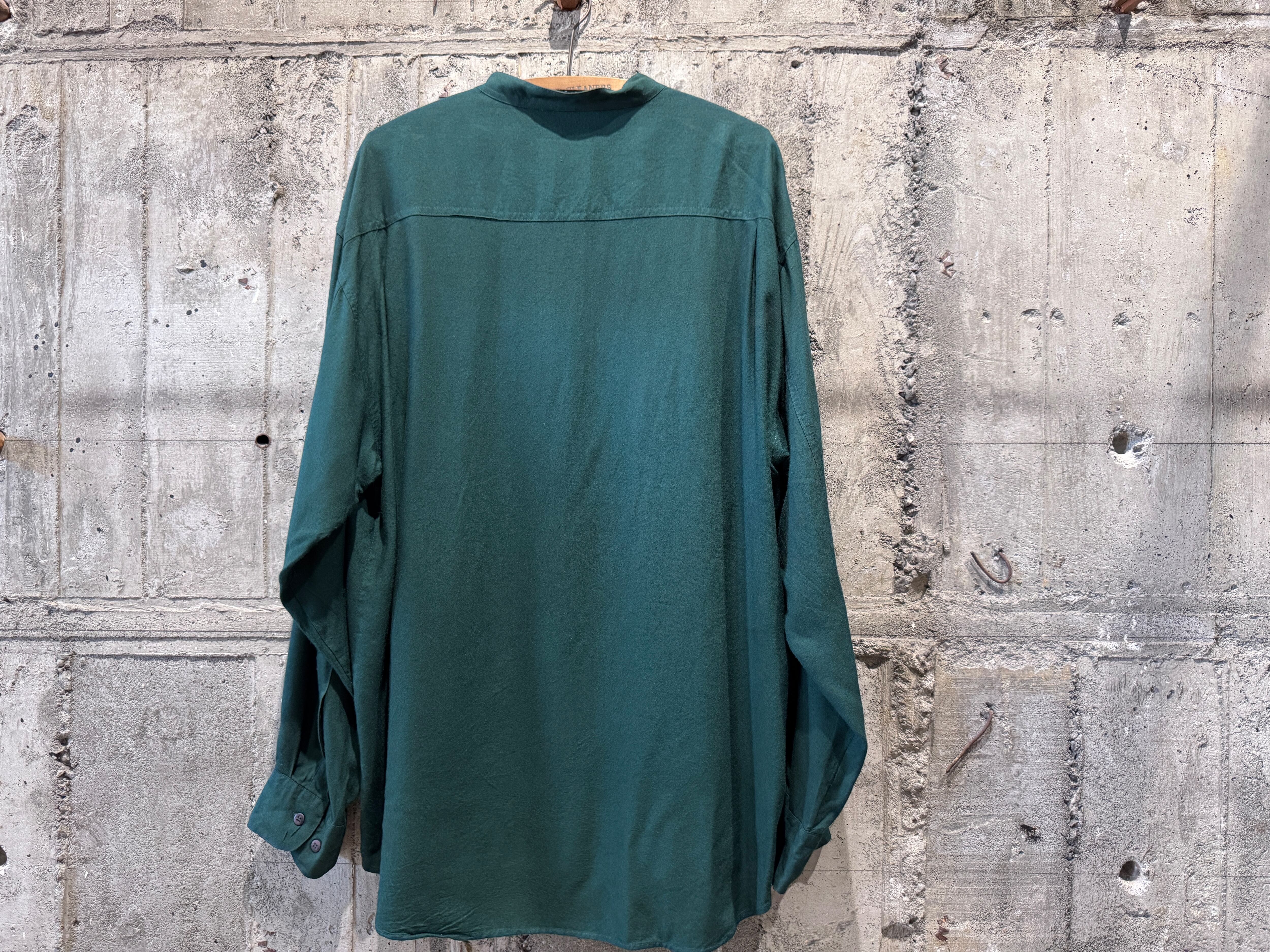 テロッとしたレーヨン生地のバンドカラーシャツ。