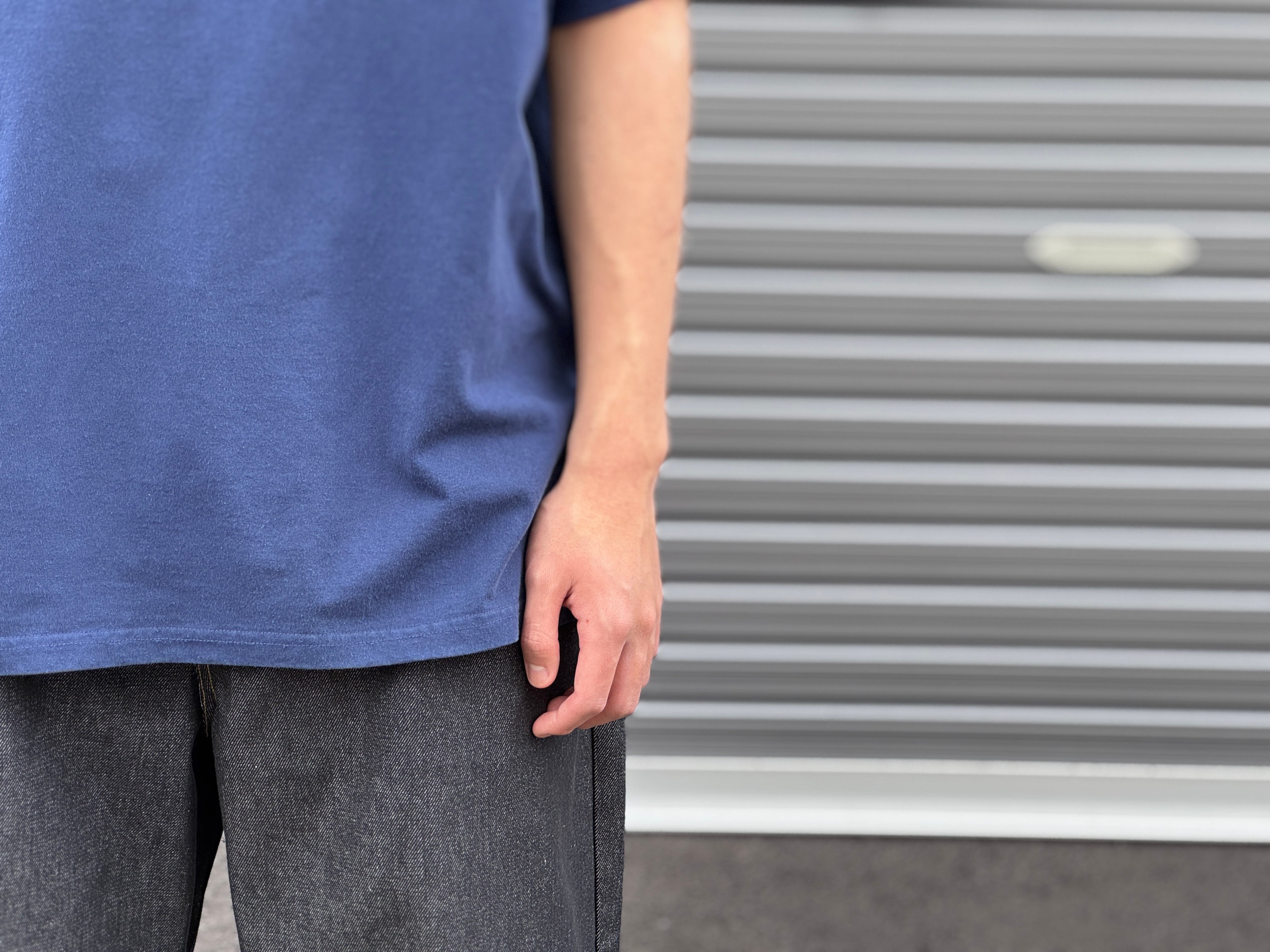 肉厚な7オンス天竺素材を使用し、太めの衿リブと広めの身幅、若干短めに設定した丈感が特徴。