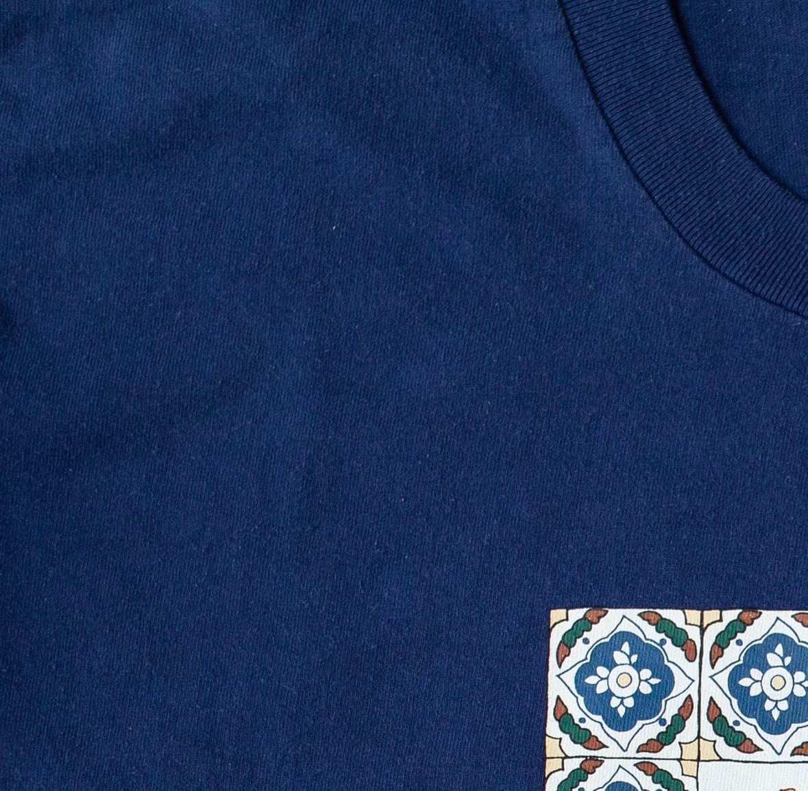 色数は豊富でも派手すぎず、6色刷りのシルクスクリーンで奥行きと深みを表現。ピグメント染めのボディに自然に馴染む配色が魅力の一枚。