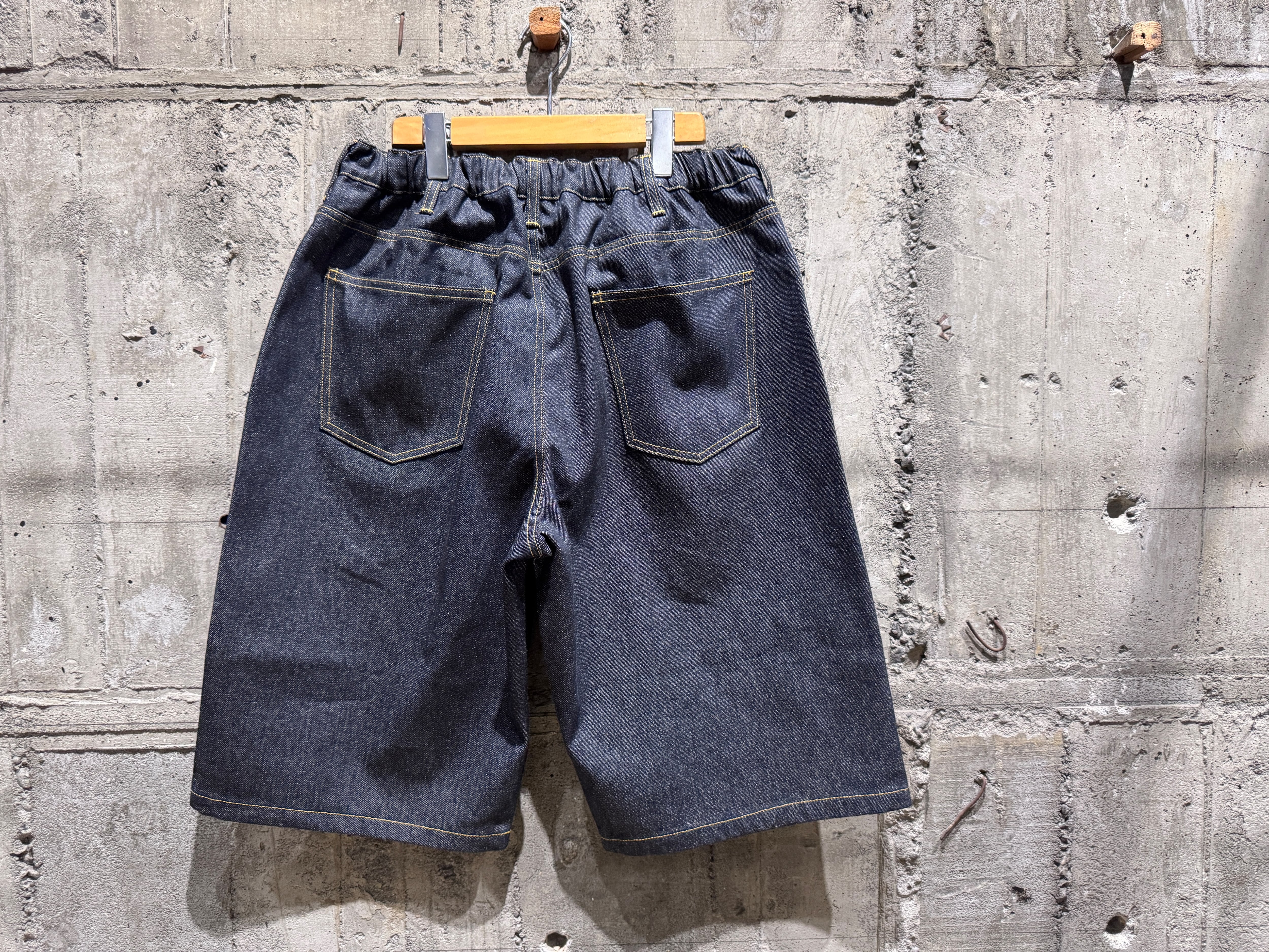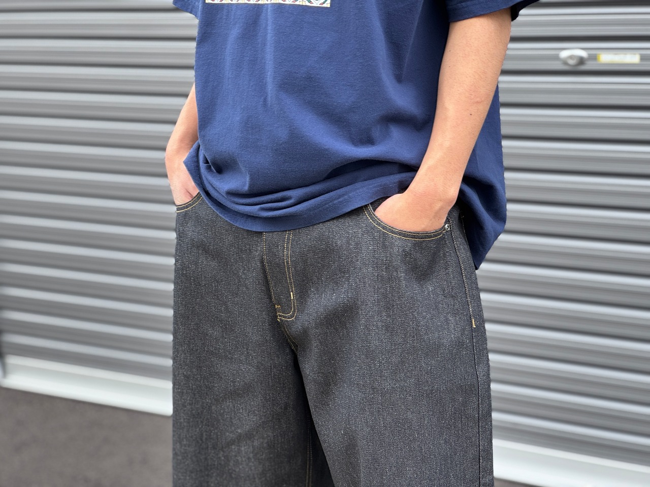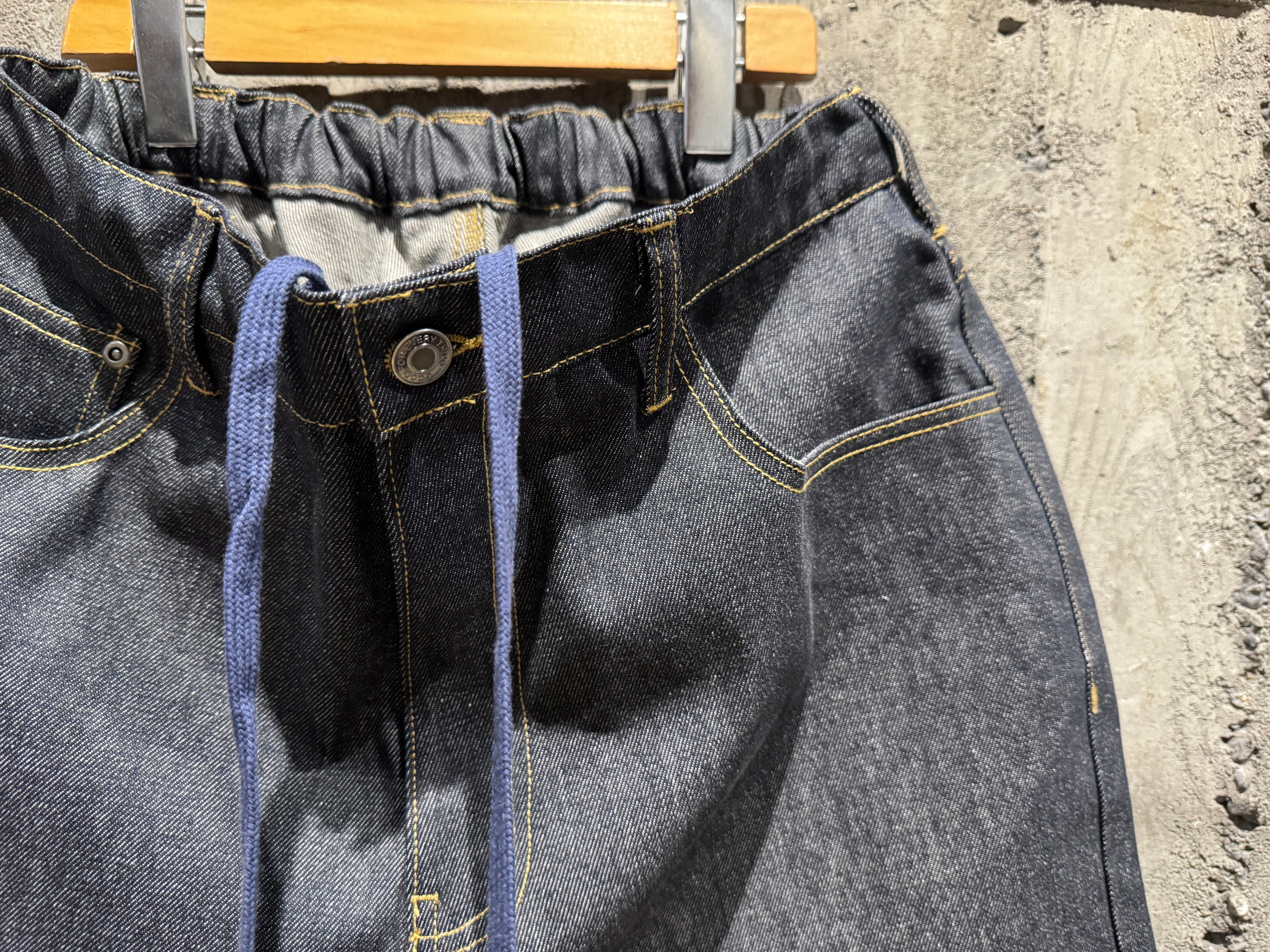 程よい11オンス、ワイドなシルエット。ウエストはイージーパンツ仕様でストレスフリーです。