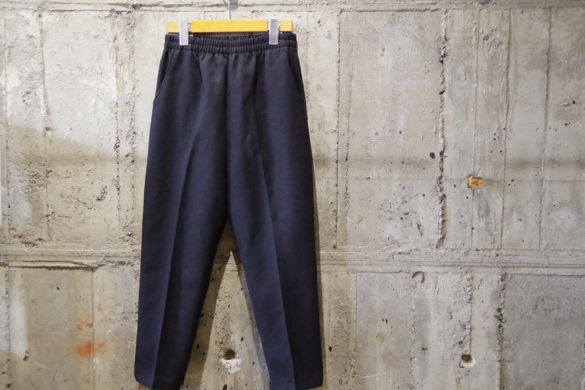 サラッとコシのあるジャージ生地のような生地感。センタープレスの入ったテーパードシルエットです。裾の内側は珍しいジップ仕様。