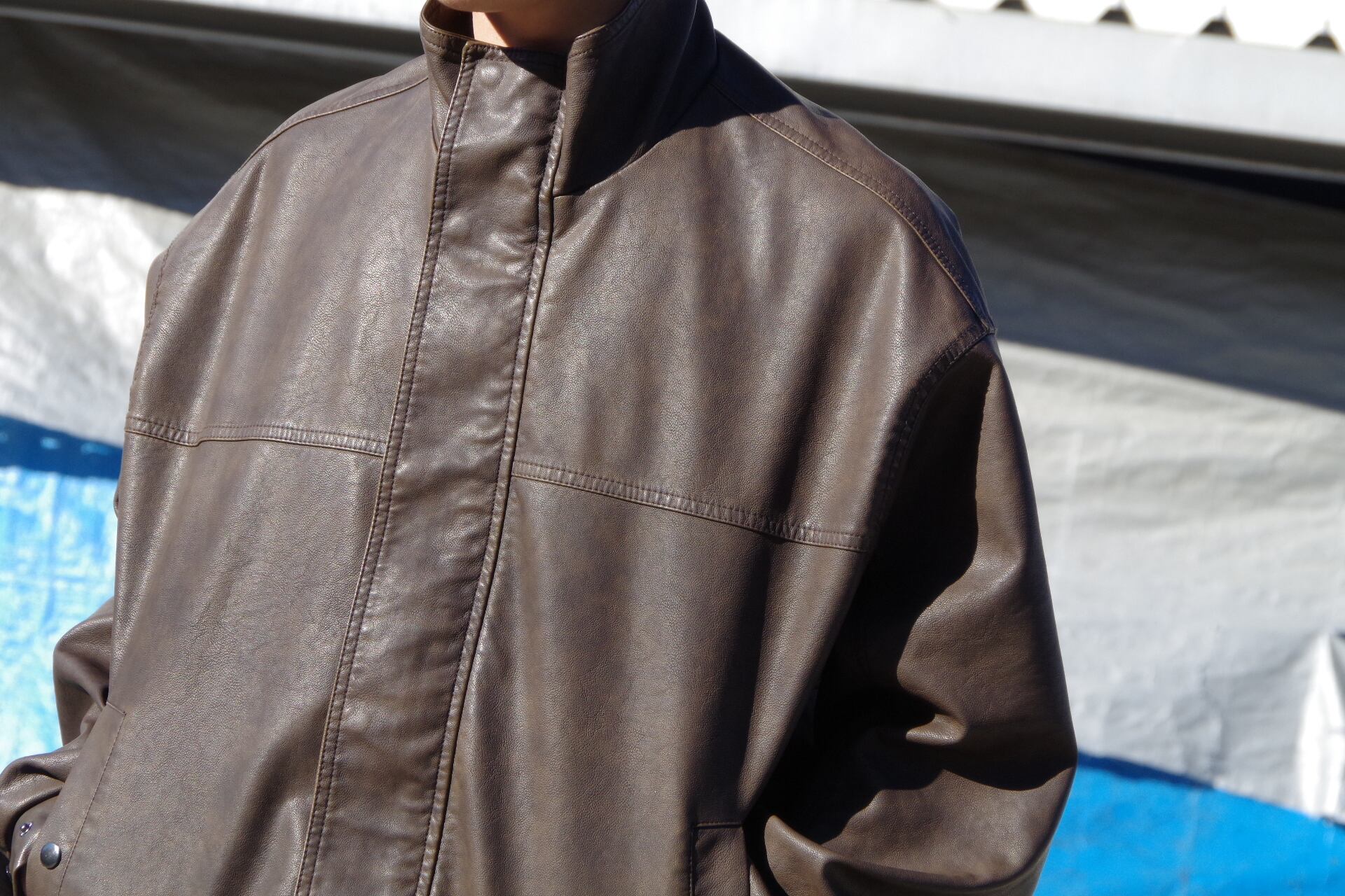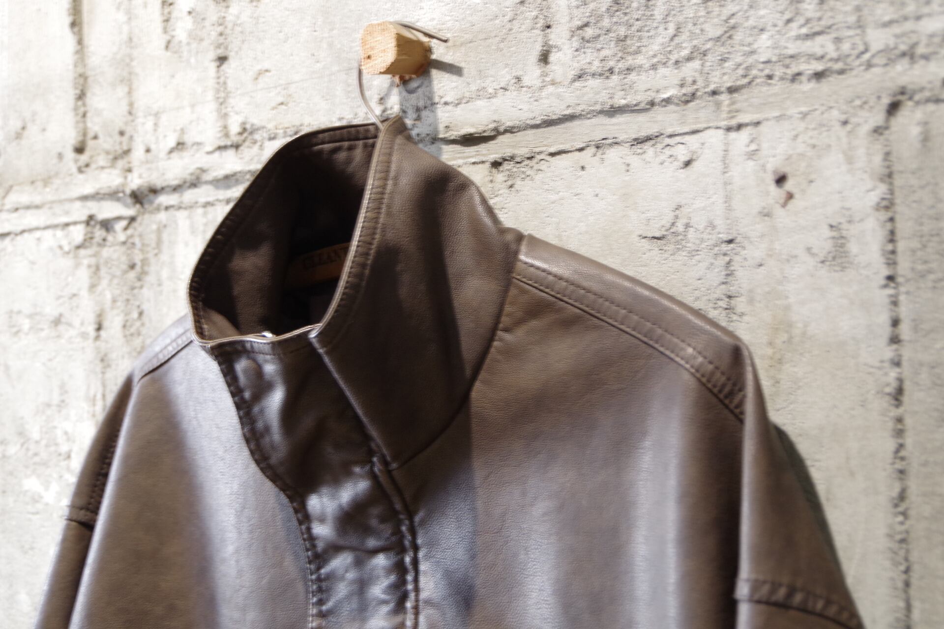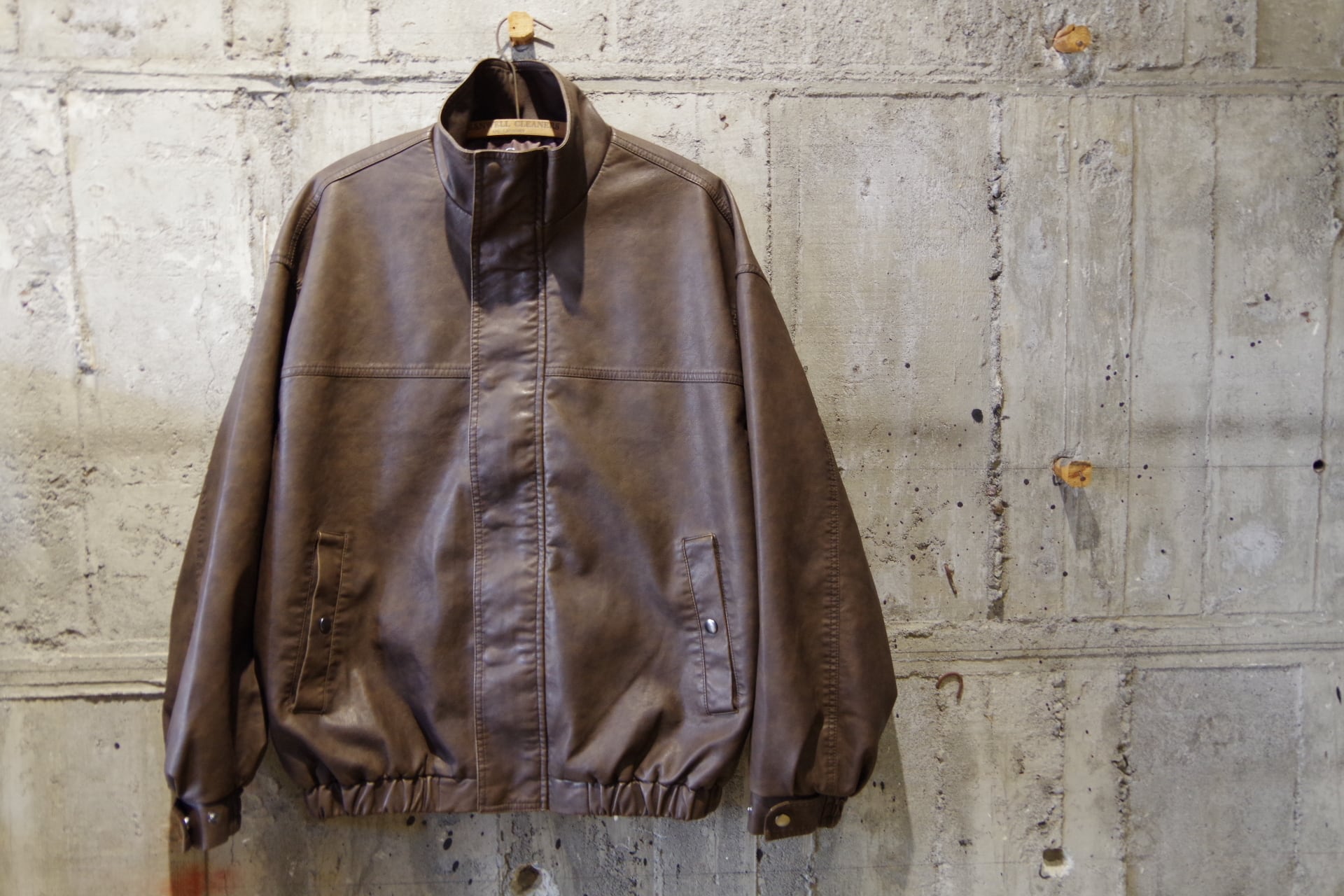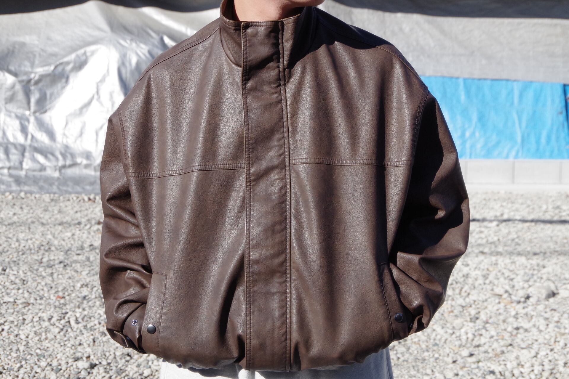 コチラはしっとりとしたレザータッチな生地感のスタンドブルゾン。ウォッシュ加工による独特な色落ち感のある珍しいフェイクレザー生地を使用。ウィンドウシールド仕様でポケットはスナップ。