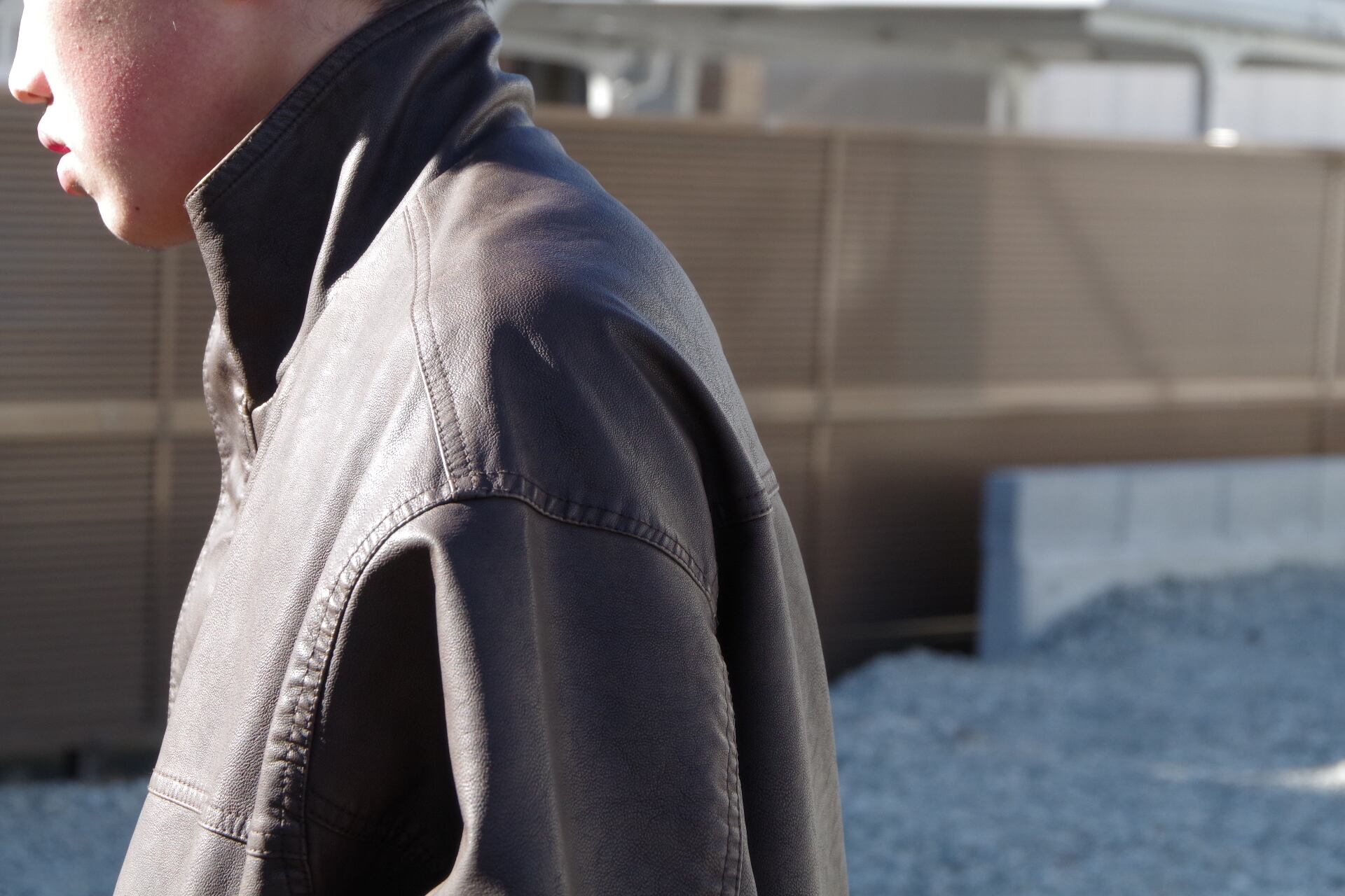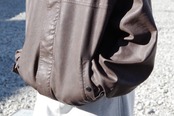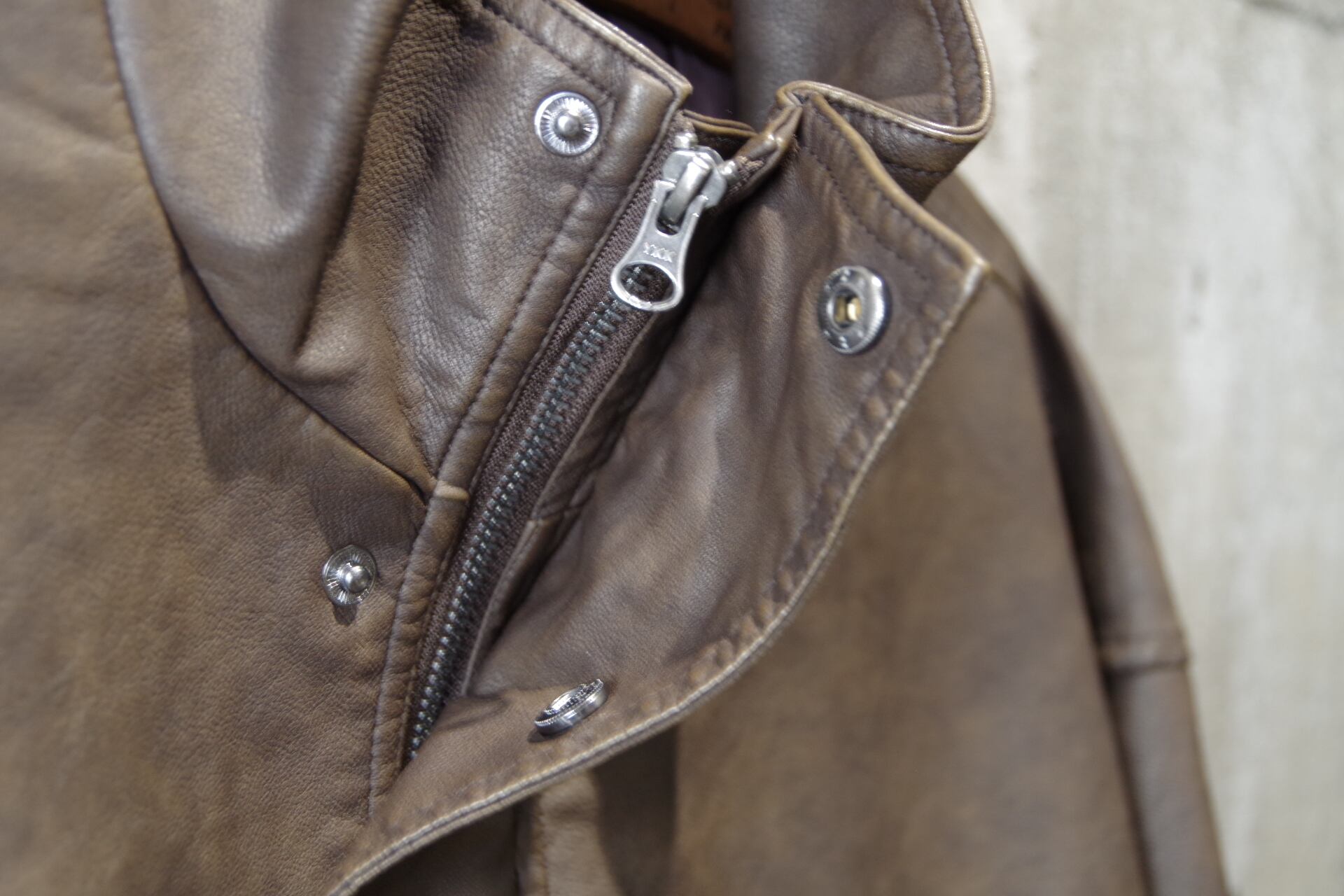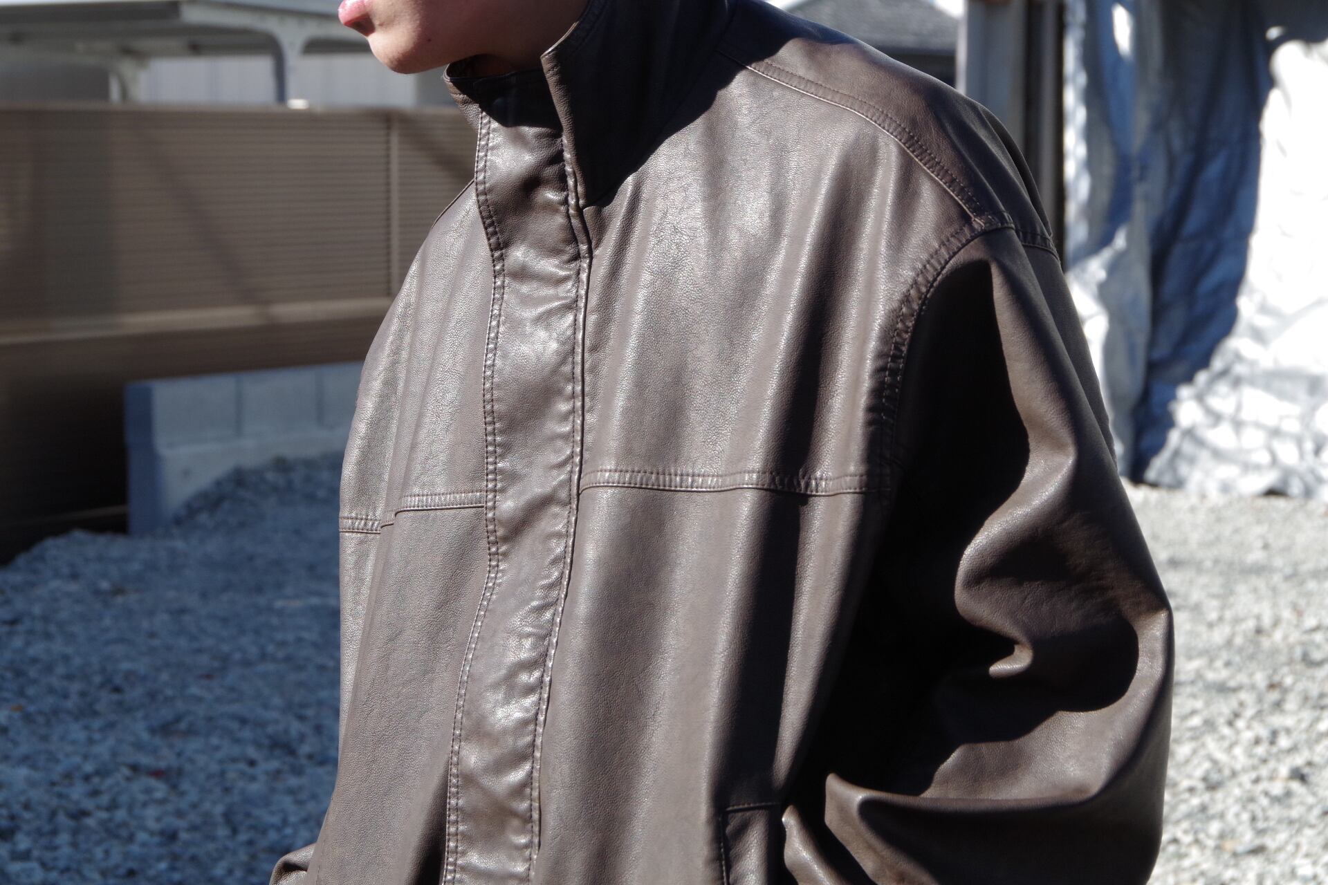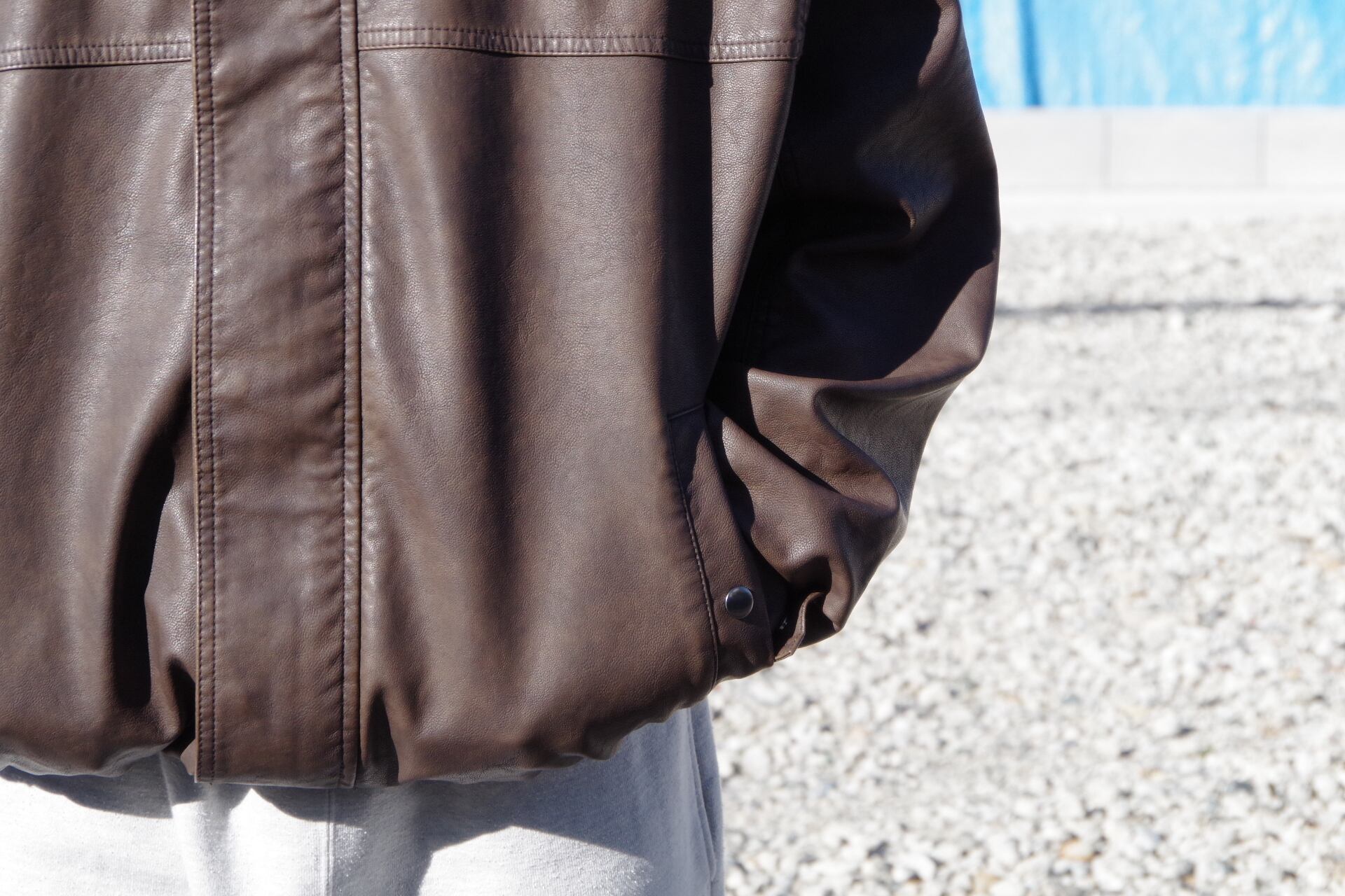 コチラはしっとりとしたレザータッチな生地感のスタンドブルゾン。ウォッシュ加工による独特な色落ち感のある珍しいフェイクレザー生地を使用。ウィンドウシールド仕様でポケットはスナップ。