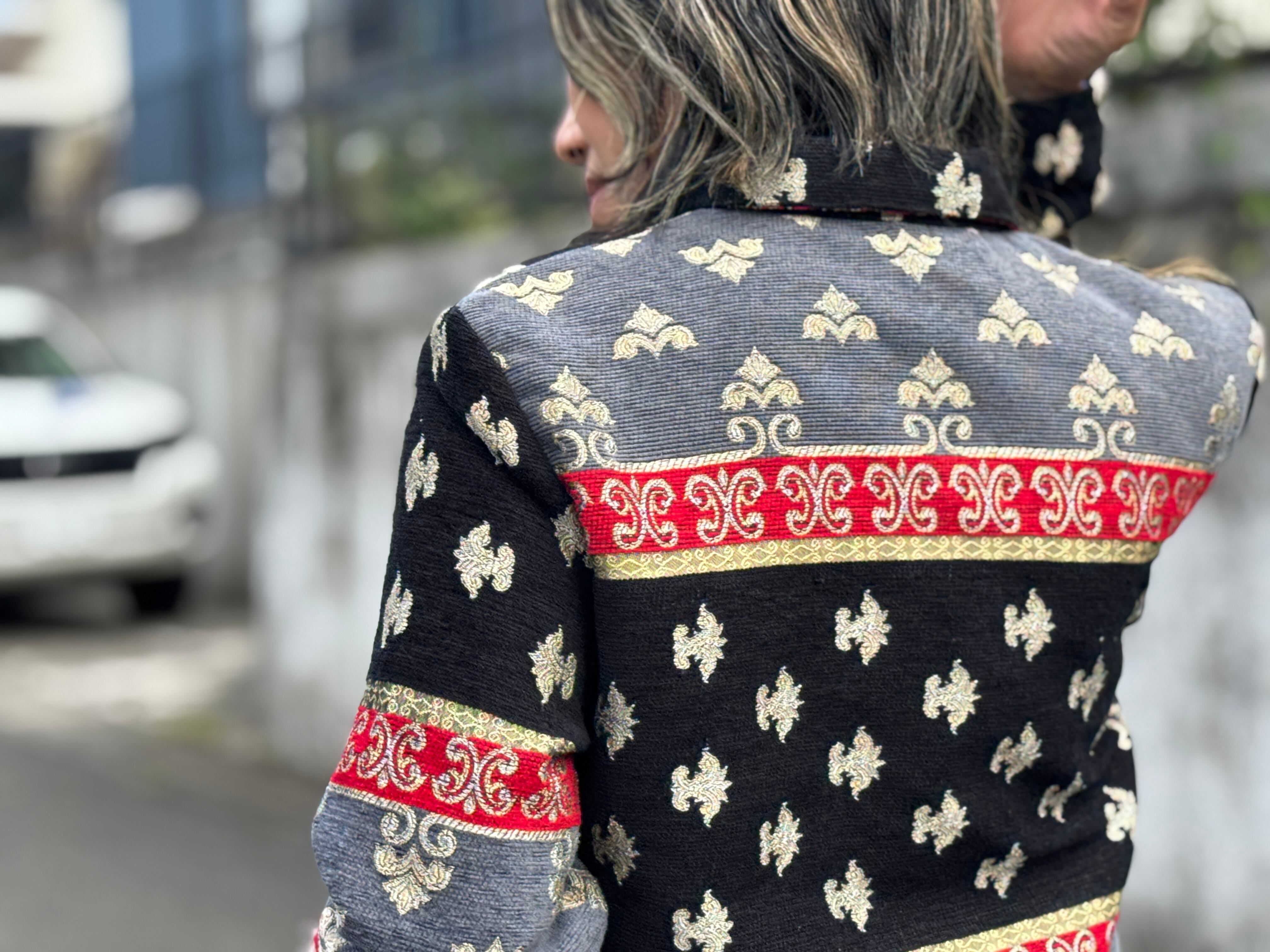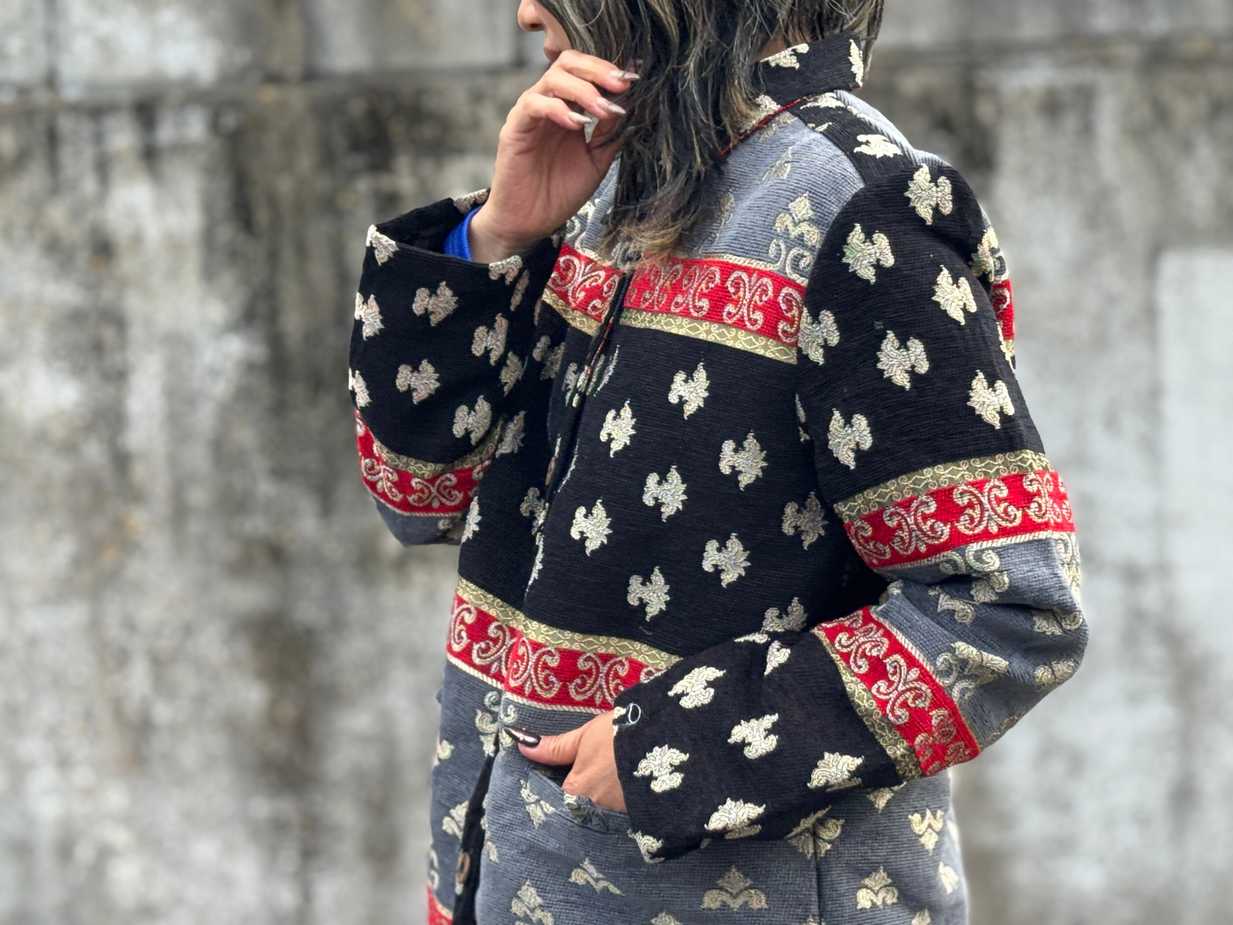 ブラックベースなオリエンタルなパターン、ウッドボタン、前身頃にポケットが配してあります。